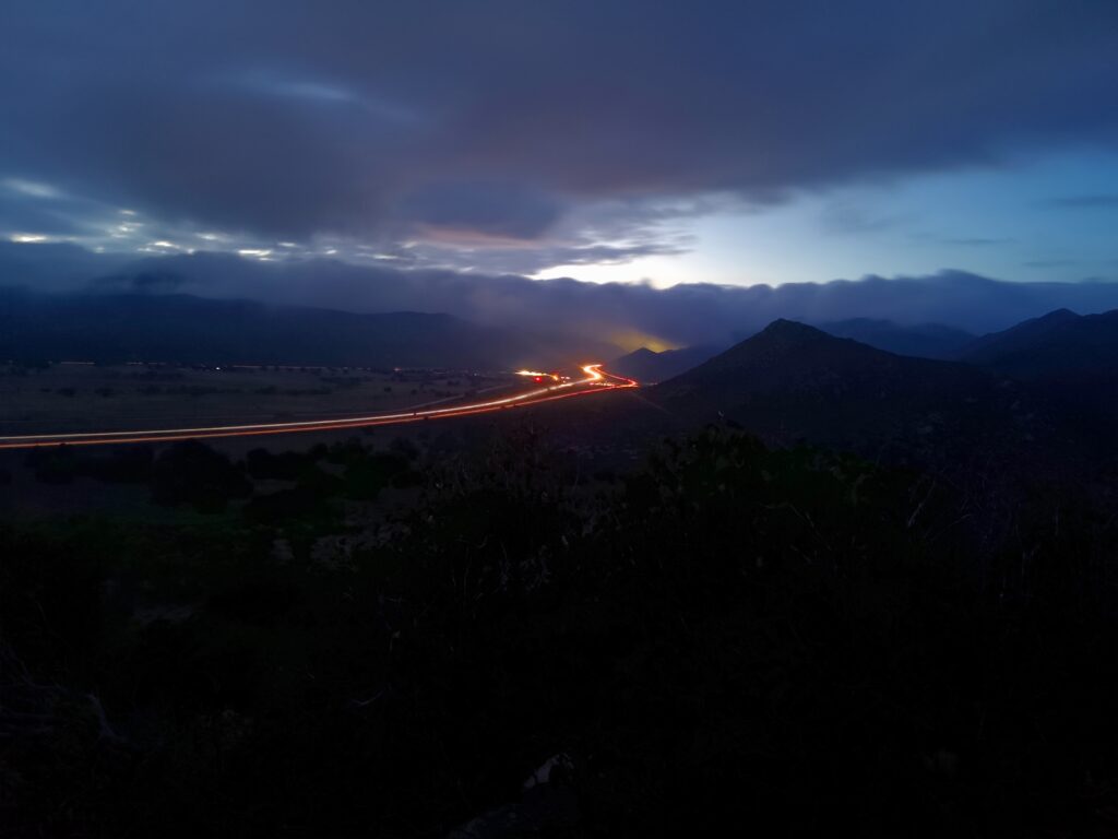 Nachdem wir noch ein ganzes Stück weiter gegangen sind, wobei wir die Zubringerstraße zum Monument kreuzten, schlugen wir Bob auf einem Hügel mit Blick über Highway 8 auf.