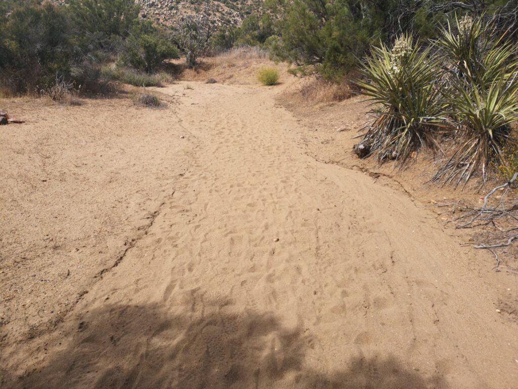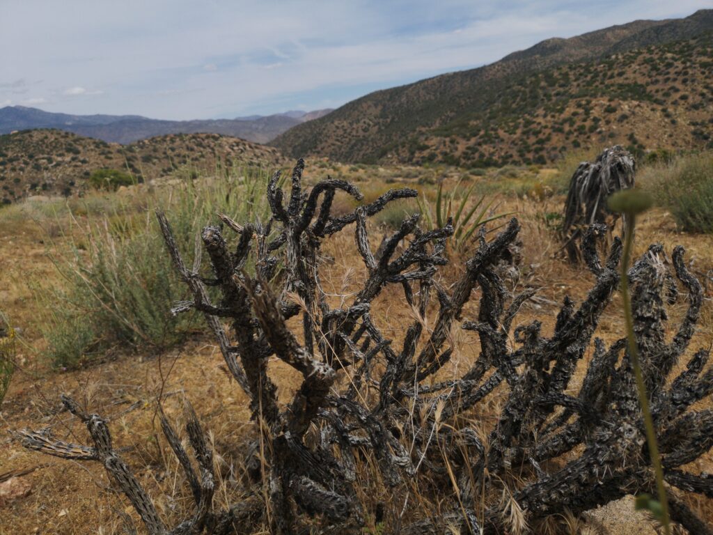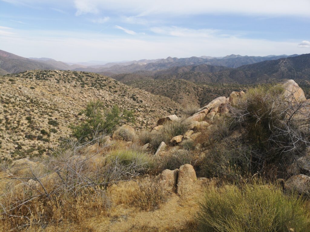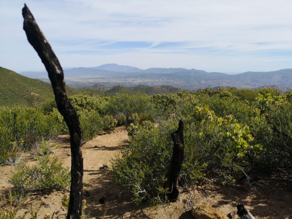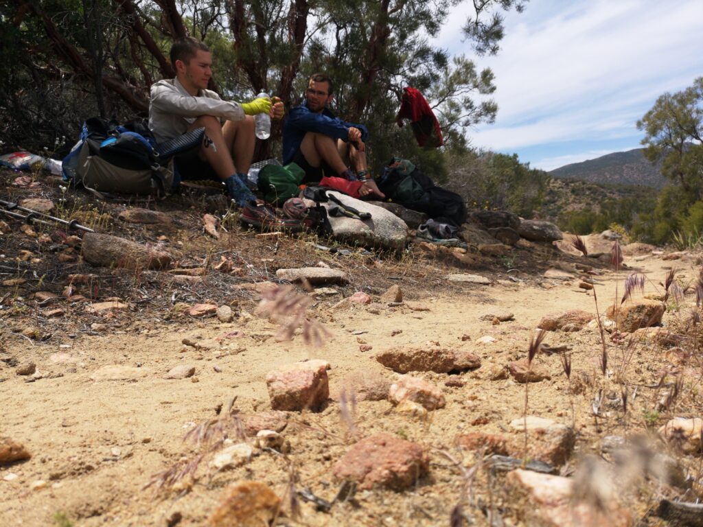 Mittags haben wir unter einem Busch Pause gemacht. Nach einiger Zeit kam „Schnitzel“ hinzu. Eine Würzburgerin, mitte 40. Der PCT ist ihr letzter Halt einer Weltreise. Hier haben wir zum ersten Mal die weiße Spitze des Mount San Jacinto am Horizont gesehen, somit war Schnee natürlich erstes Gesprächsthema. Wir redeten jedoch über die Sierras, welche erst in 600 Meilen beginnen und hatten keine Ahnung, wie bald wir uns schon wieder ernsthaft mit diesem Thema auseinander setzen müssten.