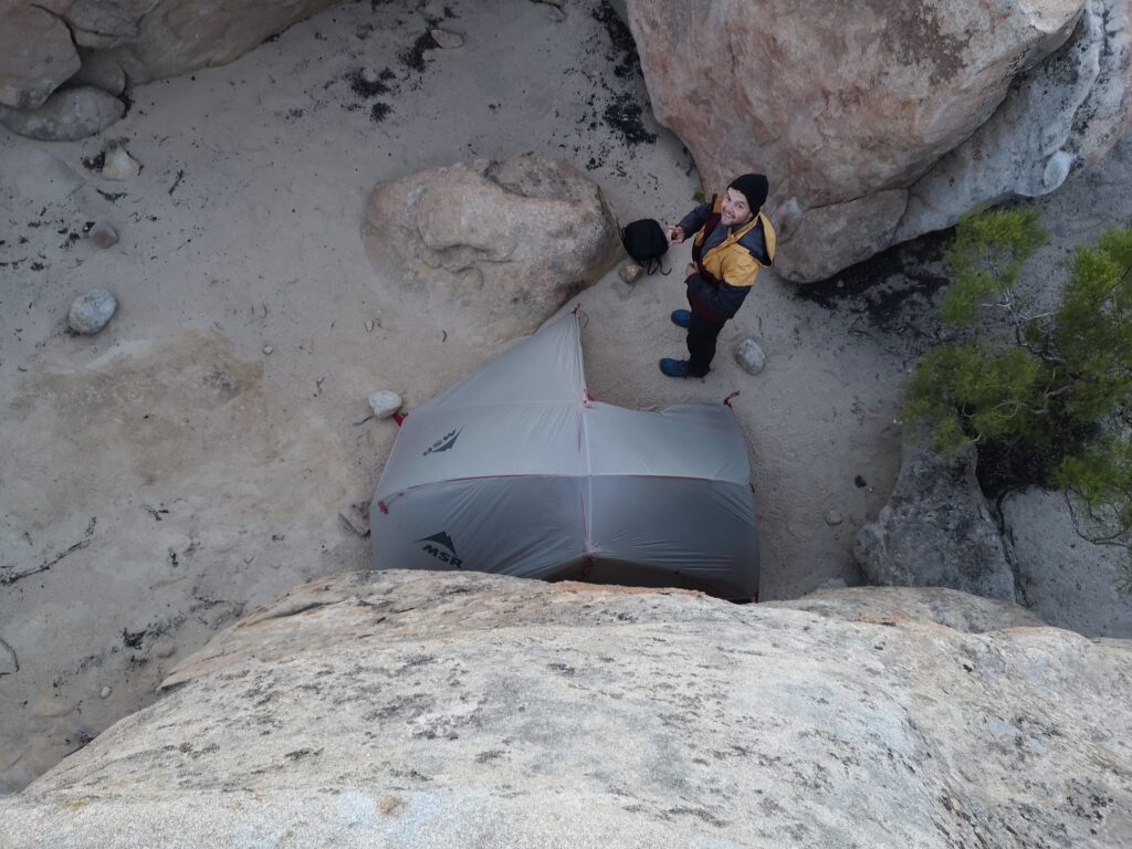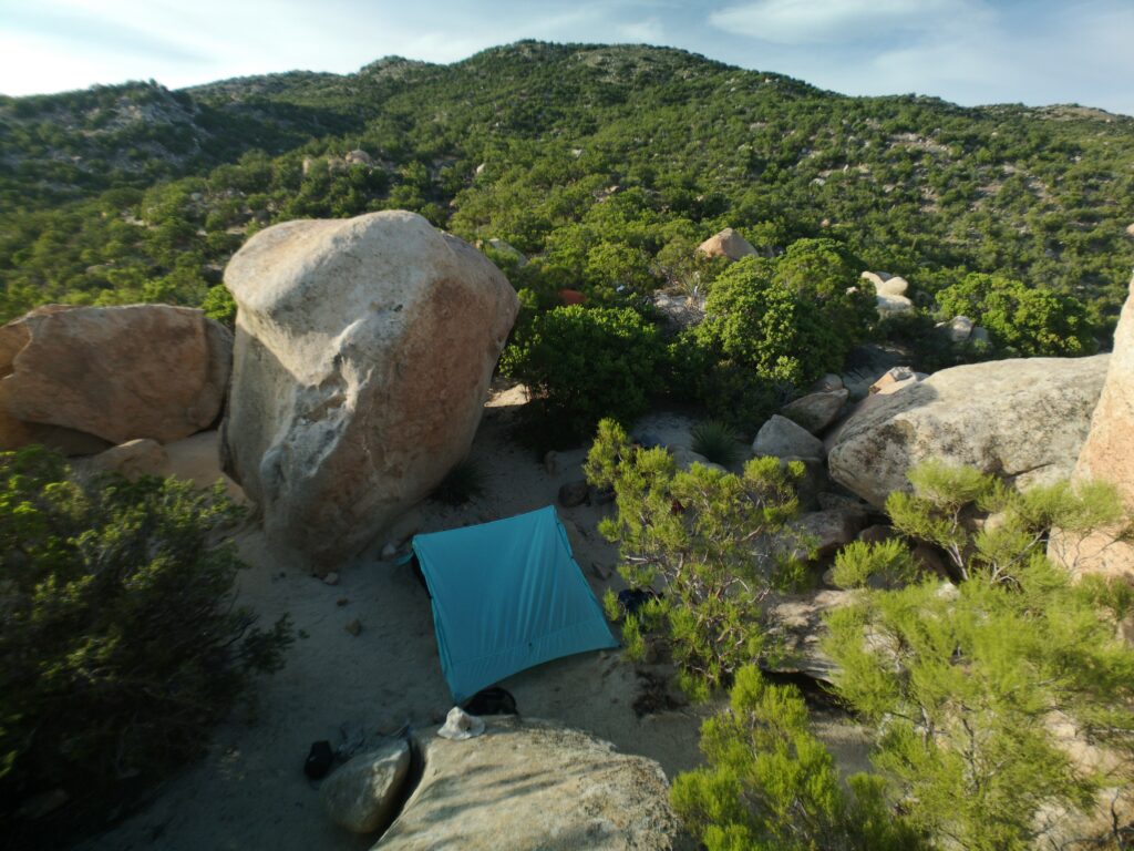 Abends bauten wir Bob zwischen großen Felsen auf, kurz darauf kam Tomato vorbei und sicherte sich auch noch einen Platz bei uns. Es gab Ramen-Bomb zum Abendessen, das ist Ramen zusammen mit einer Packung Mashed Potatoes. Der Sonnenuntergang war leider nicht sonderlich spektakulär, es waren einfach zu viele Wolken am Horizont.