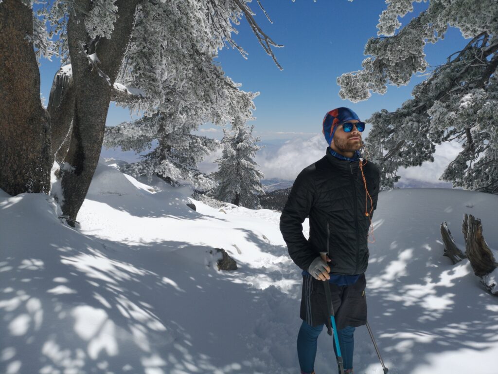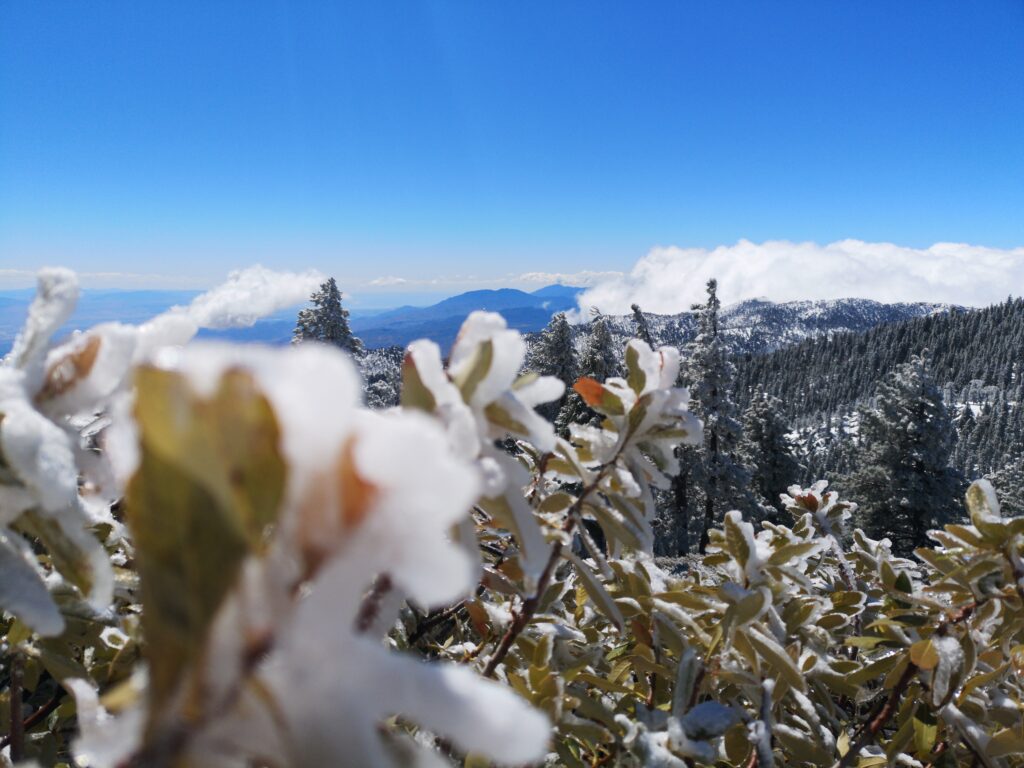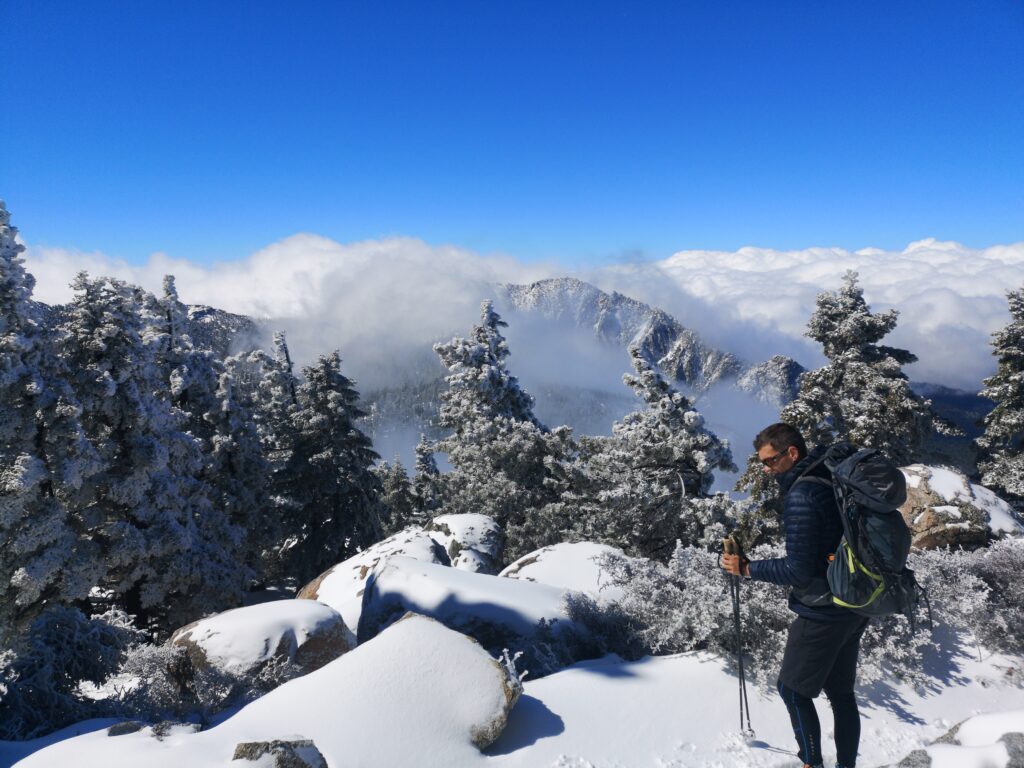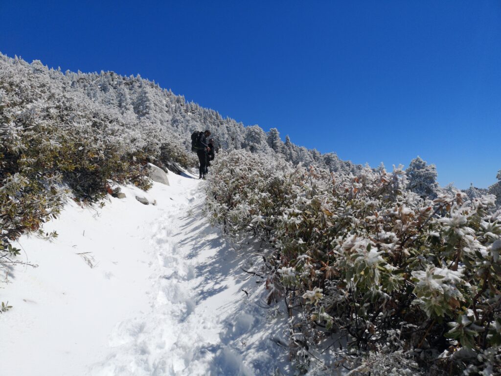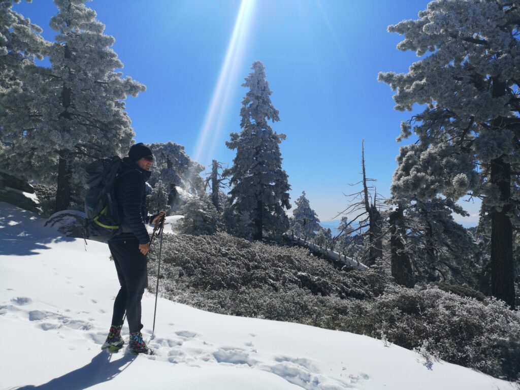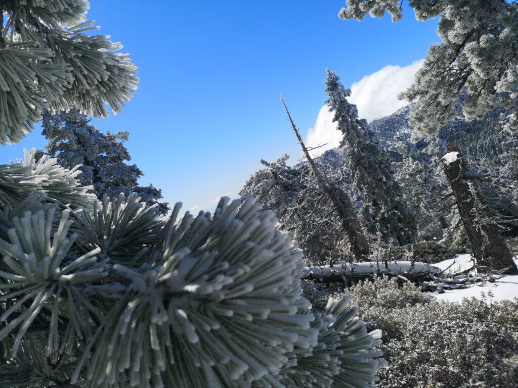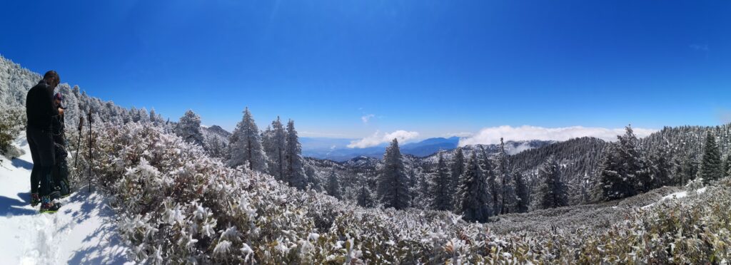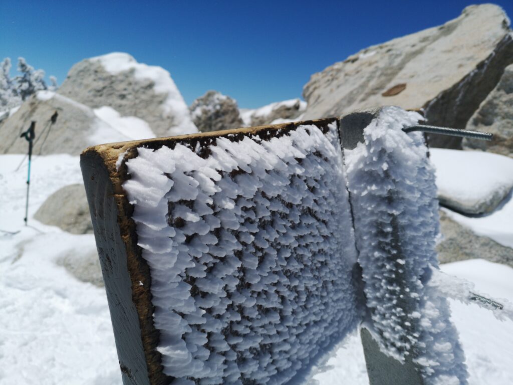 Nach einiger Zeit kam jedoch die Sonne durch. Wir waren damit über den Wolken. Es lagen mehrere Zentimeter Neuschnee und die Bäume waren von einer Eisschicht überzogen, die in der Sonne leuchtete.