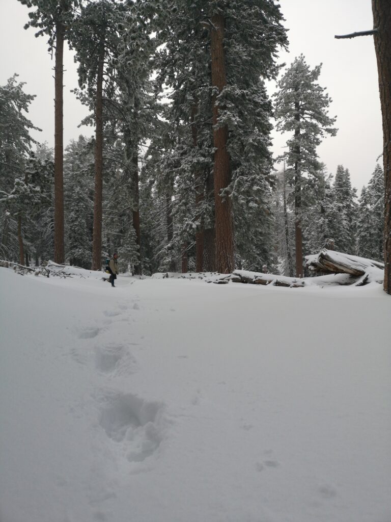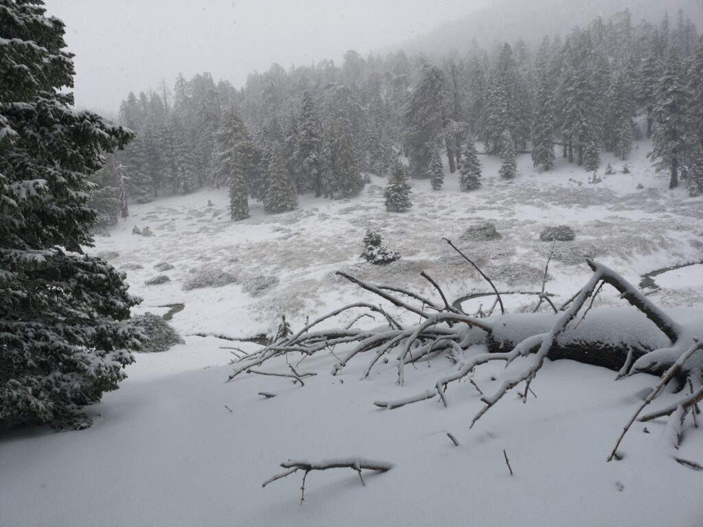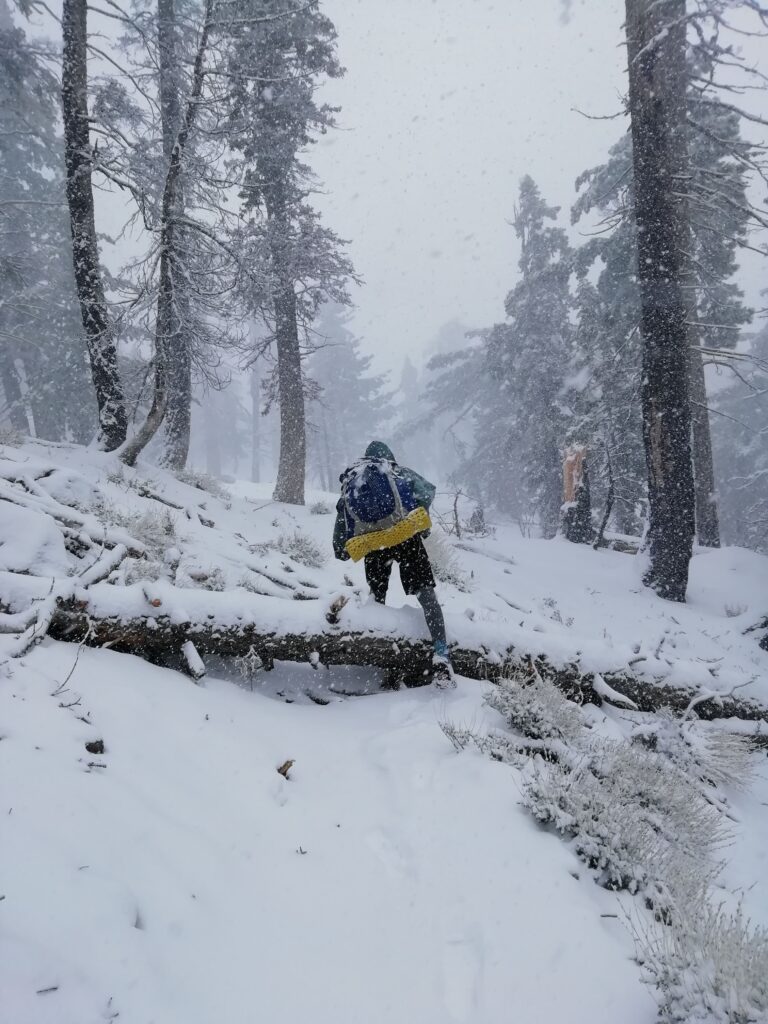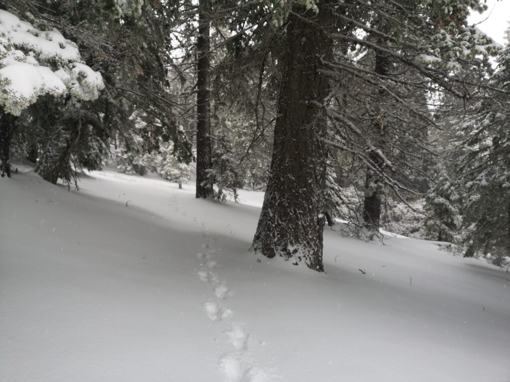 Als wir höher kamen, wurde aus dem Hagel Schnee. Das Schneetreiben war so intensiv, dass sich meine Brille zusetzte und ich nicht mehr viel sehen konnte. Wenig später liefen wir in 20-25 cm tiefem Schnee. Der Wald war wunderschön und die Bäume wurden immer größer. Wir haben Kaninchen-Spuren im frischen Schnee gefunden.