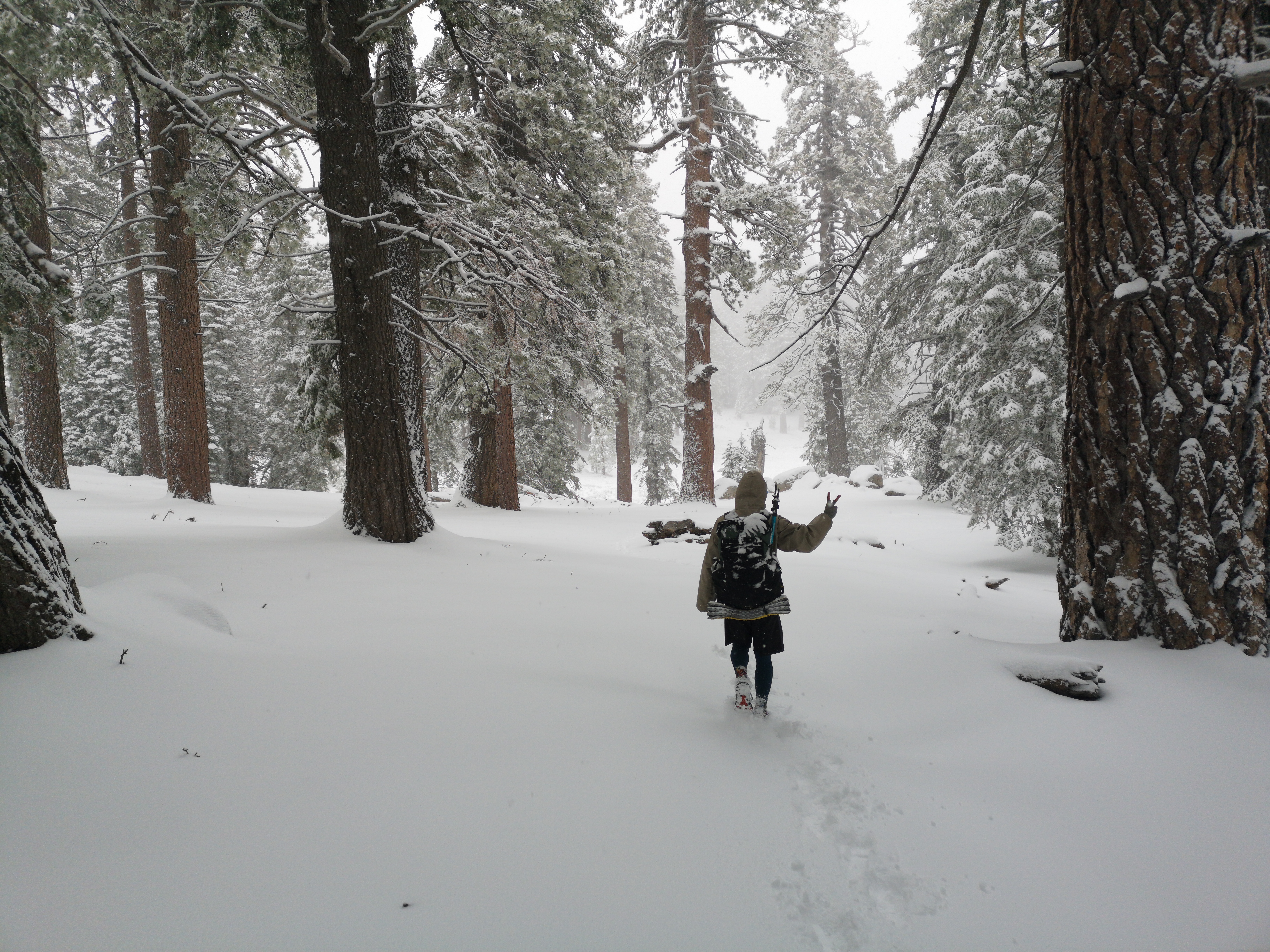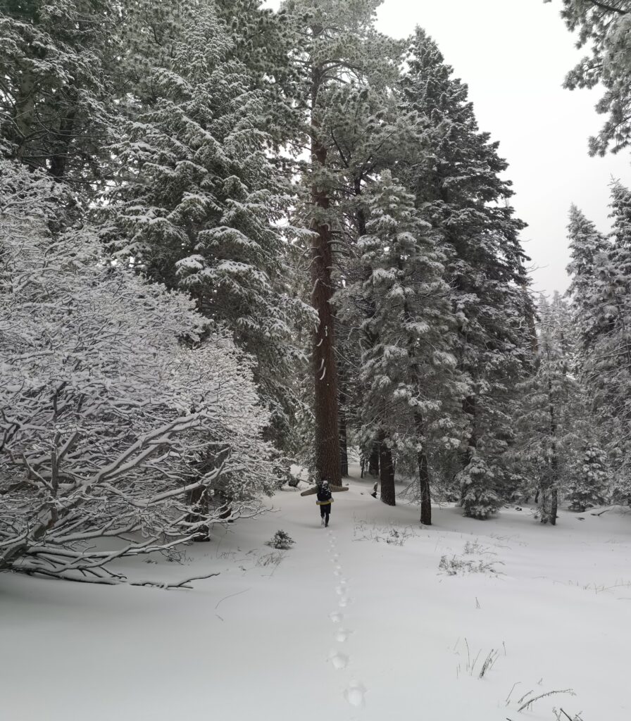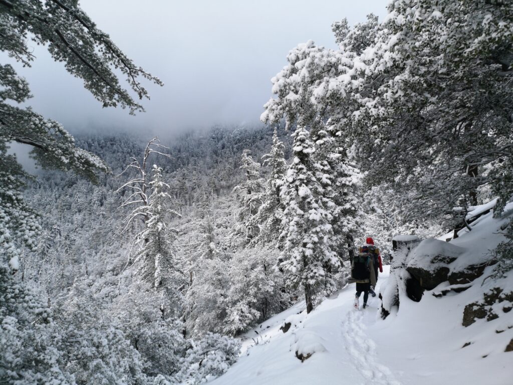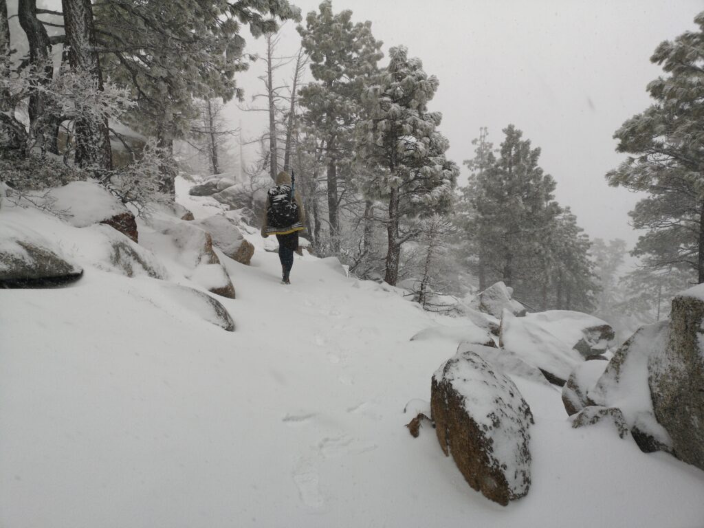Als wir höher kamen, wurde aus dem Hagel Schnee. Das Schneetreiben war so intensiv, dass sich meine Brille zusetzte und ich nicht mehr viel sehen konnte. Wenig später liefen wir in 20-25 cm tiefem Schnee. Der Wald war wunderschön und die Bäume wurden immer größer. Wir haben Kaninchen-Spuren im frischen Schnee gefunden.