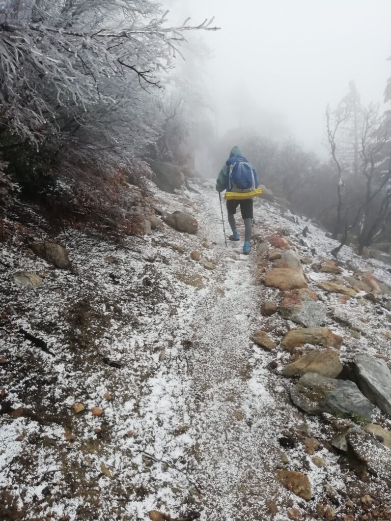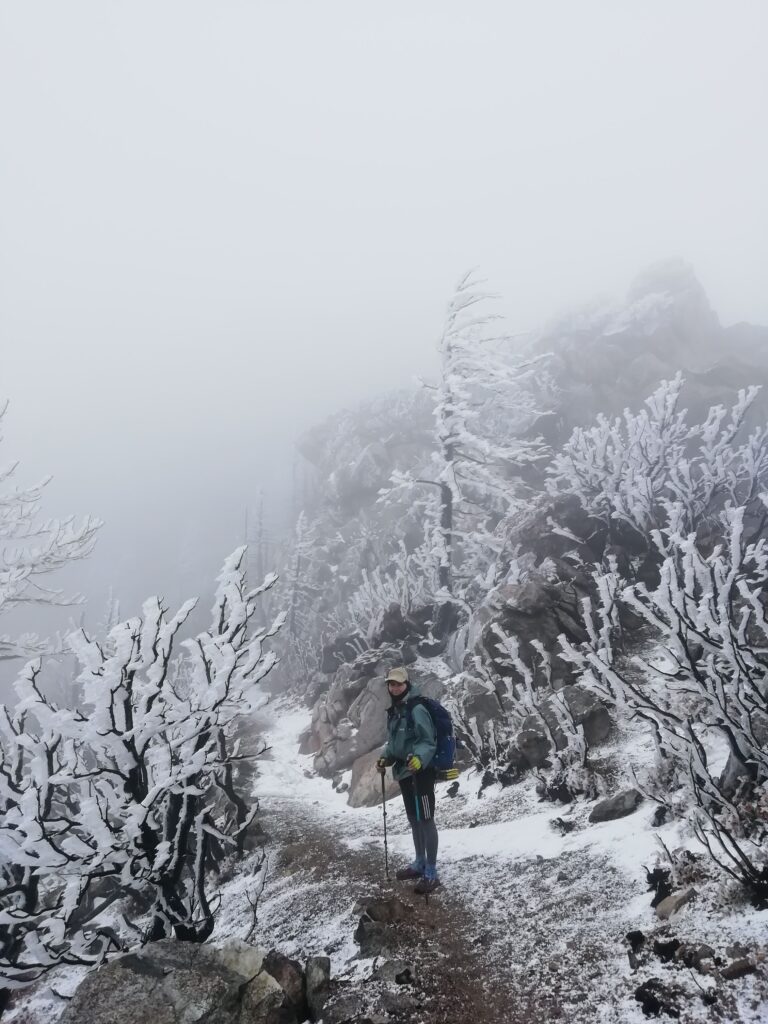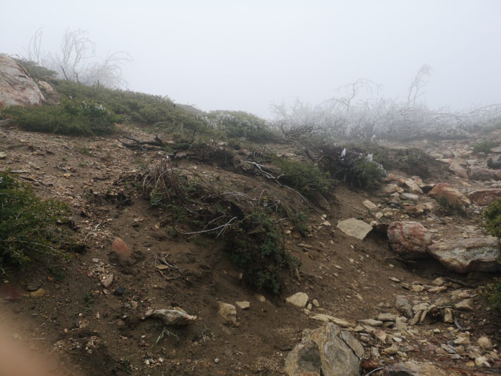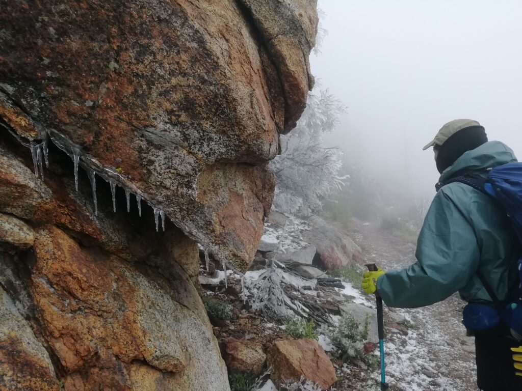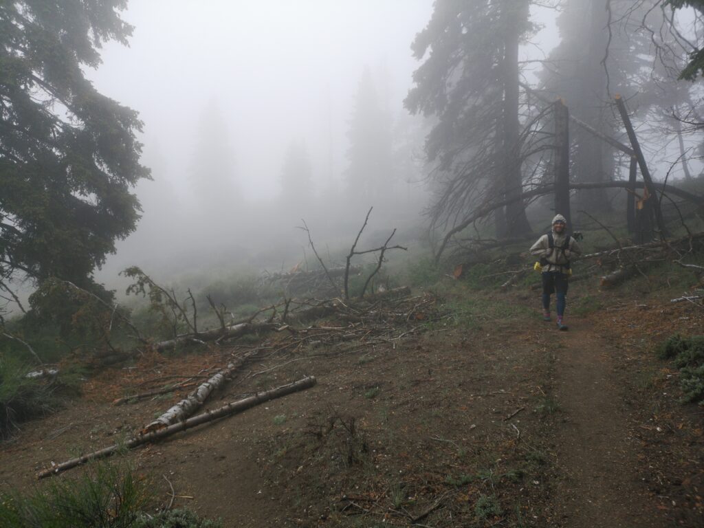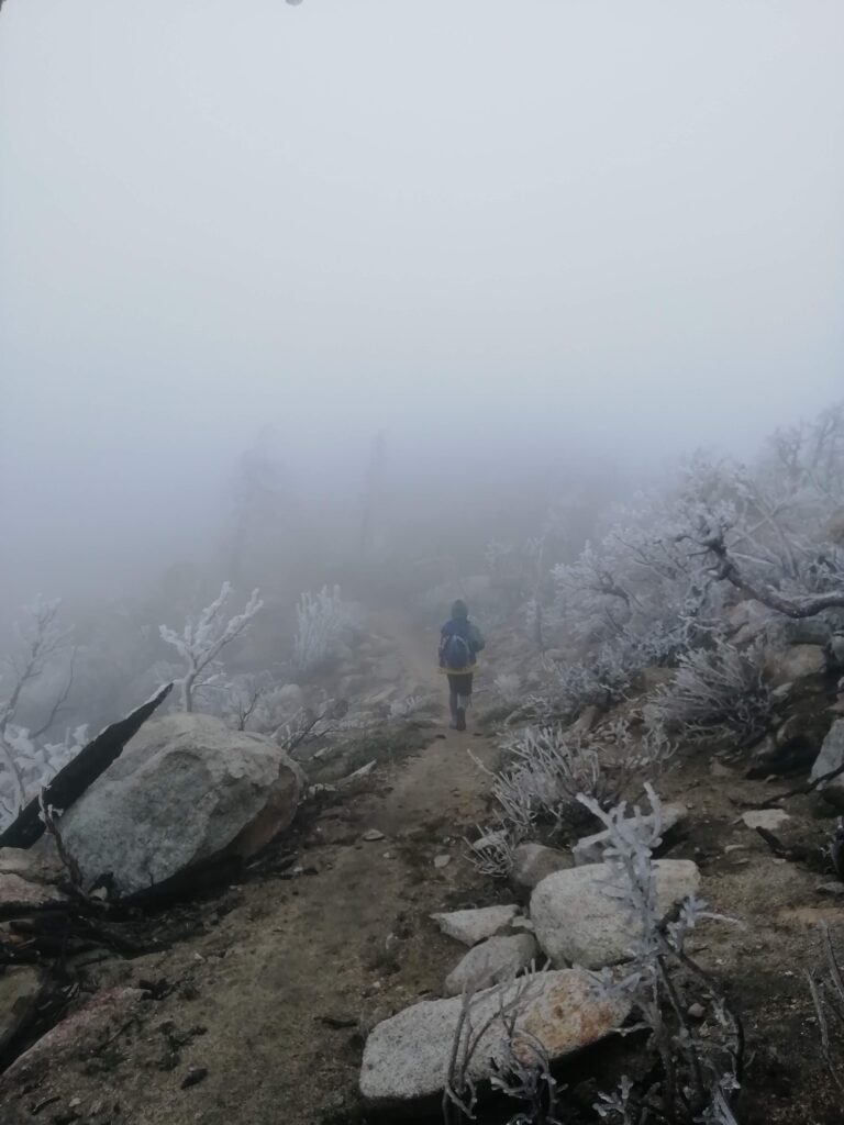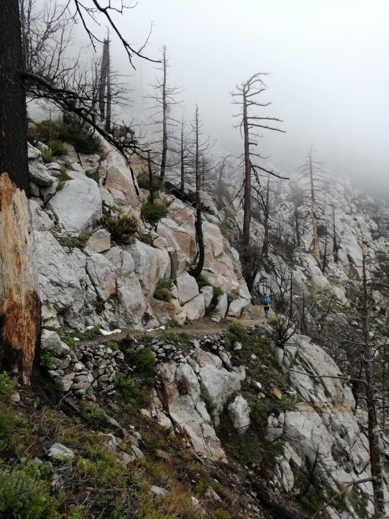 Wir liefen hauptsächlich in einer Wolke. nach ein paar Meilen mussten wir leider einen Umweg von zwei Meilen in Kauf nehmen, um unsere Wasservorräte aufzufüllen. Im Prinzip ging es die ganze Zeit mehr oder weniger bergauf. Der Weg war nun fast alpin und man musste definitiv schwindelfrei sein, was eine nette Abwechslung war. Es konnten beeindruckend vereiste Büsche, Bäume und Felsen betrachtet werden. Letztes Jahr hat die Gegend einen starken Waldbrand verkraften müssen, weshalb die Atmosphäre teilweise fast gruselig war – verkohlte Bäume im dichten Nebel.