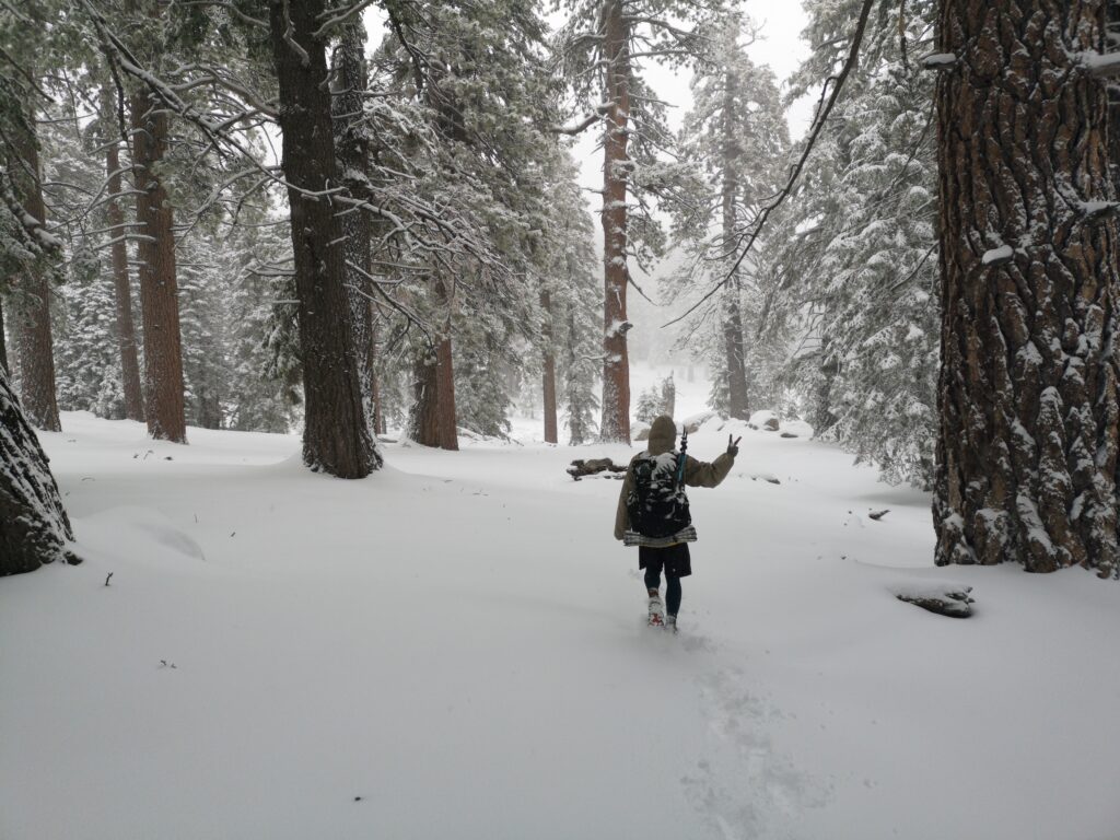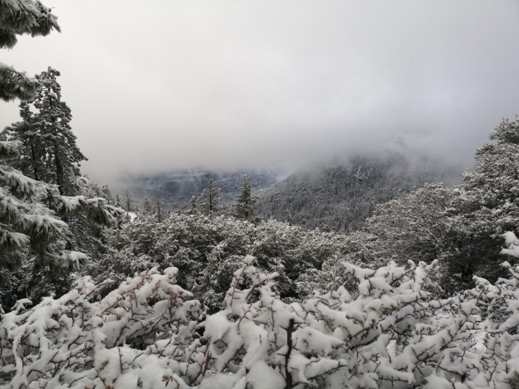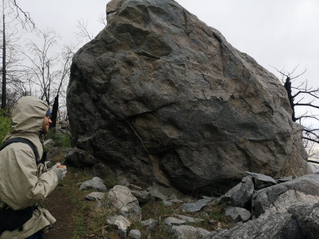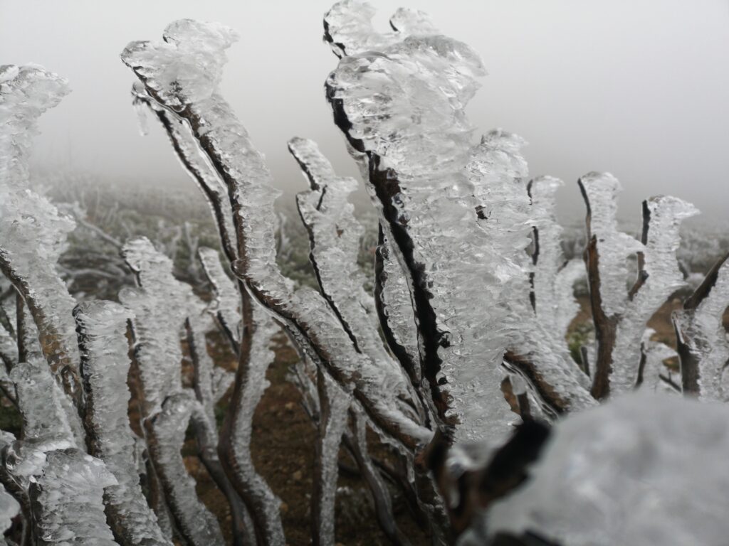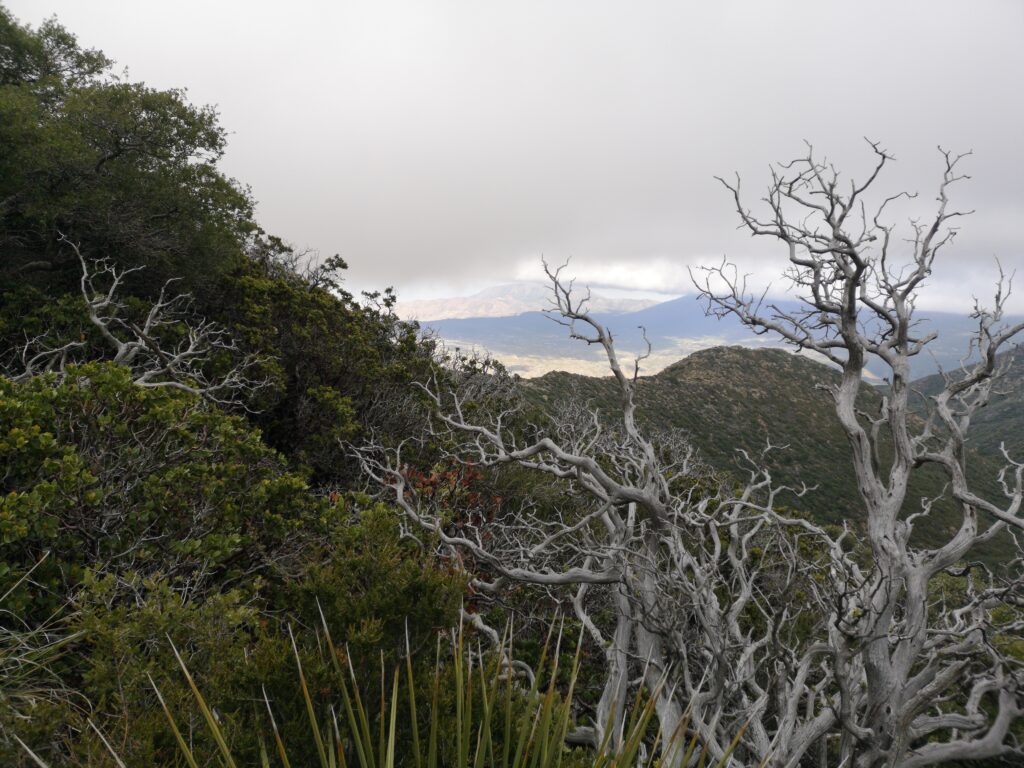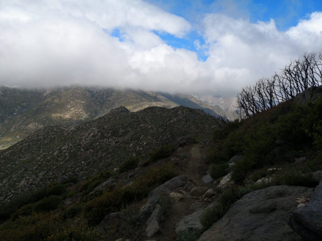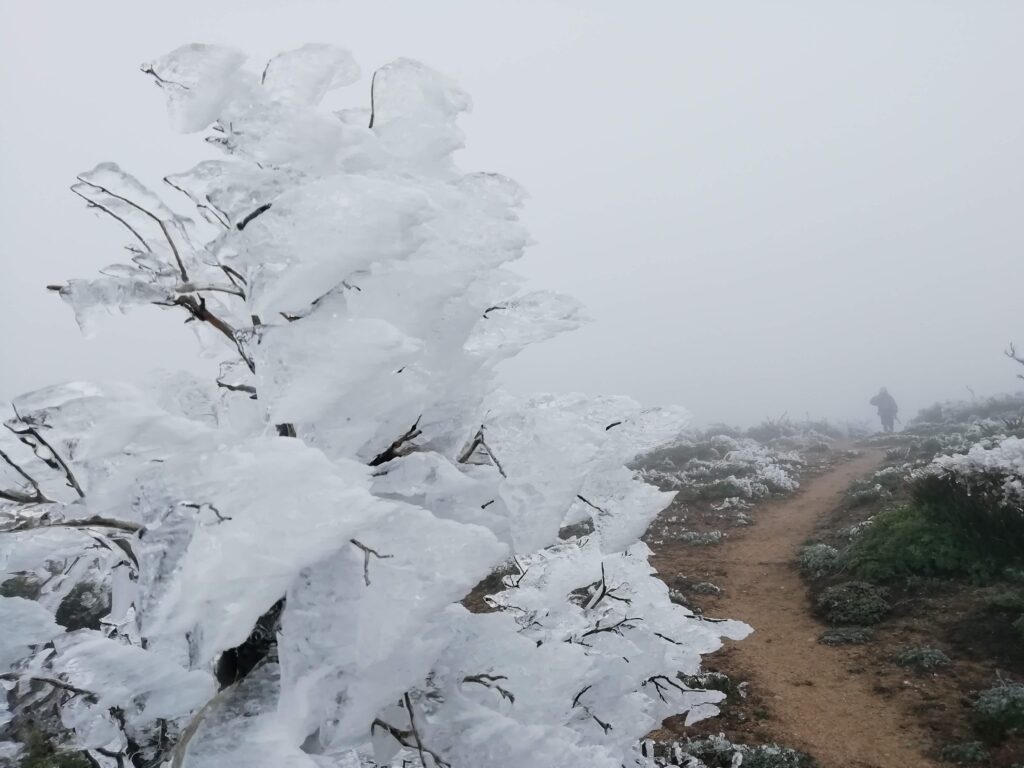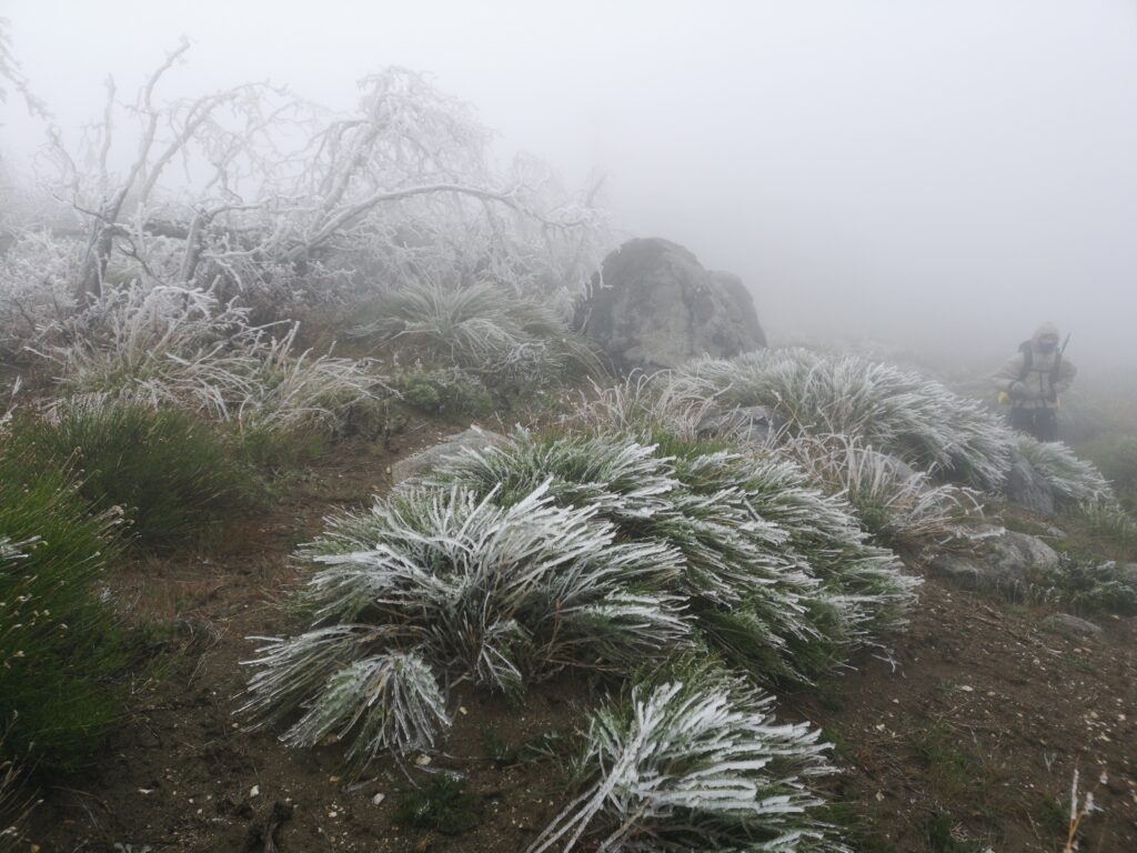 Wir liefen hauptsächlich in einer Wolke. nach ein paar Meilen mussten wir leider einen Umweg von zwei Meilen in Kauf nehmen, um unsere Wasservorräte aufzufüllen. Im Prinzip ging es die ganze Zeit mehr oder weniger bergauf. Der Weg war nun fast alpin und man musste definitiv schwindelfrei sein, was eine nette Abwechslung war. Es konnten beeindruckend vereiste Büsche, Bäume und Felsen betrachtet werden. Letztes Jahr hat die Gegend einen starken Waldbrand verkraften müssen, weshalb die Atmosphäre teilweise fast gruselig war – verkohlte Bäume im dichten Nebel.