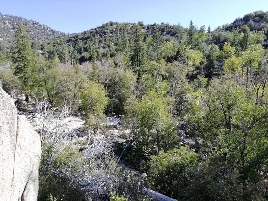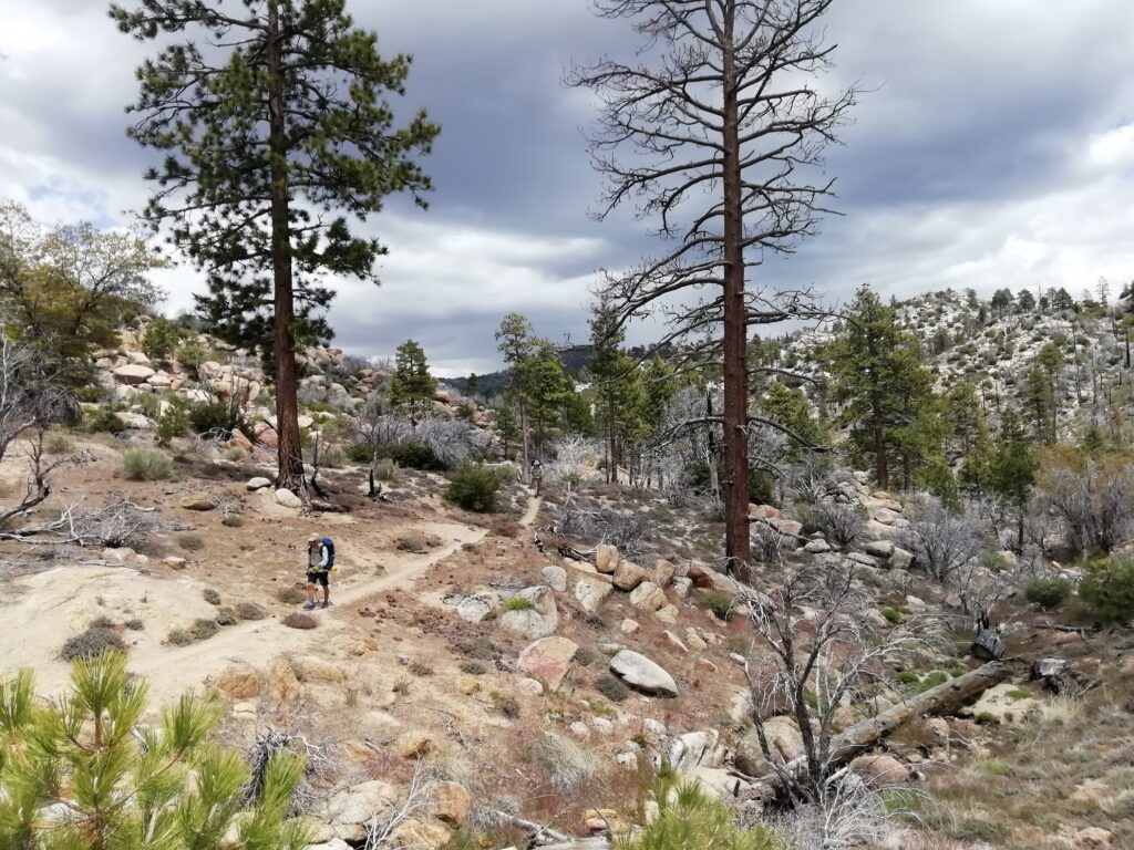 Die Nacht war extrem kalt – ich habe ab ca. ein Uhr morgens in Embryonalstellung irgendwo zwischen schlafen und wach sein zugebracht. Das Hauptproblem waren dabei die Eisklötze an meinen Füßen, dagegen muss ich bei Gelegenheit etwas unternehmen. Auch der Morgen schien nicht gewillt zu sein uns etwas Entspannung zu ermöglichen. So bauten wir schnell alles ab, holten noch etwas Wasser am Water Cache, den ein netter Trailangel pflegt und machten uns auf den Weg. Der Trail stieg zum Glück an und wir liefen langsam in sonnige Bereiche. Nach etwa einer halben Stunde machten wir Frühstückspause auf einem umgefallenen Baumstamm und tauten langsam auf. Anschließend wand sich der Weg durch einen lichten Wald GROSSER Nadelbäume. Der Wald ging später langsam in steppenartiges Terrain über, das nur noch sehr wenig Schatten bot. Die steilen Hänge, an denen wir entlangliefen führten uns gegen Mittag zu einem Zeltplatz mit Pferdegatter (man kann den PCT auch zu Pferd bereisen), defektem Brunnen und Plumpsklo. Letzteres stank zwar bestialisch, war jedoch sehr willkommen, da sich hierdurch das Buddeln eines Lochs erübrigte.