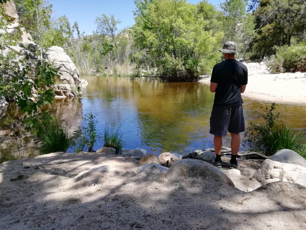 Für unsere Mittagspause am Fluss haben wir ein schönes Plätzchen gefunden. Als wir dort ankamen hat sich eine Schlange (nicht giftig, ca. 1 m, braun) lässig aus dem Staub geschlängelt und ist durch den Fluss ans andere Ufer geschwommen. Weitere Highlights dieser Mittagspause waren ein Fliegenfischer (der eine Stunde gefischt und nichts gefangen hat. Trotz laufender GoPro. Wir sehen nicht, was so spannend am Fischen sein soll, dass man sich das eine Stunde in Ego-Perspektive auf Video aufzeichnet), ein Crossmotorrad, ein Crossbuggy, Kolibris und ein Erpel.