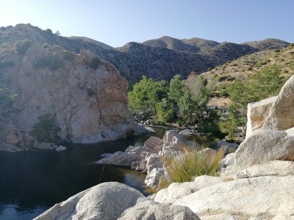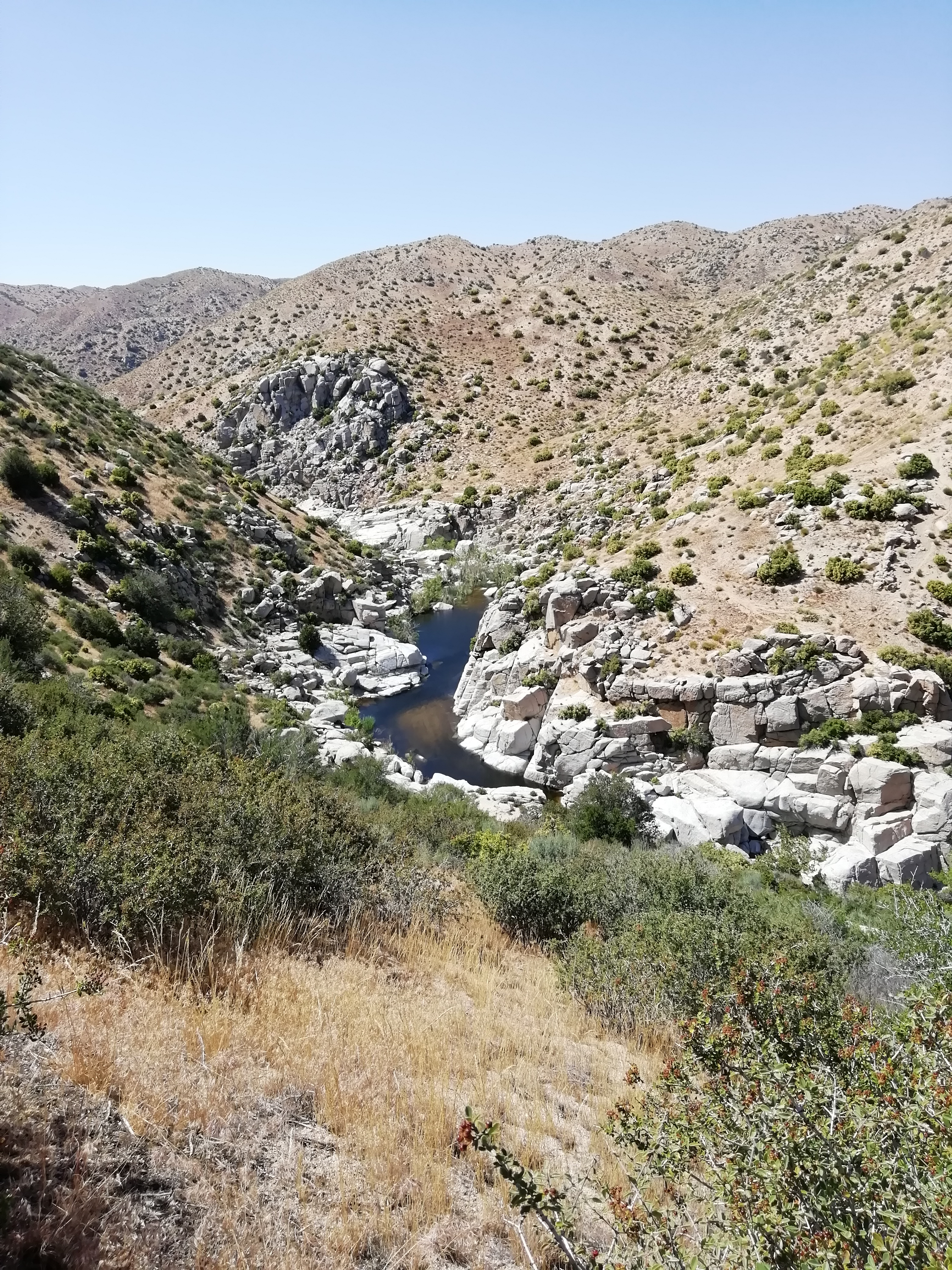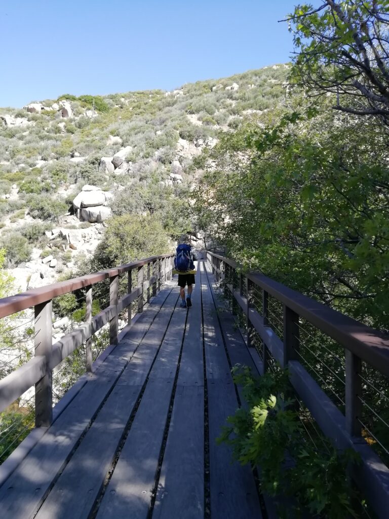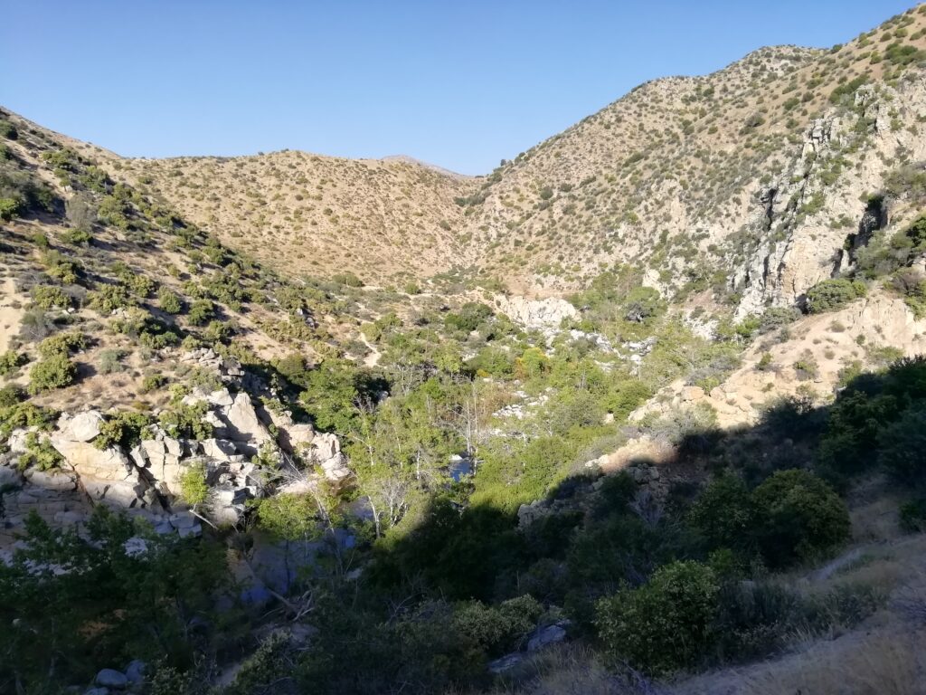 Wieder auf dem PCT ging es weiter am Hang des Tals entlang. Es war etwas surreal, weil wir in wüstenähnlichem Gelände unterwegs waren (alles vertrocknet, nur ganz kleine Sträucher, alles hatte Dornen oder Stacheln) und der Talboden, bzw. die Ufer des Flusses sehr grün und saftig wirkten. Dort unten sah es so aus wie ich mir die Urwälder Madagaskars vorstelle.