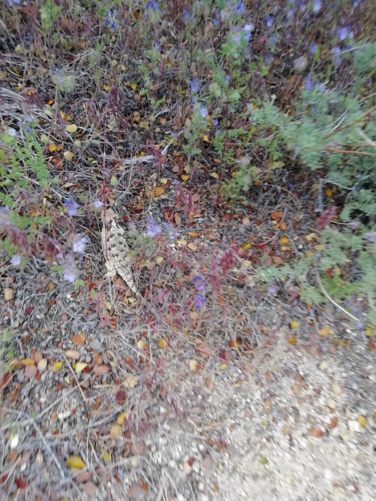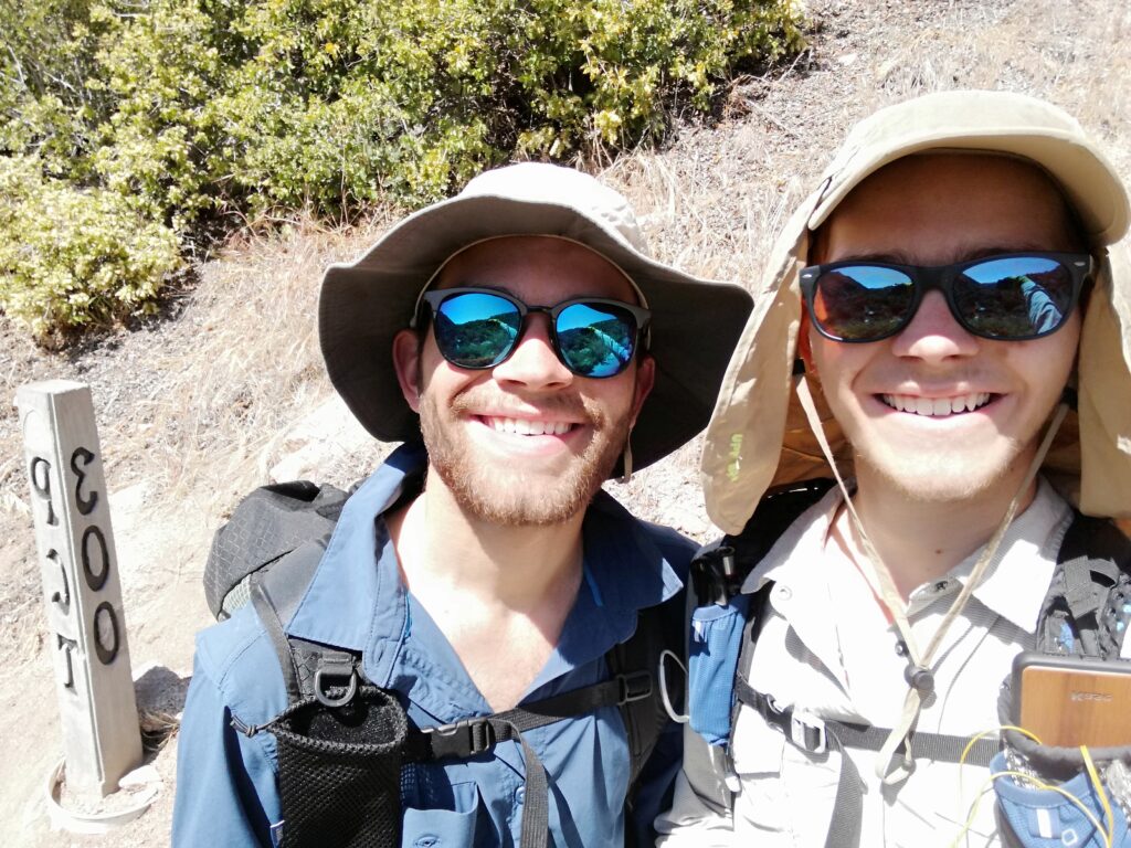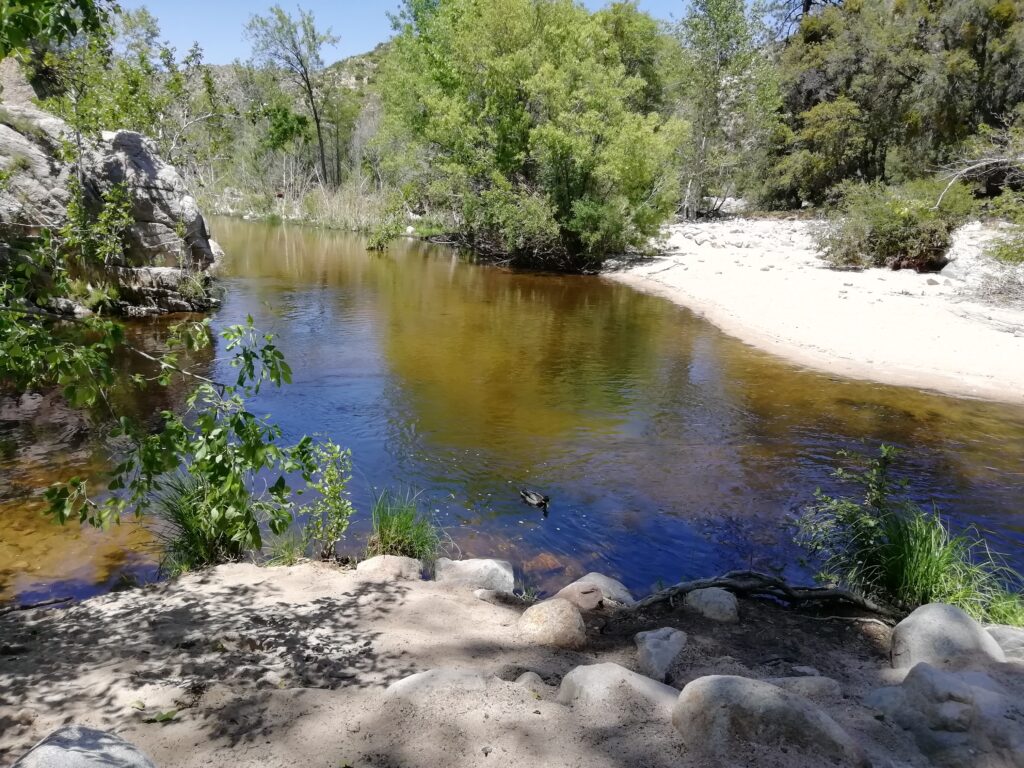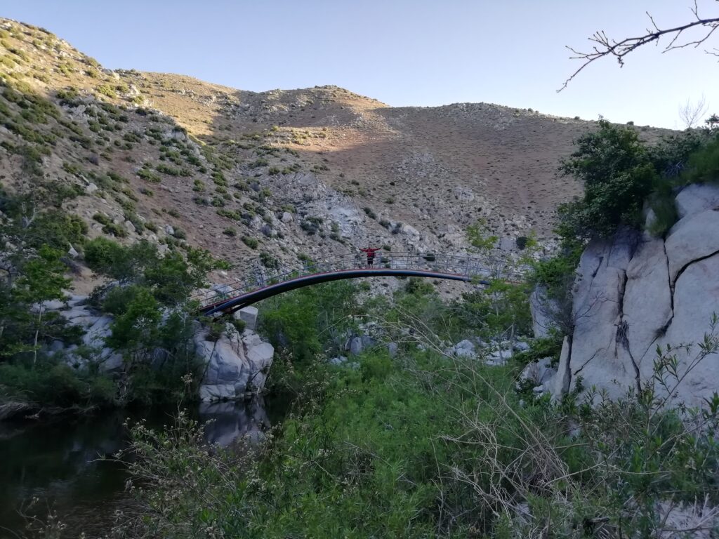 Wieder auf dem PCT ging es weiter am Hang des Tals entlang. Es war etwas surreal, weil wir in wüstenähnlichem Gelände unterwegs waren (alles vertrocknet, nur ganz kleine Sträucher, alles hatte Dornen oder Stacheln) und der Talboden, bzw. die Ufer des Flusses sehr grün und saftig wirkten. Dort unten sah es so aus wie ich mir die Urwälder Madagaskars vorstelle.