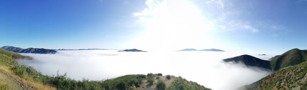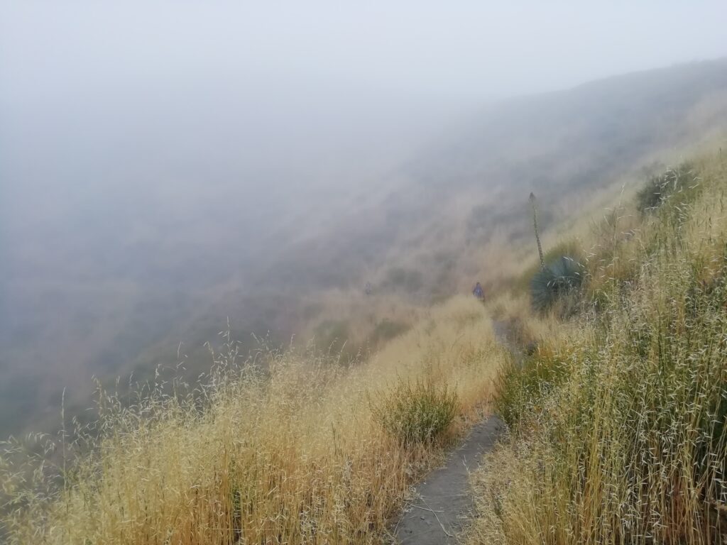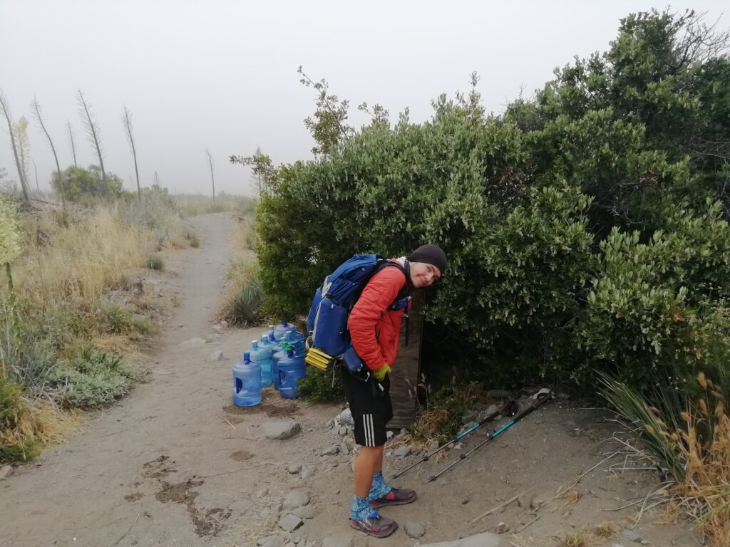 Wir sind in einer Wolke aufgewacht. Nach dem Aufstehen und Abbauen haben wir noch Wasser aus dem bereitstehenden Watercache geholt. Wir hatten nicht mehr genug zu Essen, deshalb gab es mehrere Müsliriegel zum Frühstück. Nach Wrightwood sind es 21 Meilen und ziemlich viele Höhenmeter, wir waren uns nicht sicher, ob wir uns da nicht zu viel vorgenommen hatten.