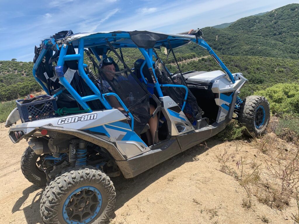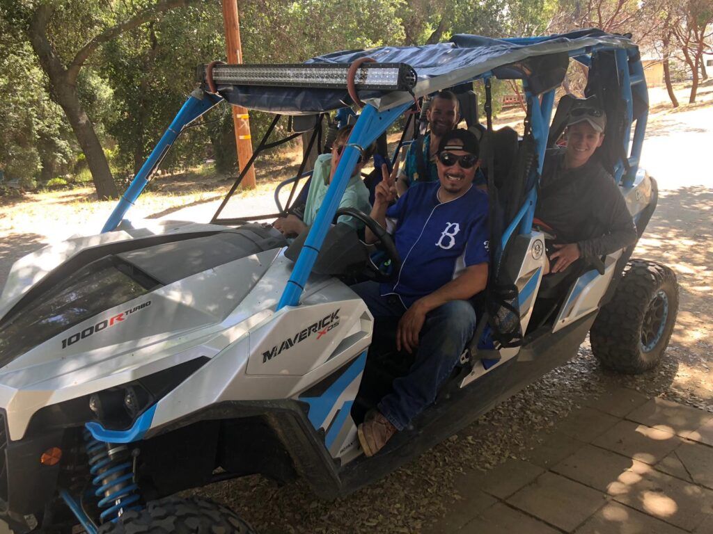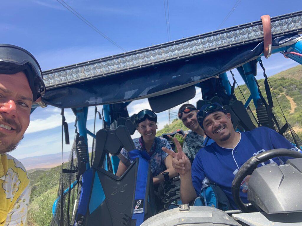 Während ich ein Nickerchen im Zelt machte, was bei 36°C gar nicht so einfach war, kam er vorbei und Paul durfte mitfahren. Als ich im Halbschlaf zurück kam waren sie schon länger wieder da, aber Epic nahm mich und zwei Amerikaner auf eine zweite Runde mit. Es war der Hammer! Dieser Buggy war so gut gefedert, dass es nicht im Rücken wehtat und man nur ganz selten durchgeschüttelt wurde. Rick ist auf selbst gebahnten, teils Trampelpfad breiten Wegen über die Gräte und Sattel der angrenzenden Berge geheizt. Ich saß hinten und habe vor allem die Drifts in den Kurven genossen. Das Ding konnte schon gut beschleunigen und ich war froh Griffe für die Hände zu haben. Nach ein paar Minuten hatte ich mich an das Auto gewöhnt und es hat richtig Spaß gemacht. Wir fühlen uns sehr geehrt, dass wir die Gelegenheit hatten so etwas zu machen.