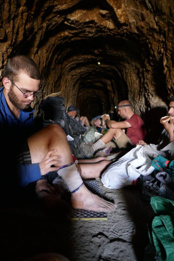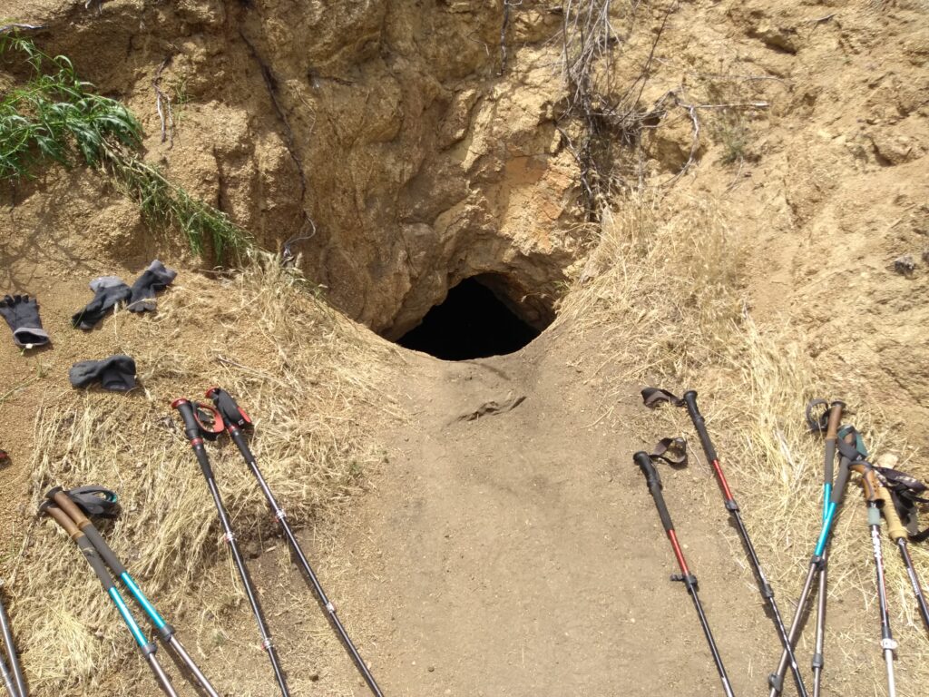 Die Rettung war ein Eintrag in Guthooks, unserer Karten-App, eine Meile vor uns. Es war von einer „small cave“ (kleinen Höhle) die Rede und wir waren gespannt. Wenig später dann kamen wir an einem kleinen Loch, das seitlich des Pfades einen schwarzen Fleck in den Fels zeichnete. Es war gerade groß genug, um liegend durch zu robben. Ich ging auf vorsichtige Erkundungstour, während Tim draußen wartete. Ich schaltete wegen der Dunkelheit mein Handylicht ein, sah aber trotzdem nur schwarz. Immerhin konnte ich erkennen, dass sich die Decke wohl ein wenig anzuheben begann. Als ich durch das eingestiegen war, staunte ich nicht schlecht. Ein in den Fels getriebener Schachtzog verlor sich im dunklen des Berges. Er war hoch genug, um darin entspannt stehen zu können und ich holte Tim hinterher.