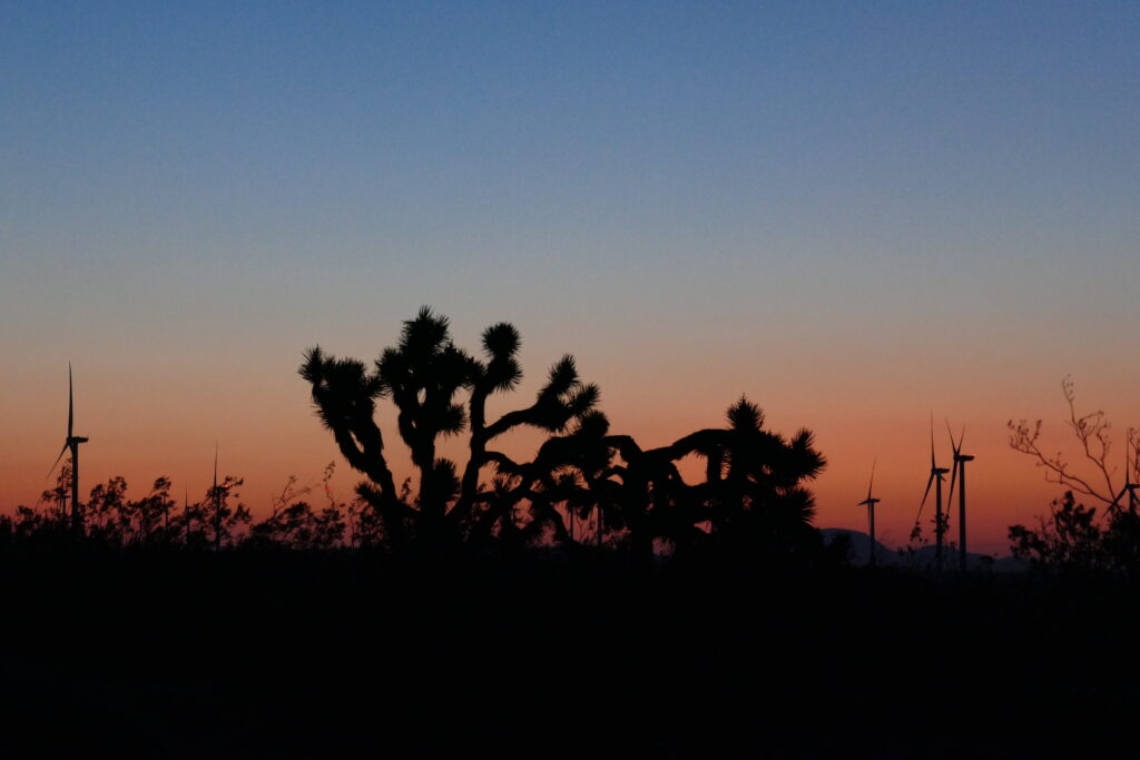 Es ging nun wieder in bergigeres Terrain und wir hatten einen hammer Sonnenuntergang, während ein roter Doppdecker über den uns zu Fuße liegenden Mojave Ausläufer flog.