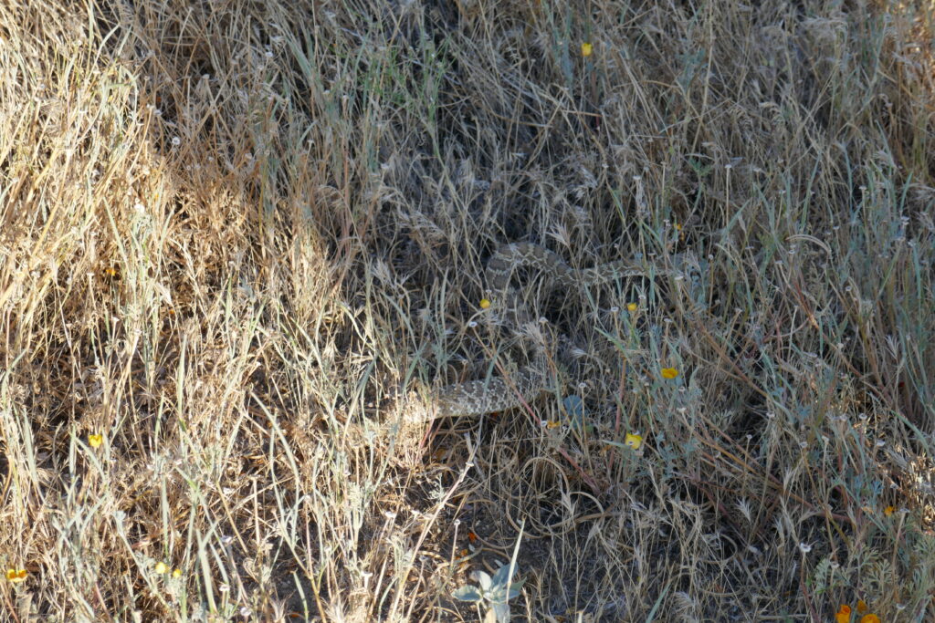 Wir folgten dem Trampelpfad entlang eines Feldes und bereits ein paar hundert Meter später wurden wir wieder wach gerüttelt. Eine Klapperschlange machte lautstark auf sich aufmerksam, als ich neben ihr entlang ging. Unsere fünfköpfige Truppe begutachtete sie, wir schossen ein paar Fotos und weiter ging es. Am nächsten Gutshaus stand ein alter Mähdrescher, wie man ihn aus amerikanischen Filmen kennt. Skurriler Weise hatte dieser aber fast nagelneue Bereifung, auch wenn sie trotzdem platt war.