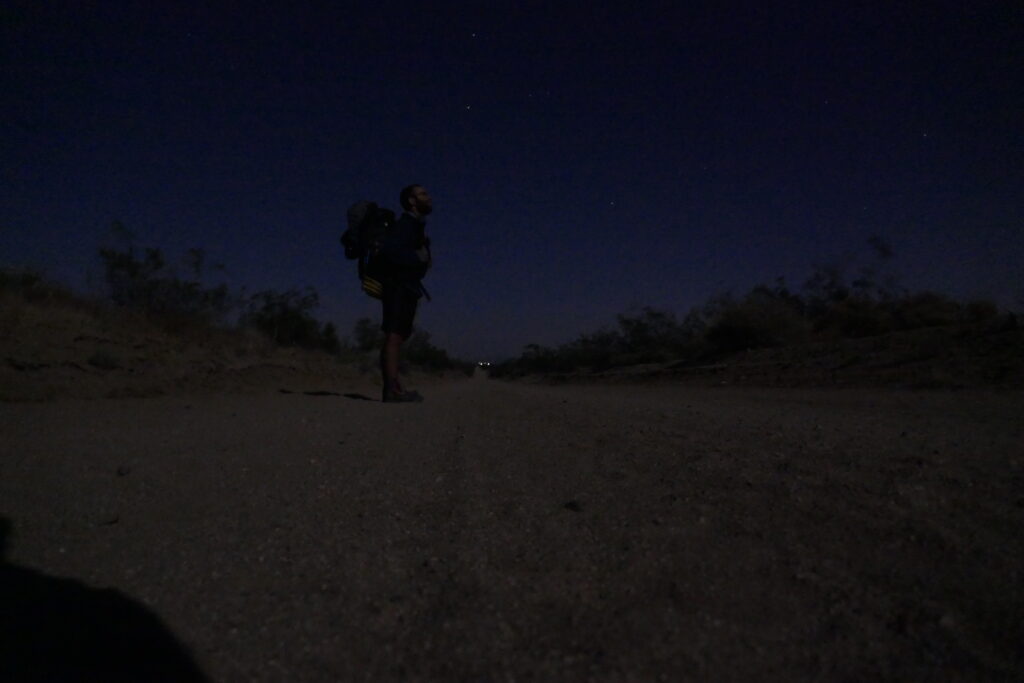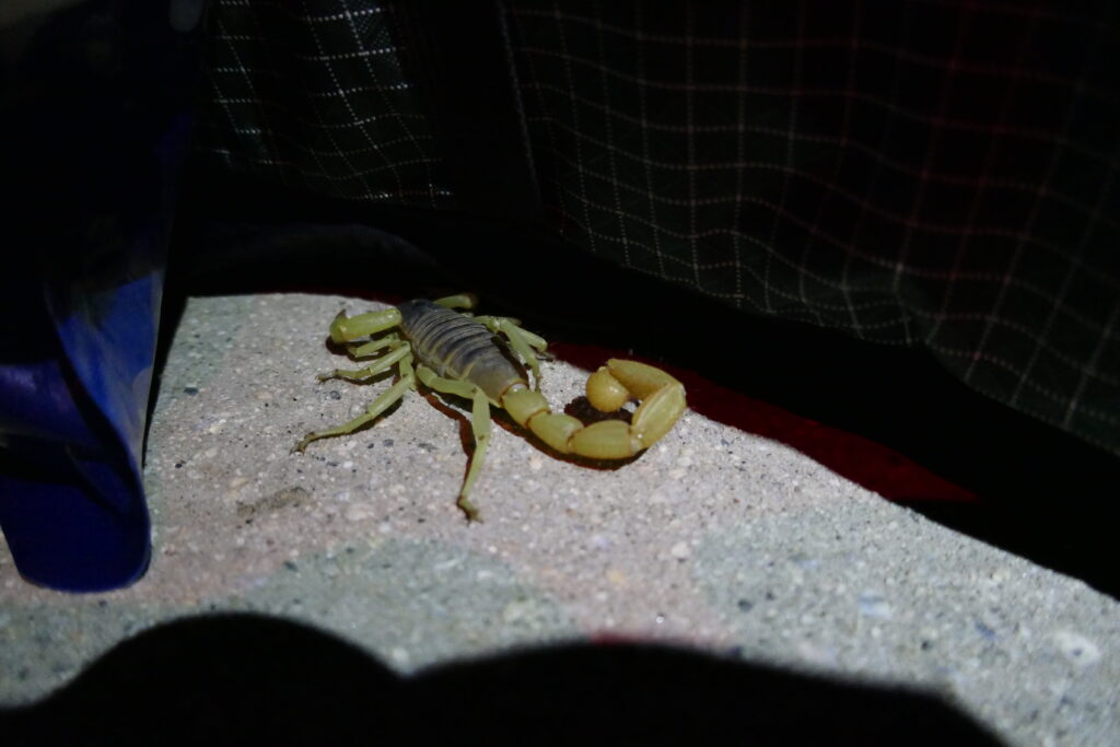 Als es dunkel wurde wechselte die Pipeline zu einem unterirdischen Kanal, auf dessen fahrbahnbreitem Betondeckel der Trail verlief. Nach den ersten sieben Meilen machten wir wir Abendessenspause. Als wir uns zum Kochen an einen Wartungsschacht setzten kam ein Handteller großer Skorpion angelaufen und machte es sich an Tims Rucksack bequem. Wir nahmen sein Angebot für ein Fotoshooting an und vertrieben ihn anschließend zurück ins Gebüsch. Zum Abendessen gab es mal wieder Ramenbomb.
