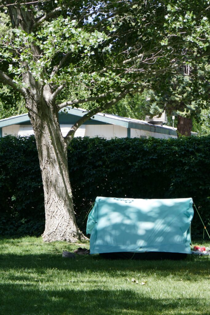 Als wir fertig gegessen und gequatscht hatten versuchten wir uns eine Bleibe zu organisieren. Es lag eine lange Liste mit Trailangeln und Telefonnummern aus. Nach der zehnten Mailbox entschieden wir, dass es vielleicht unhöflich ist fremde Menschen um 12 Uhr mittags anzurufen und wir auch große Lust hätten auf dem Flugplatz zu schlafen. Gesagt, getan. Der Flugplatz in Tehachapi lässt PCT-ler für fünf Dollar die Nacht im Picknickbereich übernachten. Wir genossen das erste echte grüne Gras in den USA. Außerdem konnte man duschen, es gab Chemietoiletten und fließend Wasser. Wir bauten schnell das Zelt auf und quatschen mir den anderen Wanderern.