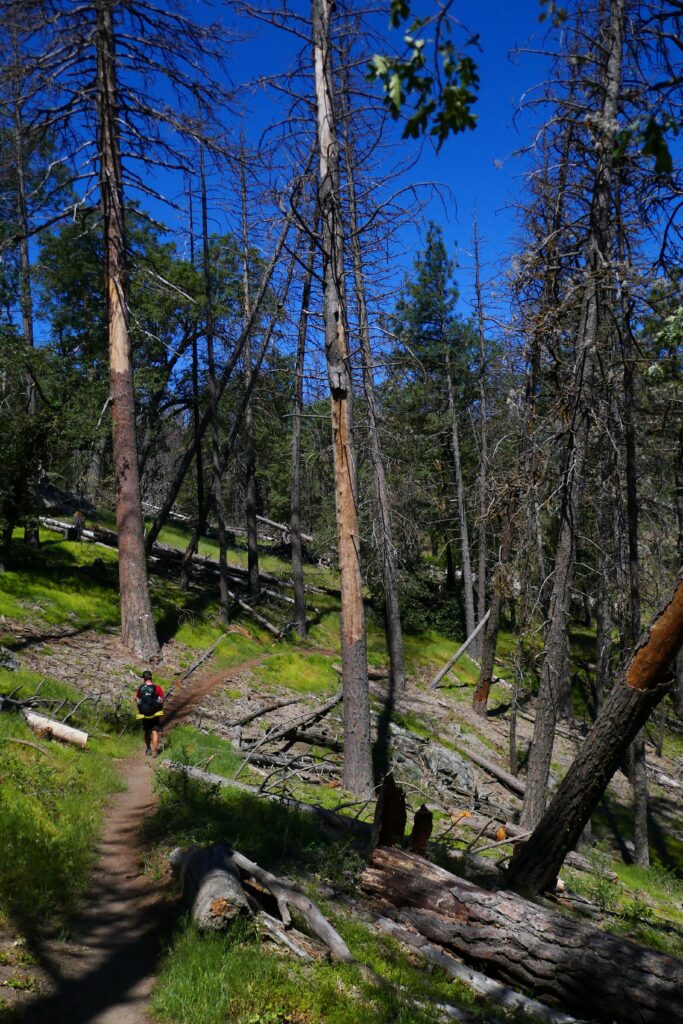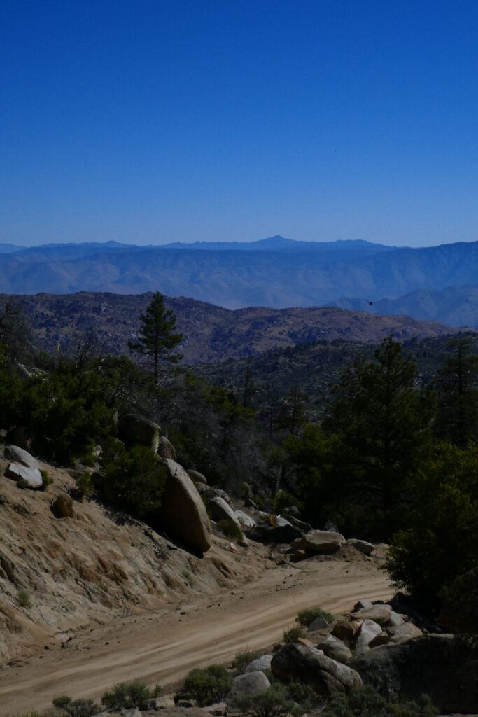 Nachdem wir uns um drei Uhr dazu durchrangen weiter zu gehen fing es am zu tröpfeln. Wir machten uns zuerst nichts daraus, jedoch wurde es mehr uns der Gedanke, ob man bereit war den Rucksack ab zusetzen, um seine Regenjacke heraus zu holen, drängte sich immer mehr in den Vordergrung. Wir beschlossen nach einer kurzen Pause unter einem Baum, auf diesen Umstand zu verzichten. Mittlerweile drang durch das Rauschen des Windes und die nur noch vereinzelten Regenteopfen tiefes grollen von Donner. Später werden wir erfahren, dass andere Wanderer sich bei starkem Hagel unter vereinzelte Bäume flüchten mussten und in der Nähe von Kennedy Meadows durch Blitzschlag ein kleiner Waldbrand ausgelöst wurde, dr noch einige Tage brennen sollte.