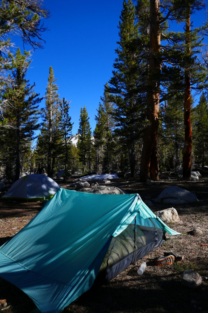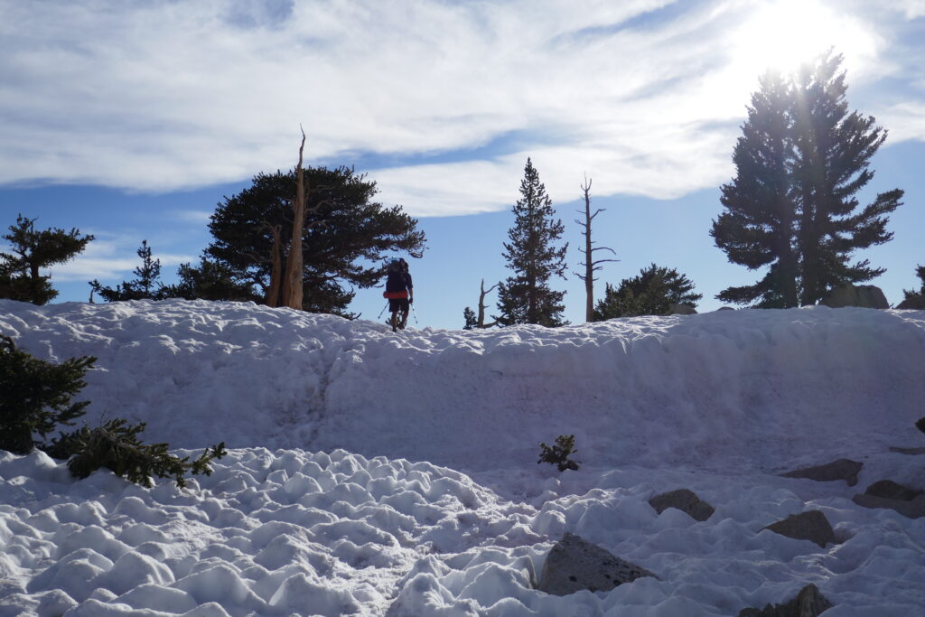 Der Aufstieg war steil und mit ein paar wenigen Schnneeresten übersprinkelt. Mittag machten wir, zurück auf dem Trail, an einem idyllischen Bergsee, wo wir Emma „Nifty“ und Claire „Smiles“ aus Kennedy Meadows wieder trafen und Pyro und Buttercup kennen lernten. Pyro kommt auch aus Deutschland und hat seinen Trailnamen vom Appalachian Trail, wo er in den ersten Tagen seine Regenjacke gekonnt mit Bradlöchern verschönert hatte.