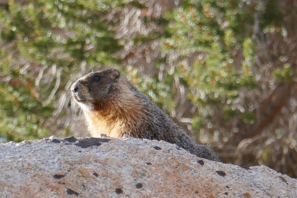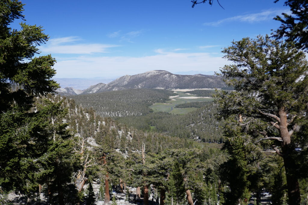 Gegen Mittag hatten wir dann unsere Rucksäcke wieder schwer bepackt und versuchten an der Ausfallstraße zu trampen. Schließlich nahmen uns zwei Touristen auf der Ladefläche ihres Pickups ein Stück mit, bis sie andere Wege fuhren. Dort bekamen wir eine Mitfahrgelegenheit bei einer Rennradfahrerahrerin und ihrem Begleiter. Sie waren auf der Suche nach neuen Strecken für den Herbst und kamen aus Las Vegas. Sie überlegte aber nicht den Berg hinab zu fahren, sondern die gesamten 2000 Höhenmeter HOCH zu fahren. Am Ende war es ihr aber doch eine zu lange Strecke, eine halbe Stunde Autofahrt, und zu viel Höhenunterschied. Wir empfahlen ihnen noch, sich die Meadows nahe dem Parkplatz anzuschauen und machten uns auf den Rückweg zum PCT.