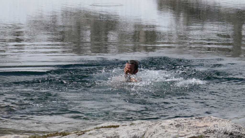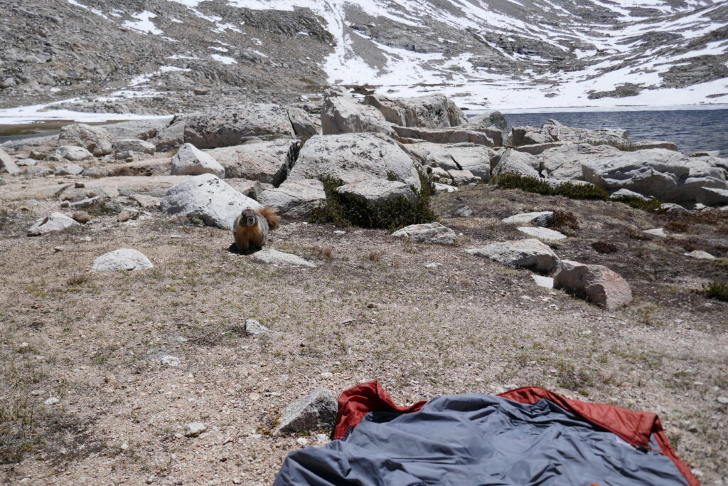 Als wir gegen 11 Uhr am Guitar Lake ankamen (wir finden die Form erinnert eher an eine Schildkröte) entschlossen wir uns für eine ausgedehnte Mittagspause. Zunächst badeten wir im See, was ein sehr kurzes Vergnügen war, da Eisschollen darin schwammen. Dann ließen wir uns in der Sonne trocknen, wobei sich Paul einen Sonnenbrand zuzog, und aßen zu Mittag. Dabei wurden wir von zwei Murmeltieren streng überwacht. Eines wollte sogar etwas von unserem Essen abhaben und lies erst von uns ab, als wir es mehrmals vertrieben hatten.