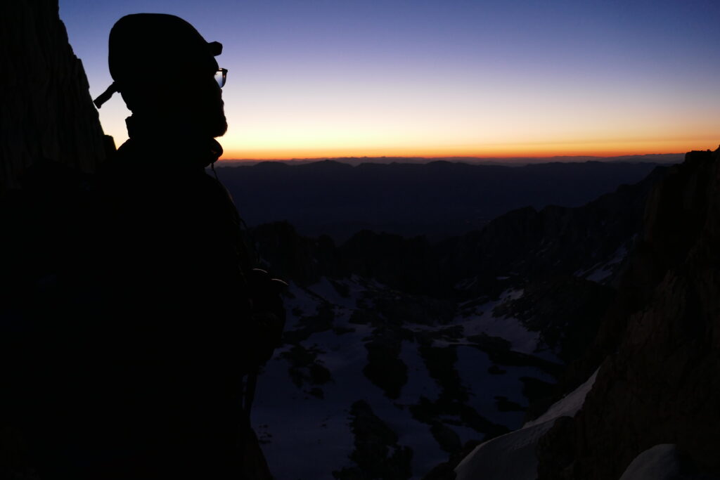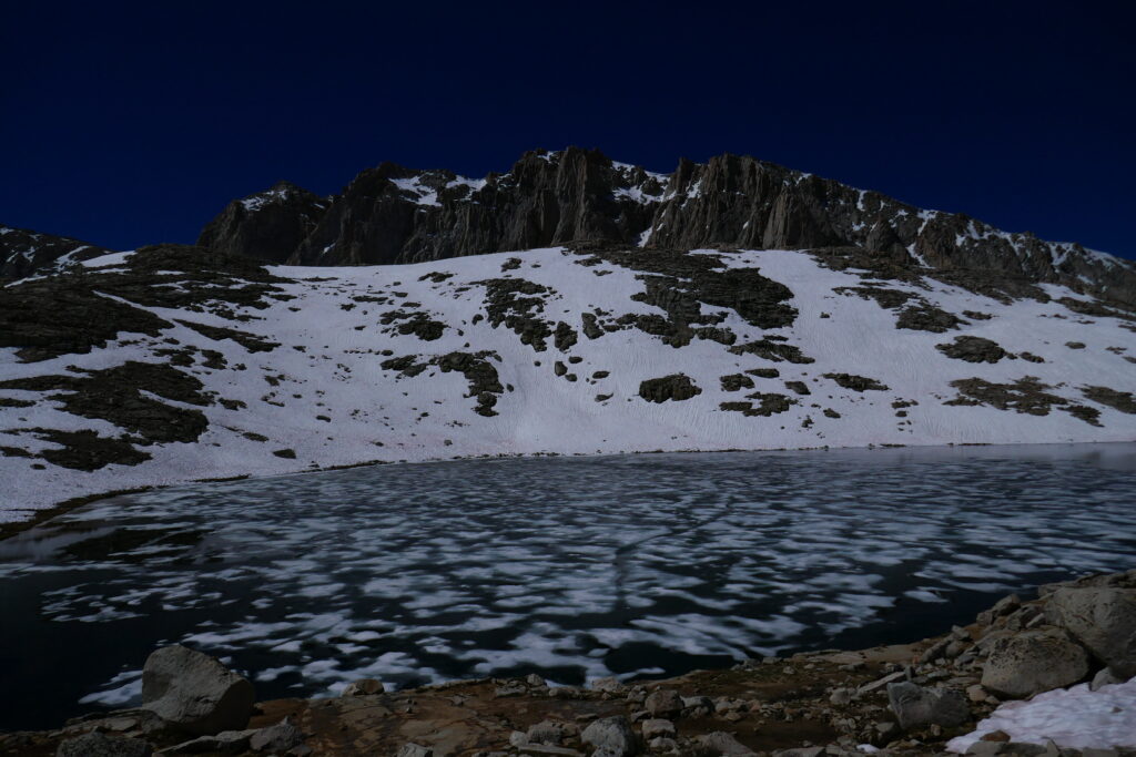 Heute war ein großer Tag. Wir haben Mnt Withney bestiegen. Das ist mit 4421 Metern Höhe der höchste Berg der Vereinigten Staaten (außerhalb Alaskas). Auf ihm ist der höchste Wanderweg der USA und der Beginn des John Muir Trails, eines unglaublich schönen Wanderwegs durch die High Sierra, dem wir die nächsten paar hundert Meilen folgen werden, verortet. Unser „Basecamp“ liegt auf 3230 Metern. Da wir einige Höhenmeter vor uns hatten sind wir sehr früh aufgebrochen. Wir hatten Angst beim Abstieg in geschmolzenem Schnee gehen zu müssen und wollten daher den Sonnenaufgang auf dem Gipfel abpassen. Deshalb waren wir um Mitternacht auf den Beinen. Wir hatten die Rucksäcke schon am Abend gepackt und ließen das Zelt stehen, da wir später wieder kommen wollten und so einiges an Gewicht sparen konnten (z.B. konnten die schweren Bärenkanister und viel Essen da bleiben:-)). Wir flogen also den Trail entlang und genossen das geringe Gewicht auf unserem Rücken.