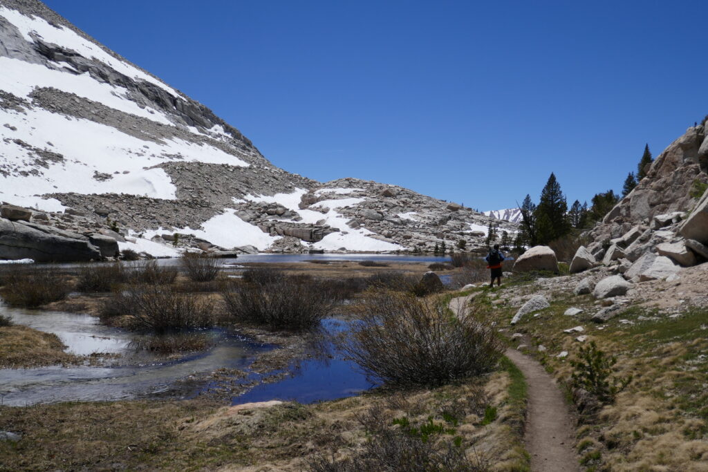 Wir liefen ein Tal hinauf, durchquerten dabei mehrere Meadows (sumpfige Wiesen), liefen jedoch hauptsächlich im Nadelwald. Nach und nach kamen wir an verschiedenen Seen vorbei und machten erste Erfahrungen mit sogenannten Sun Cups, bei denen es sich um ca 20 cm tiefe Löcher in Schneefeldern handelt zwischen denen nur schmale Stege Platz haben. Es ist sehr mühsam über sie hinweg zugehen und wir werden sicherlich keine Freunde.