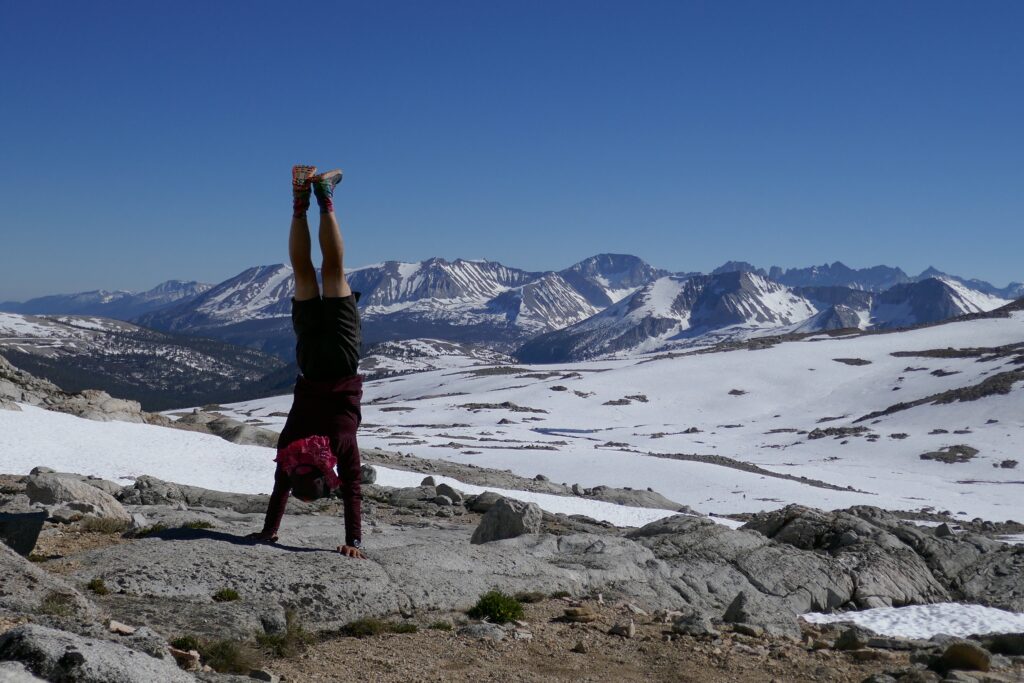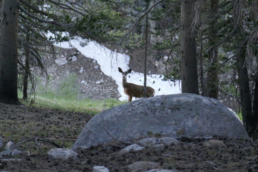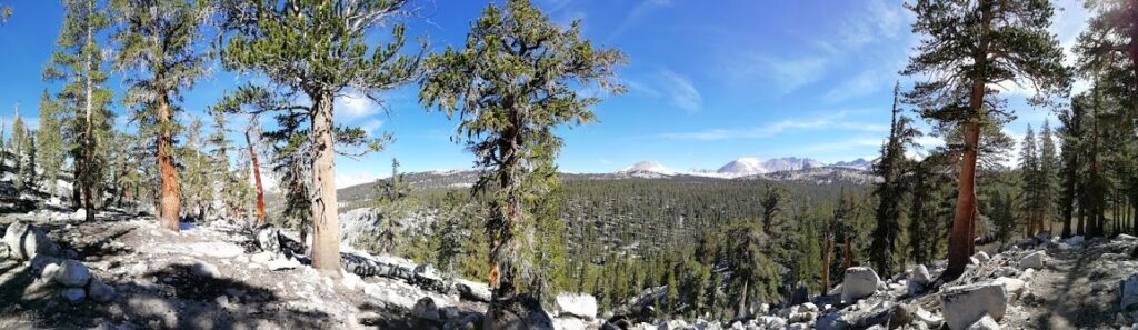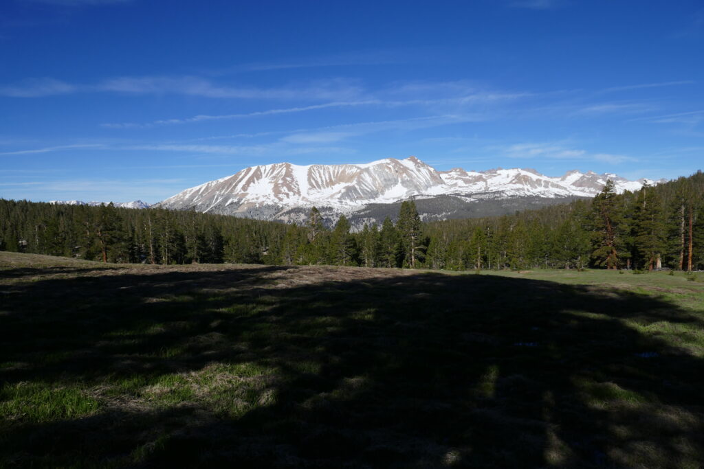 Wir schliefen länger, um etwas Schlaf nachzuholen. Als wir aufstanden und das Zelt zusammenpackten war der Campingplatz verlassen. Nur die Zelte der Whitney-Besteiger standen herum. Dann gingen wir ein paar Meilen durch Wald und machten Frühstück mit traumhaftem Ausblick auf das gegenüber liegende Bergmassiv.