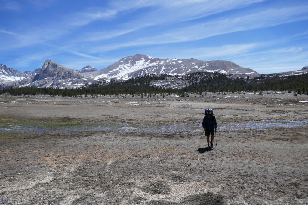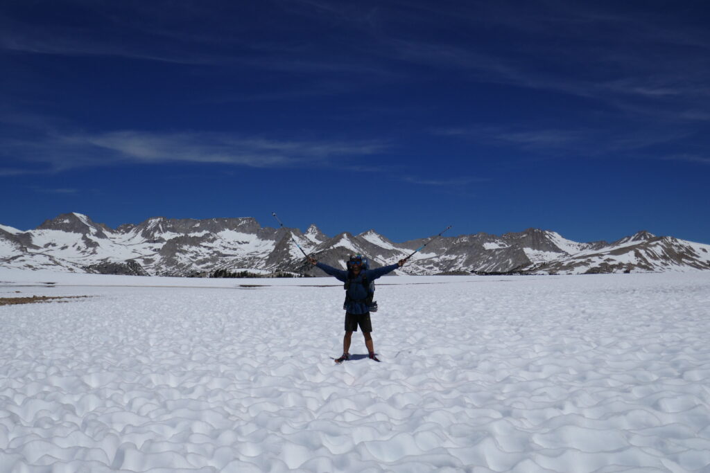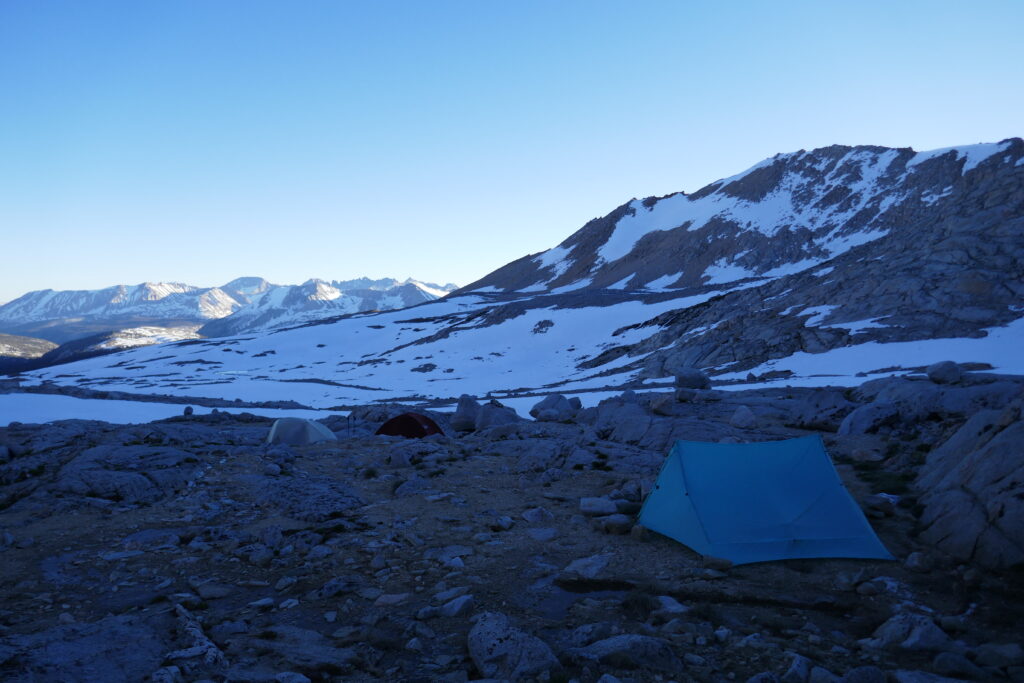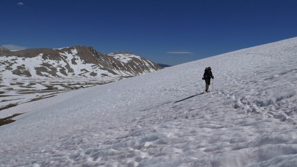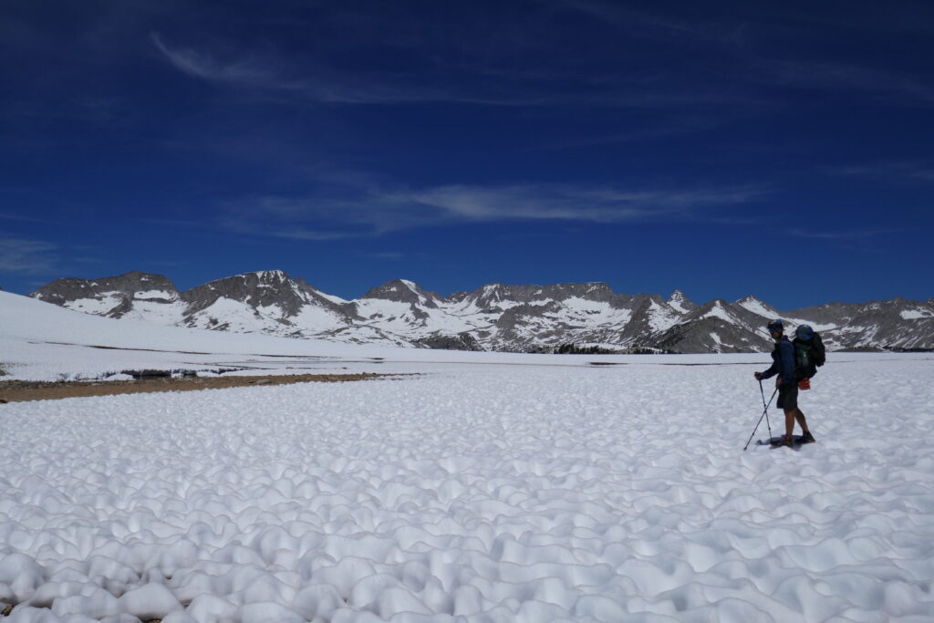 Als wir später auf einer schneebedeckten Anhöhe mit Gebirgssee standen kreuzten wir das erste Mal mit Megan und Brian die Wege, die wir in den nächsten beiden Tagen noch häufiger sehen sollten. Wir überzeugten sie den Campingplatz zu nehmen, den wir angepeilt hatten und zogen dann weiter. Bei der Mittagspause trafen wir Ernie und Sally wieder und Megan und Brian. Den Rest des Tages ging es im Schneefeld bergauf. Gegen sechs Uhr erreichten wir unseren Campingplatz für diesen Abend. Der Ausblick auf halber Höhe zum Forester Pass war grandios.