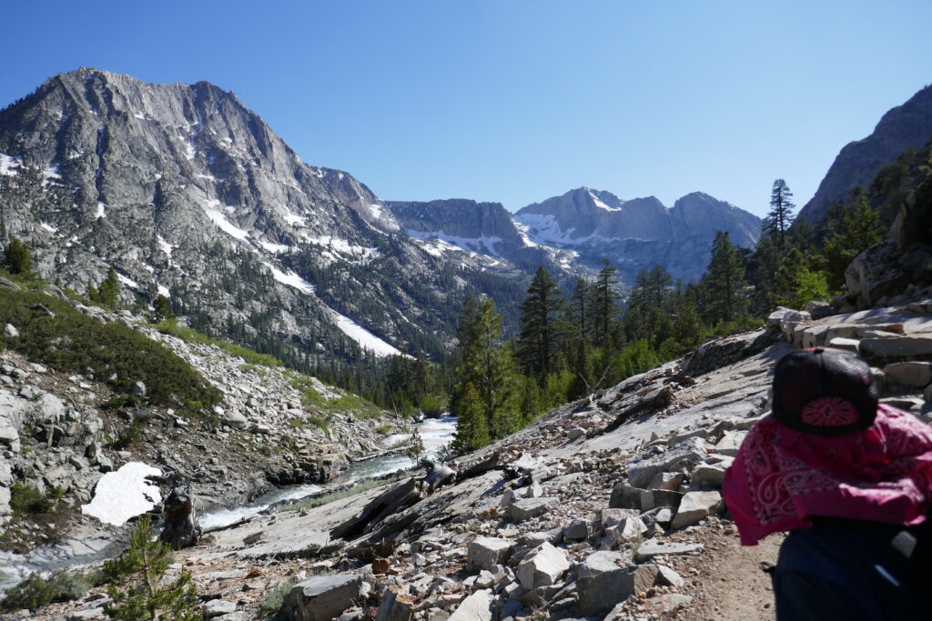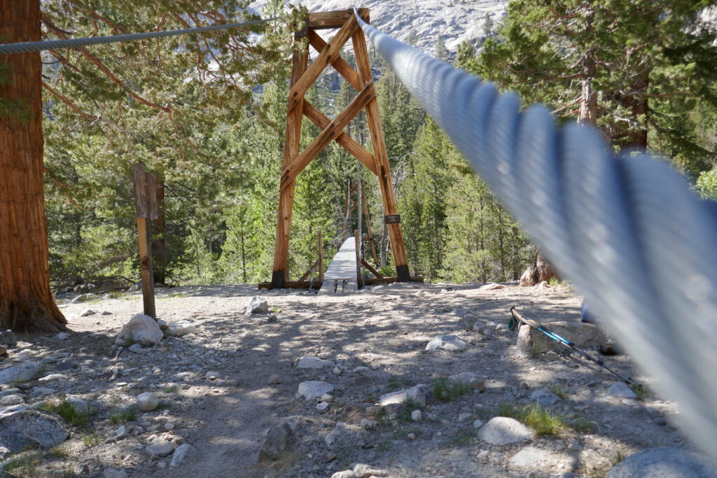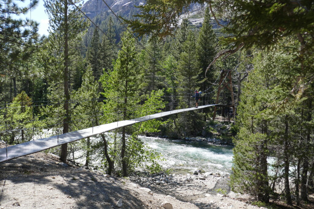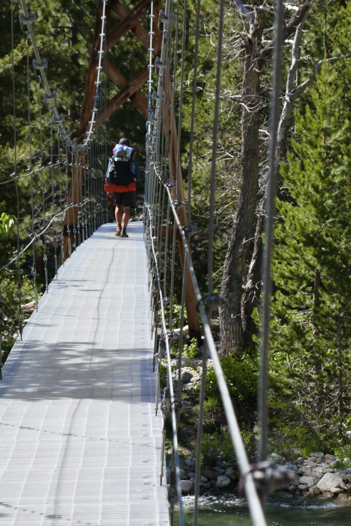 Im Tal überquerten wir einen reißenden Gebirgsfluss über eine wackelnde Hängebrücke. Ich war sehr froh darüber, dass sie da war. Auf der anderen Seite wartete eine größere Gruppe PCTler, die wir schon in Kennedy Meadows gesehen hatten. Wir erklommen zusammen mit ihnen den Berg entlang des Flusses und querten einen kleineren Seitenarm in Teamarbeit.