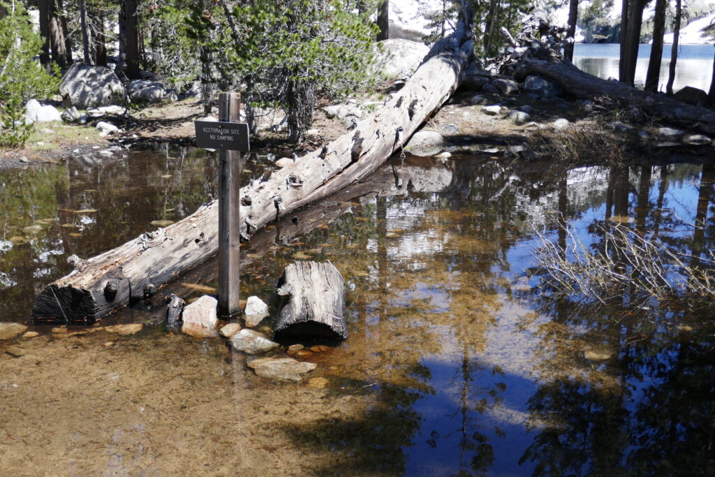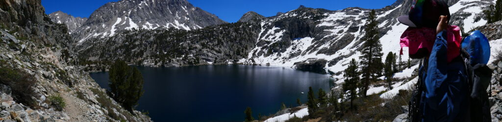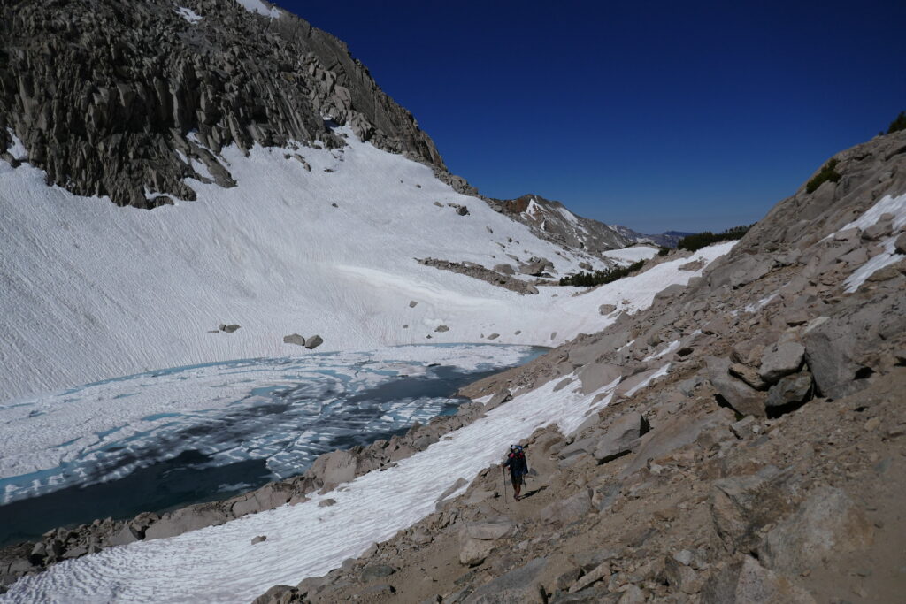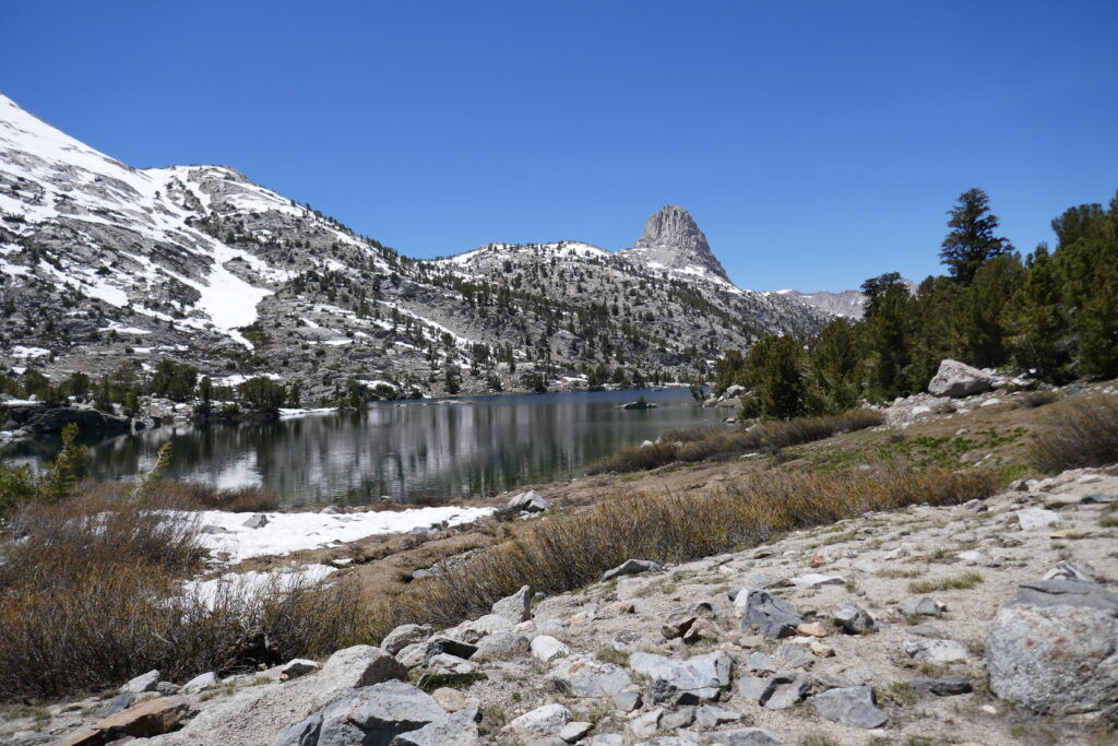 Wir machten an einem schönen See Mittagspause und trockneten unsere Sachen. Long John kam vorbei (wir hatten ihn in Wrightwood kennen gelernt). Man kann wohl von einem Felsen in den See springen und zur Insel rüber schwimmen. Die Eisschollen ließen uns dieses Vorhaben allerdings nicht gerade als verlockend erscheinen.