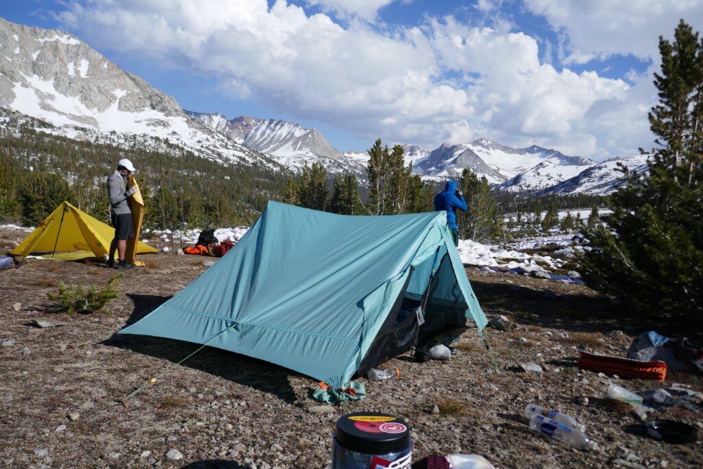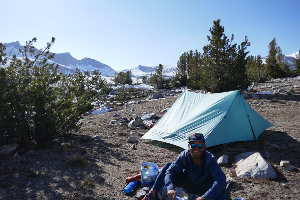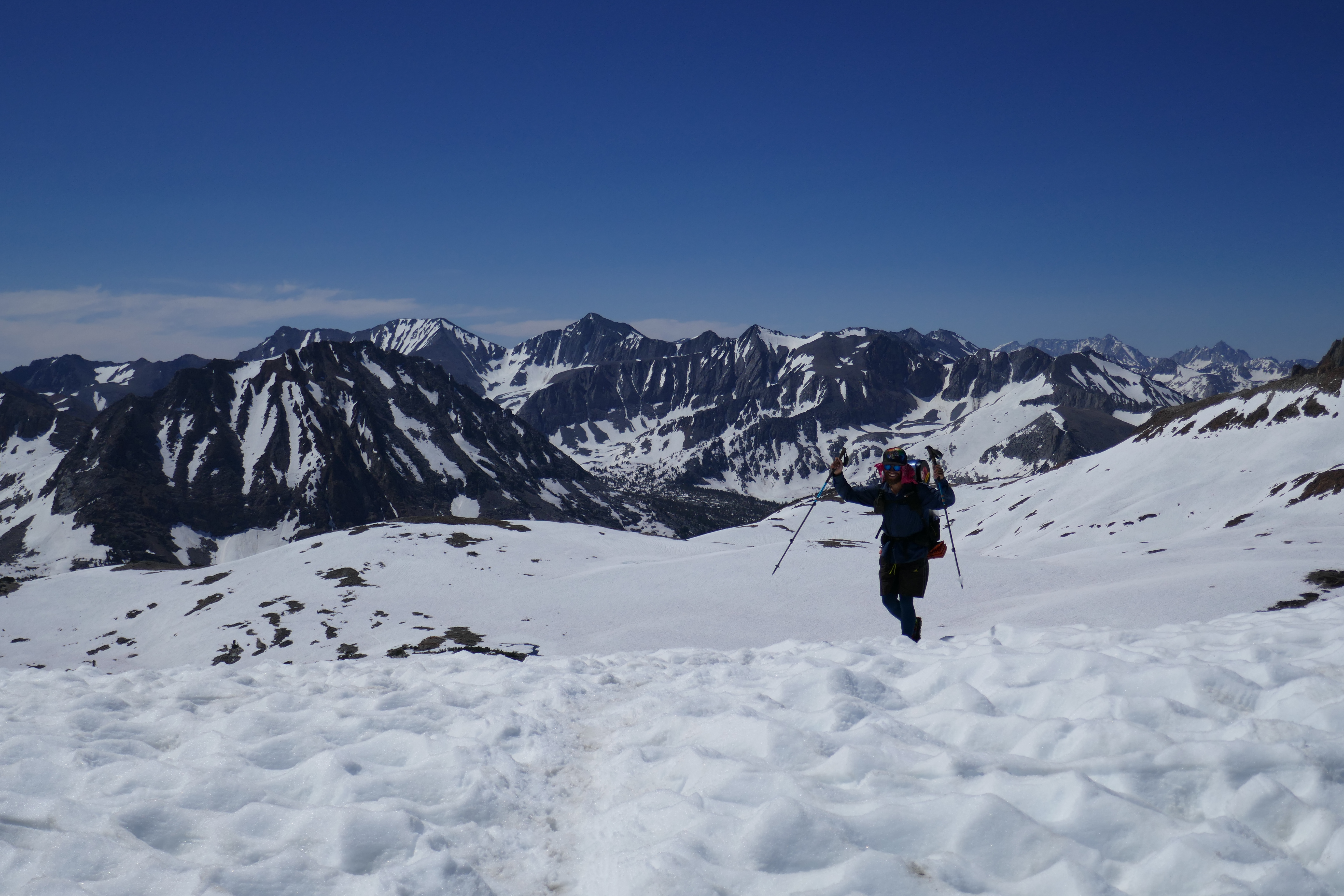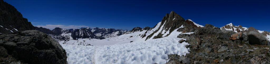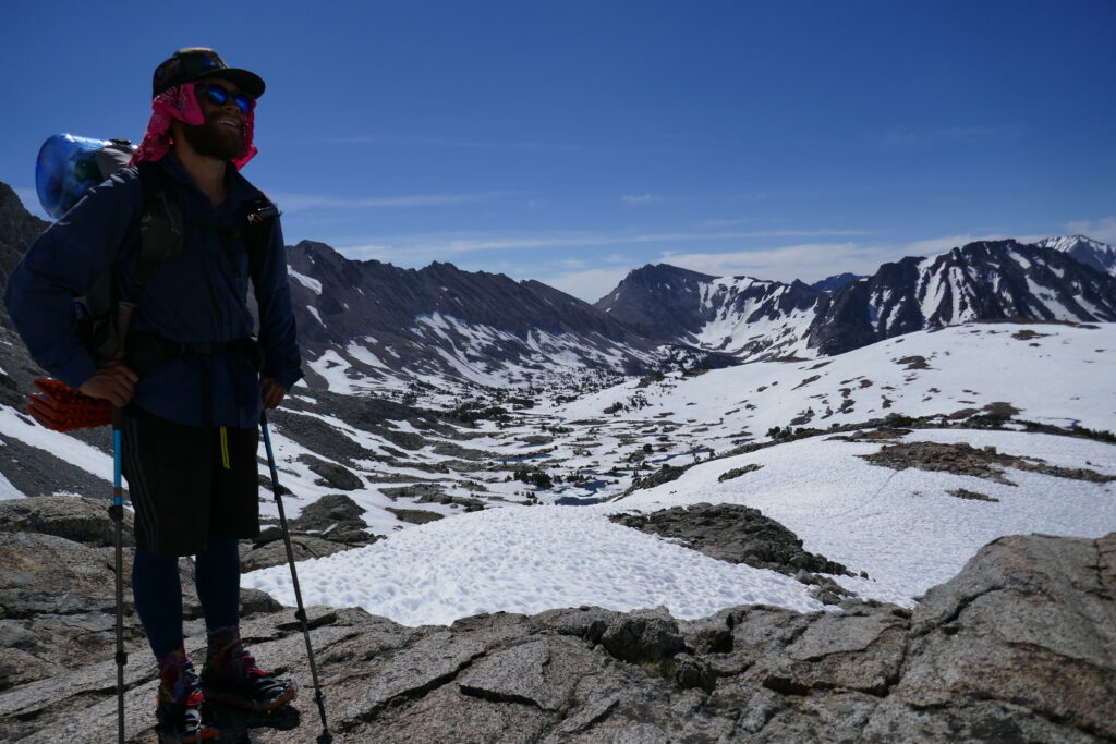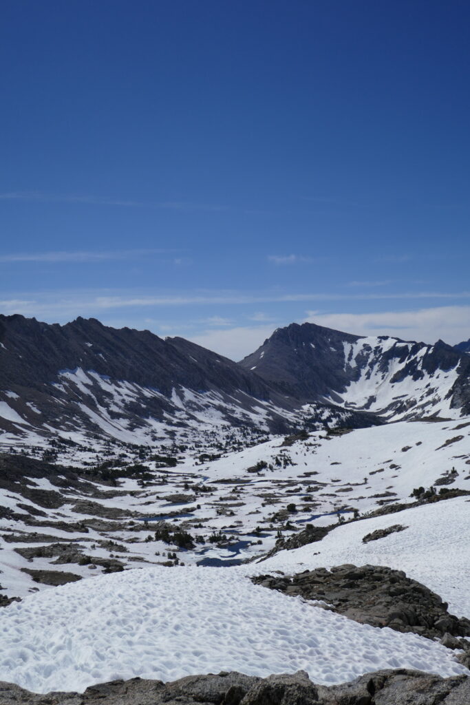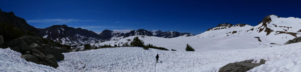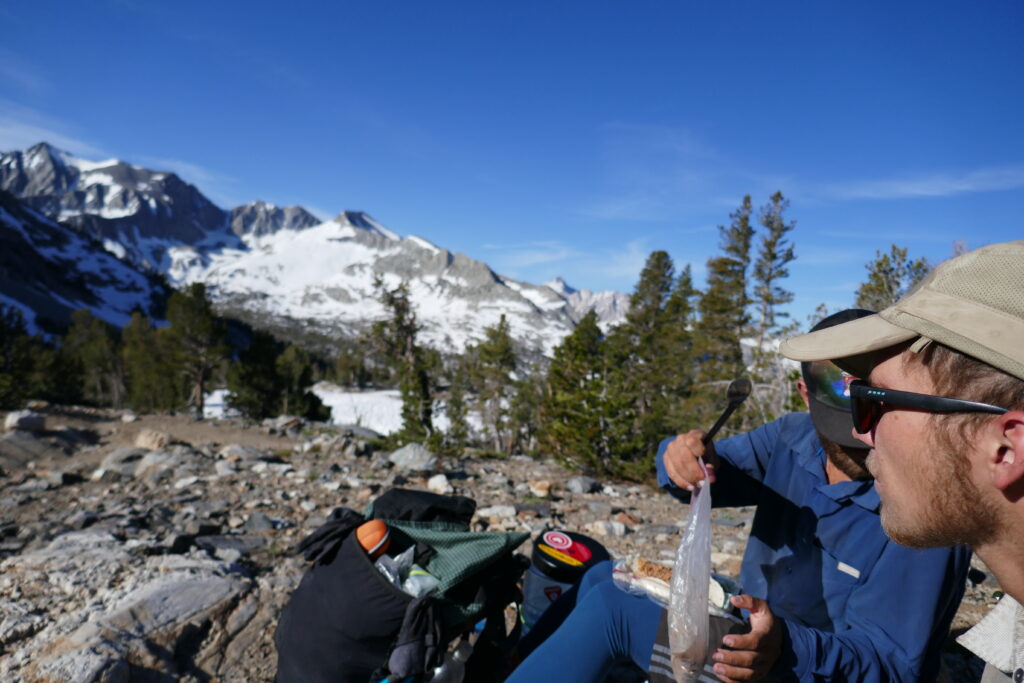 Pinchot Pass stand auf dem Programm. Das ist kein schwieriger oder gefährlicher Pass und so schliefen wir etwas länger. Wir frühstückten in der Sonne und liefen dann eine ganze Weile durch Schnee. Auf der anderen Seite wurde es anstrengend. Bis zum frühen Nachmittag mussten wir durch das unwegsame, schneebedeckte Gelände gehen. Der Weg war nur sehr selten zu erkennen und so liefen wir Pi mal Daumen nach GPS und überholten nach und nach die anderen PCTler. Als wir Mittagspause unter einem Baum im schneefreien Schatten machten konnten wir die fluchenden Wanderer schon von weitem hören.