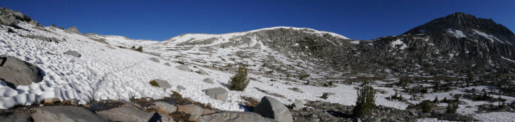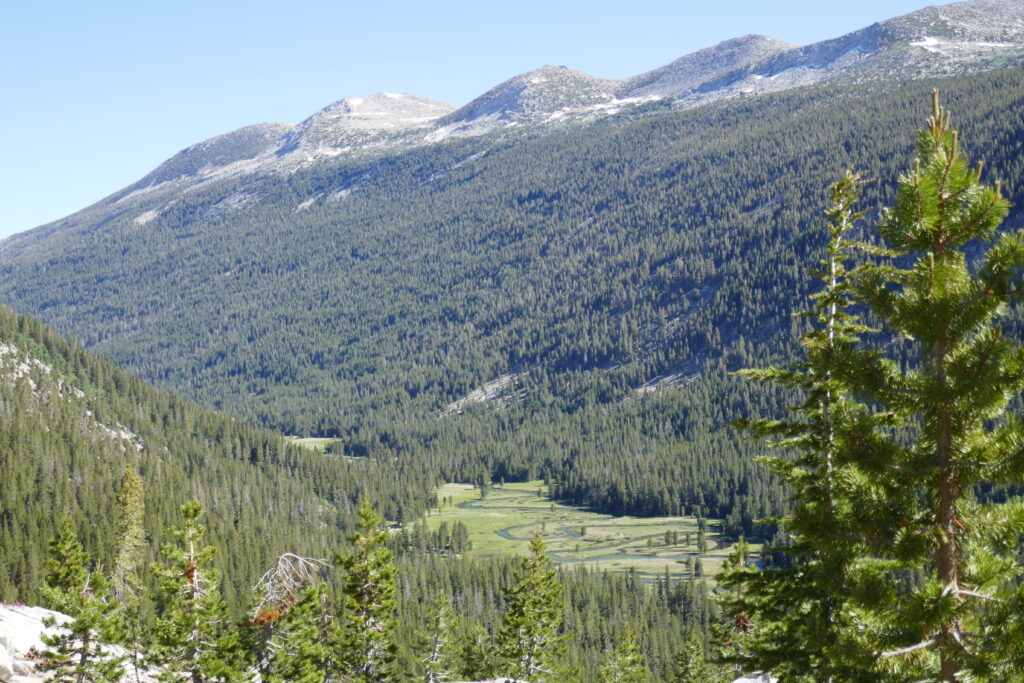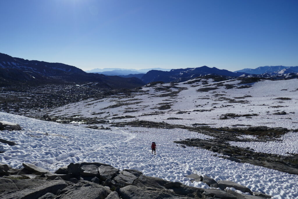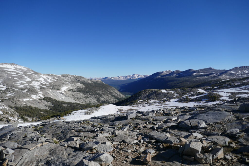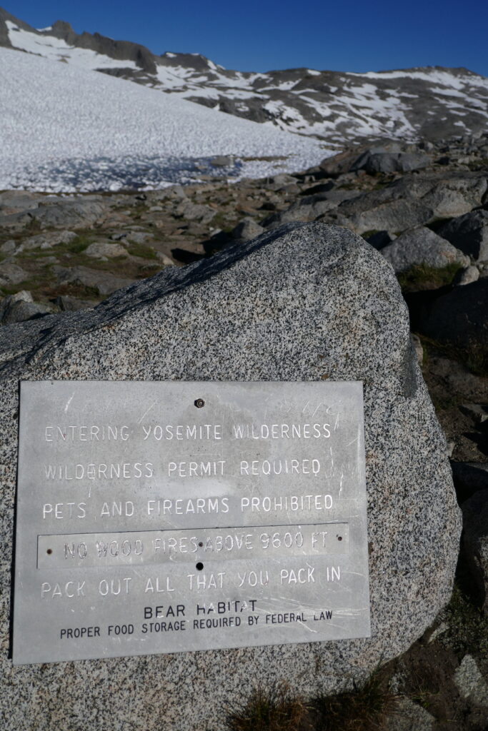 Heute morgen sind wir auf den Donohue Pass gestiegen. Es war nur ein bisschen schneeig und gar nicht gefährlich. Oben haben wir die Grenze zum Yosemite überschritten. Ich habe es gar nicht mit bekommen. Der Donohue Pass ist der letzte höhere Pass gewesen. Ab hier werden wir nicht mehr durch nennenswerte Schneemengen kommen, glauben wir jedenfalls. Wir haben einen letzten ungehinderten Blick auf die verschneite High Sierra genießen können und vor uns erstreckten sich weite Berge, bedeckt mit Wald und viel hügelförmiger anstatt der schroffen High Sierra.