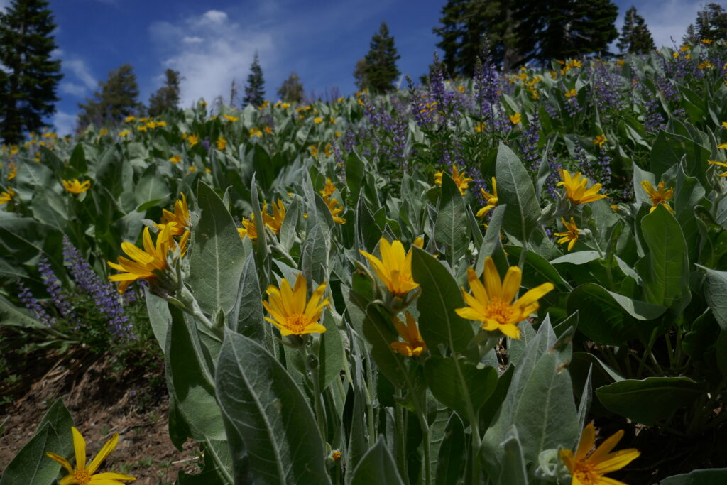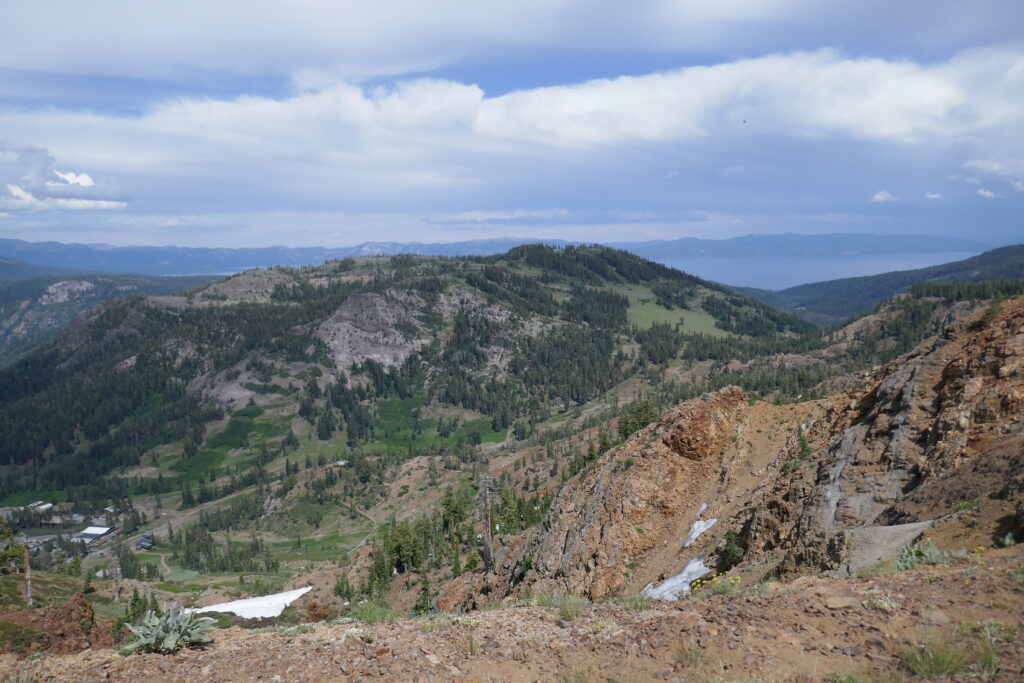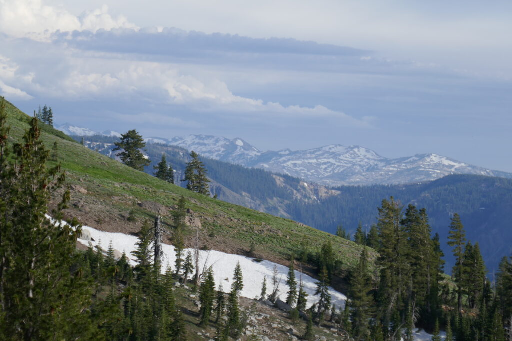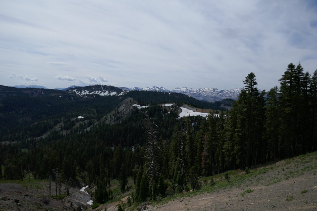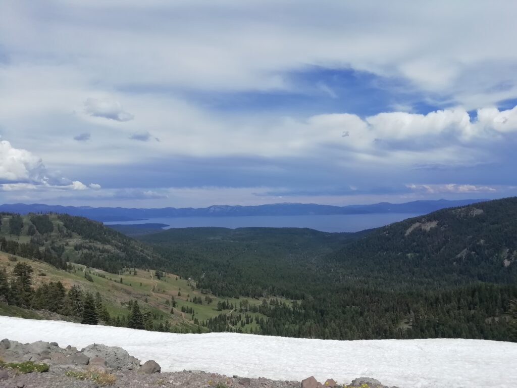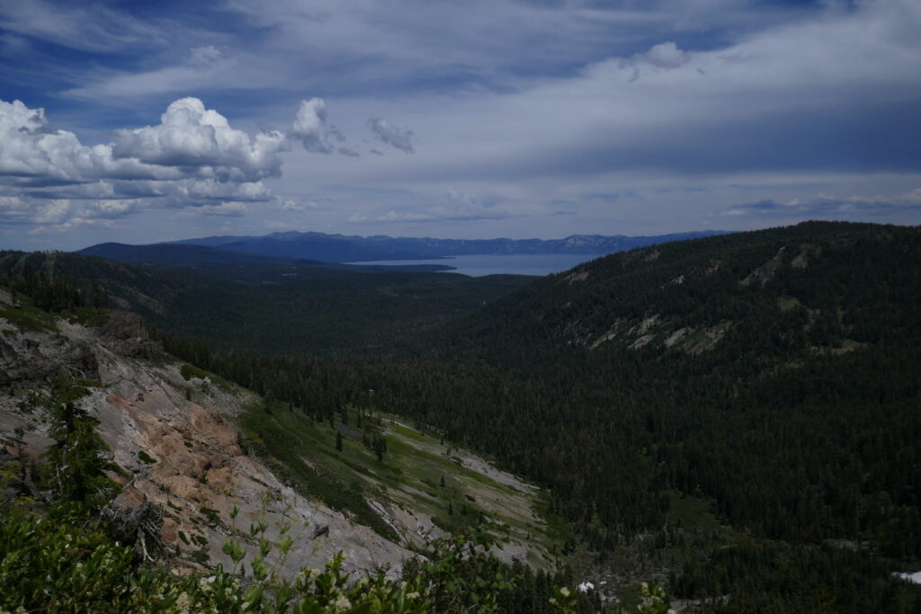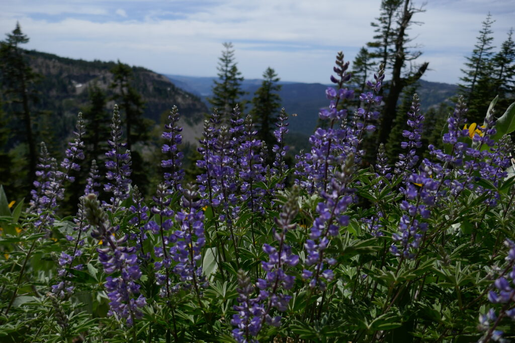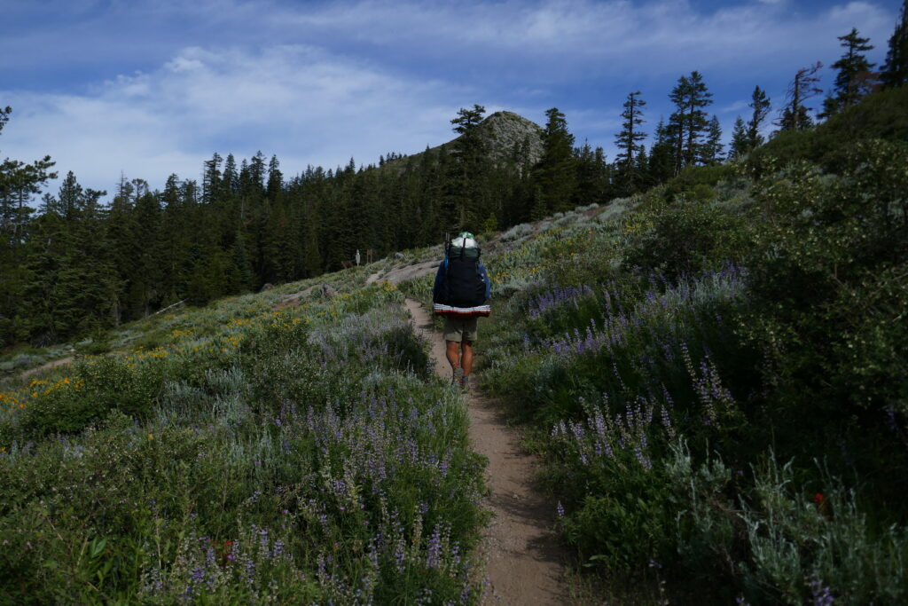 Der heutige Tag war ein sehr abwechslungsreicher. Wir liefen durch Blumenwiesen, Geröllfelder, Skigebiete und hohe Wälder voller Flechten. Zwischendurch gingen wir oft auf dem Grat und hatten so ungewöhnlich viele schöne Ausblicke. Wir konnten letzte Blicke auf Lake Tahoe genießen und sahen schneebedeckte Berge hinter uns.
