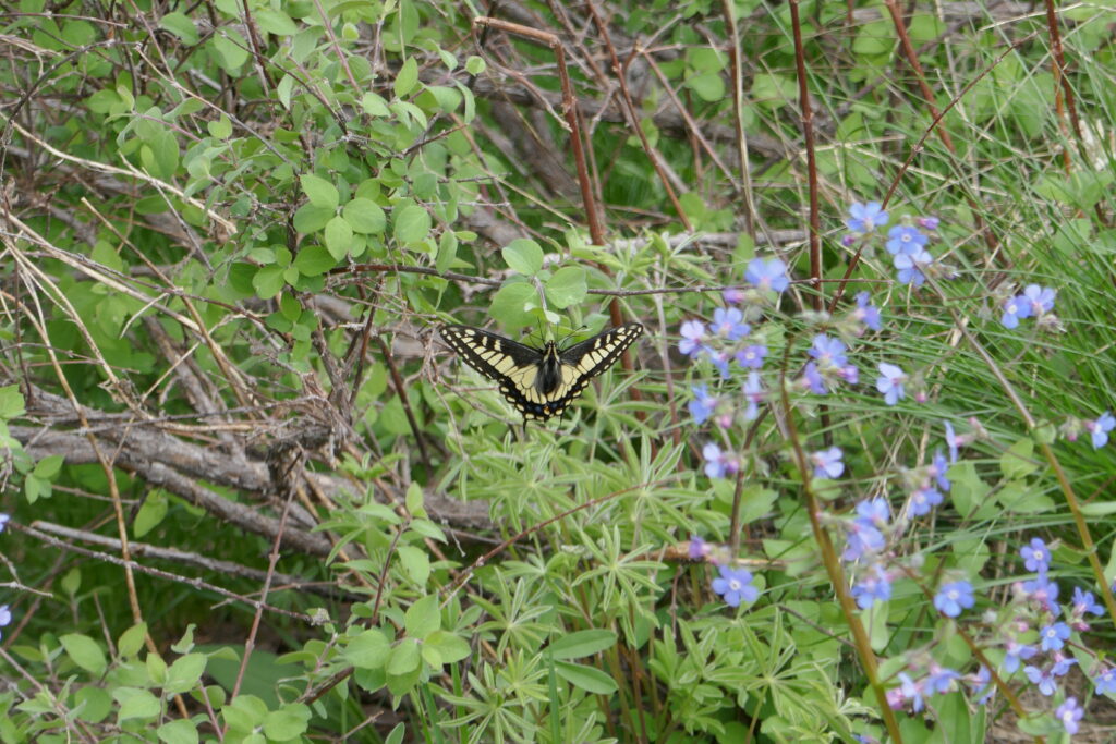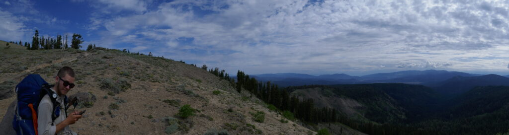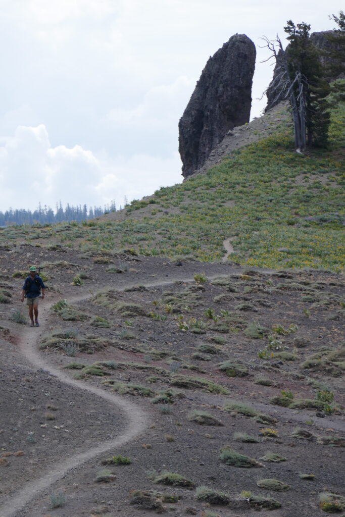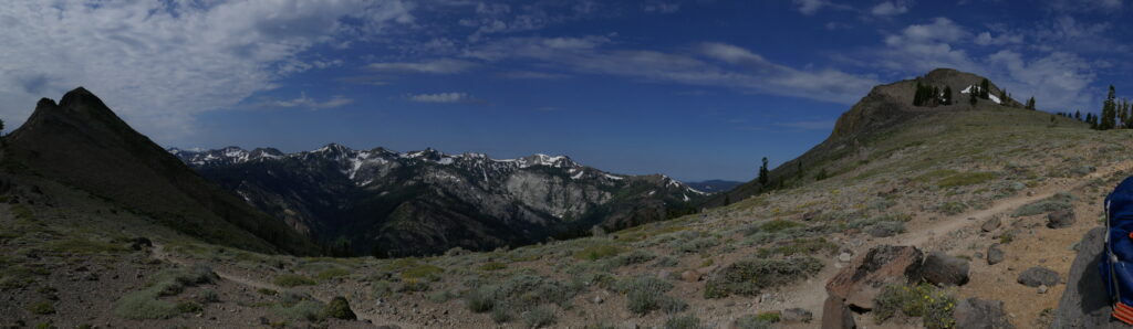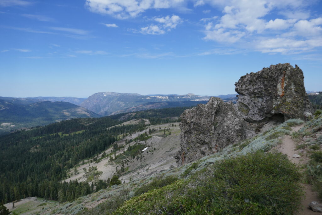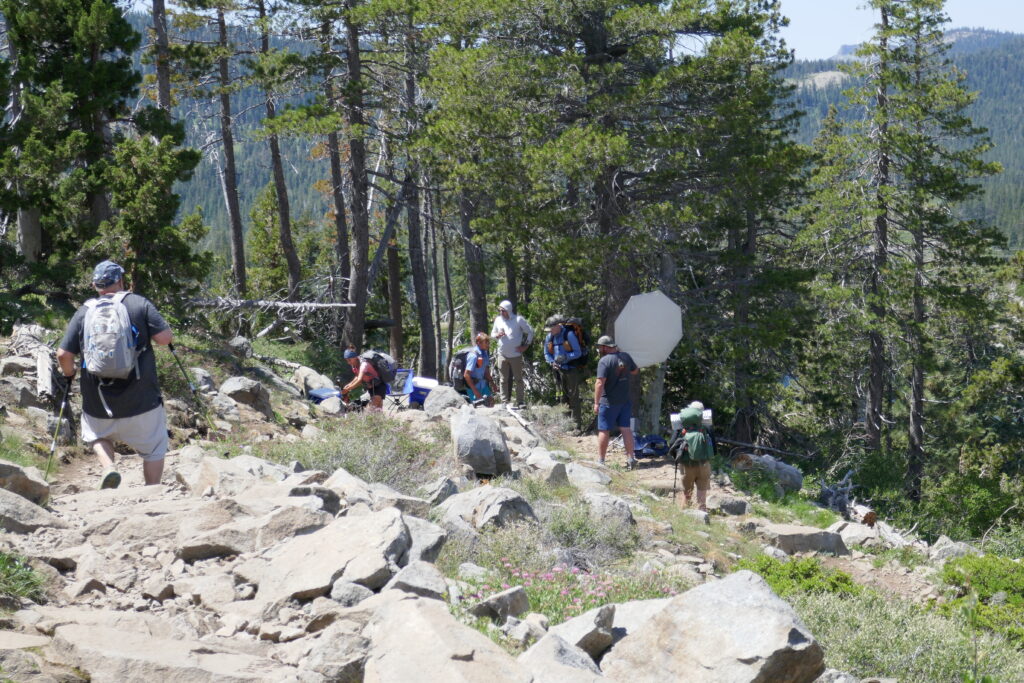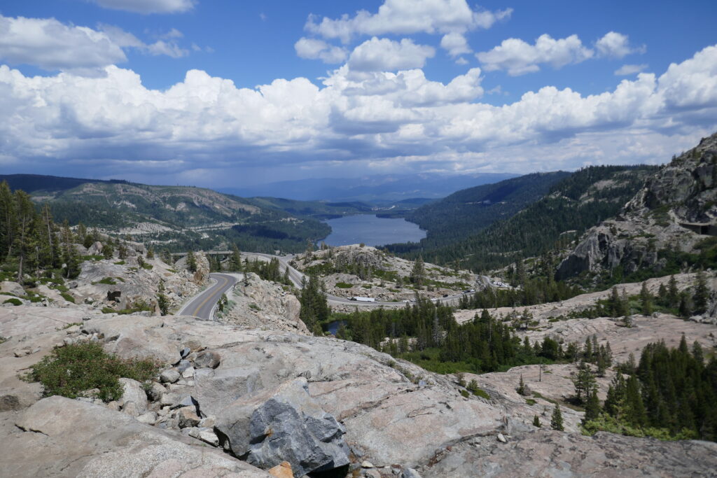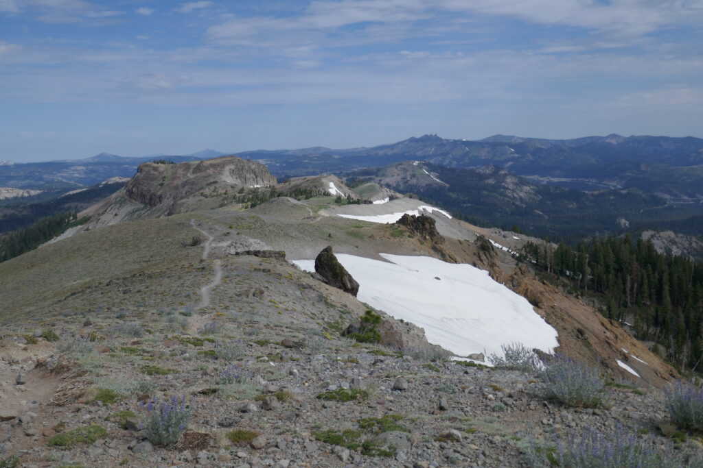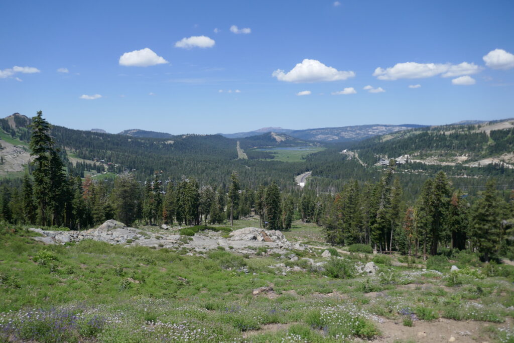 Heute sind wir viel durch Blumenwiesen gelaufen. Es gibt kniehohe Blumen mit gelben Blüten und dicken haarigen Blättern. Dazwischen stehen wie von einem Gärtner beabsichtigt blaulila Stauden, weiße und rote kleinere Blümchen. Morgens ging es bergab, kurz bergauf und weiter bergab. Wir konnten letzte, wunderschöne Blicke auf Lake Tahoe erhaschen. Uns kamen immer mehr Tageswanderer entgegen, umso näher wir Donner Pass kamen. Tageswanderer stören ein bisschen, weil wir viel schneller sind müssen wir dauernd überholen. Außerdem muss man oft warten wenn einem eine Gruppe entgegen kommt. Das hört sich vielleicht arrogant und nach meckern auf hohem Niveau an, aber es ist echt anstrengend und stört den Flow.