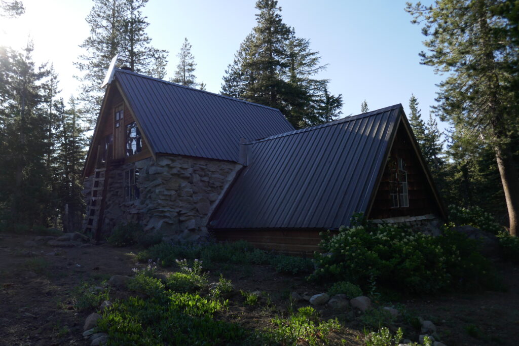 Als wir gegen drei Uhr weiter gingen war ich ganz schön betrunken von dem Bier. Das Laufen ging so ganz gut. Wir hatten einen schönen Blick auf einen See mit Booten darauf, einen alten Tunnel und Kletterer. Später holten wir Wasser an einem Interstate Parkplatz, nachdem wir die Unterführung benutzt hatten. Dann bestiegen wir einen kleinen Pass und machten kurz darauf an der Peter Grubb Hütte Abendessen. Das ist eine Hütte, die der Sierra Club unterhält. Sie ist unbewirtet, aber ziemlich cool. Besonders beeindruckt waren wir von dem fakultativen Wintereingang im ersten Stock.