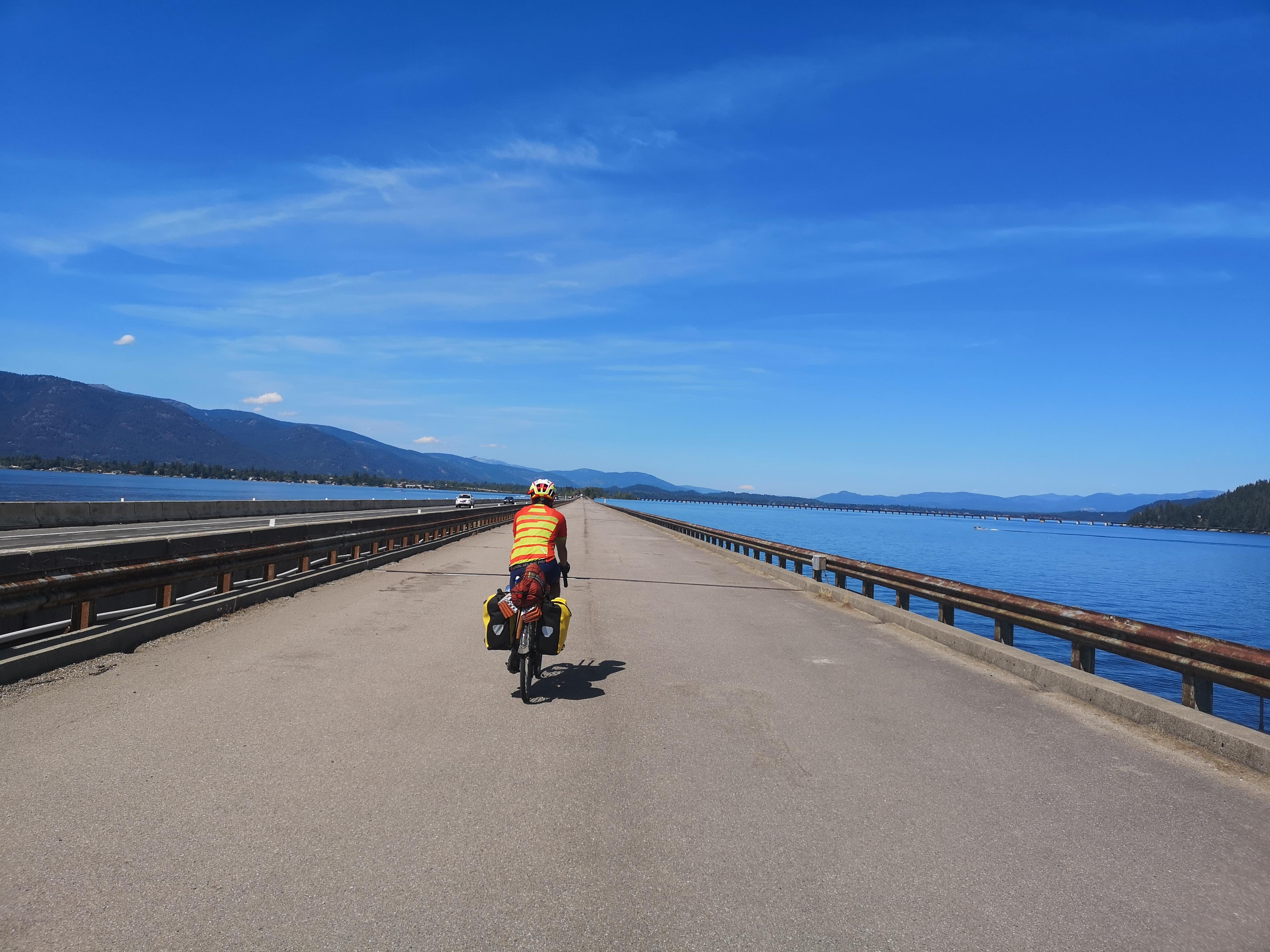 Es geht durch ein Indianerreservat, in traumhaften Tälern entlang auf fast verlassenen Highways. Ich habe meinen ersten Platten und endlich erreichen wir Idaho, wo wir in Sandpoint am Lake Oreille, der 105 km lang und eine Fläche von 338km² hat, einen ruhigeren Tag machen.