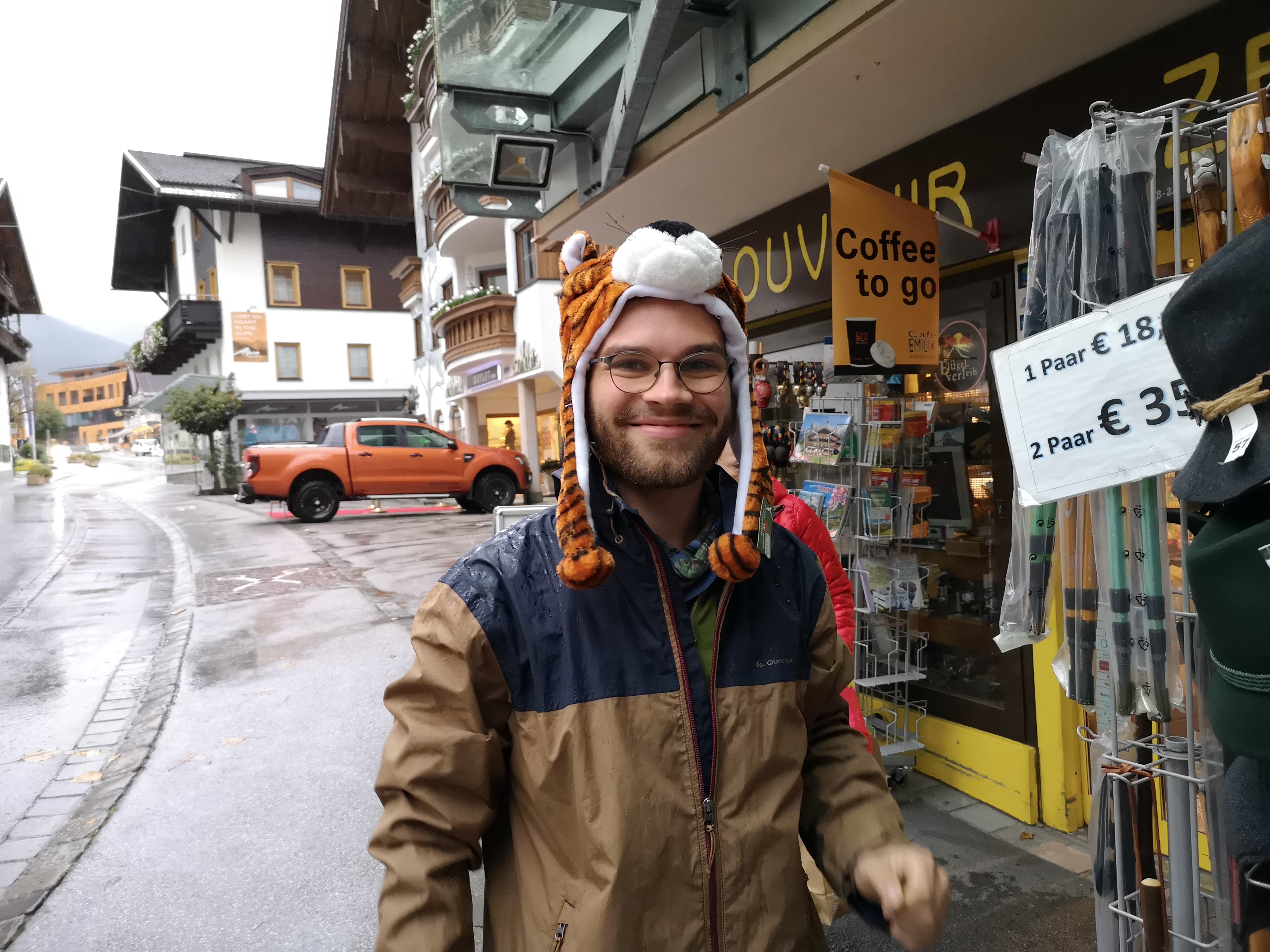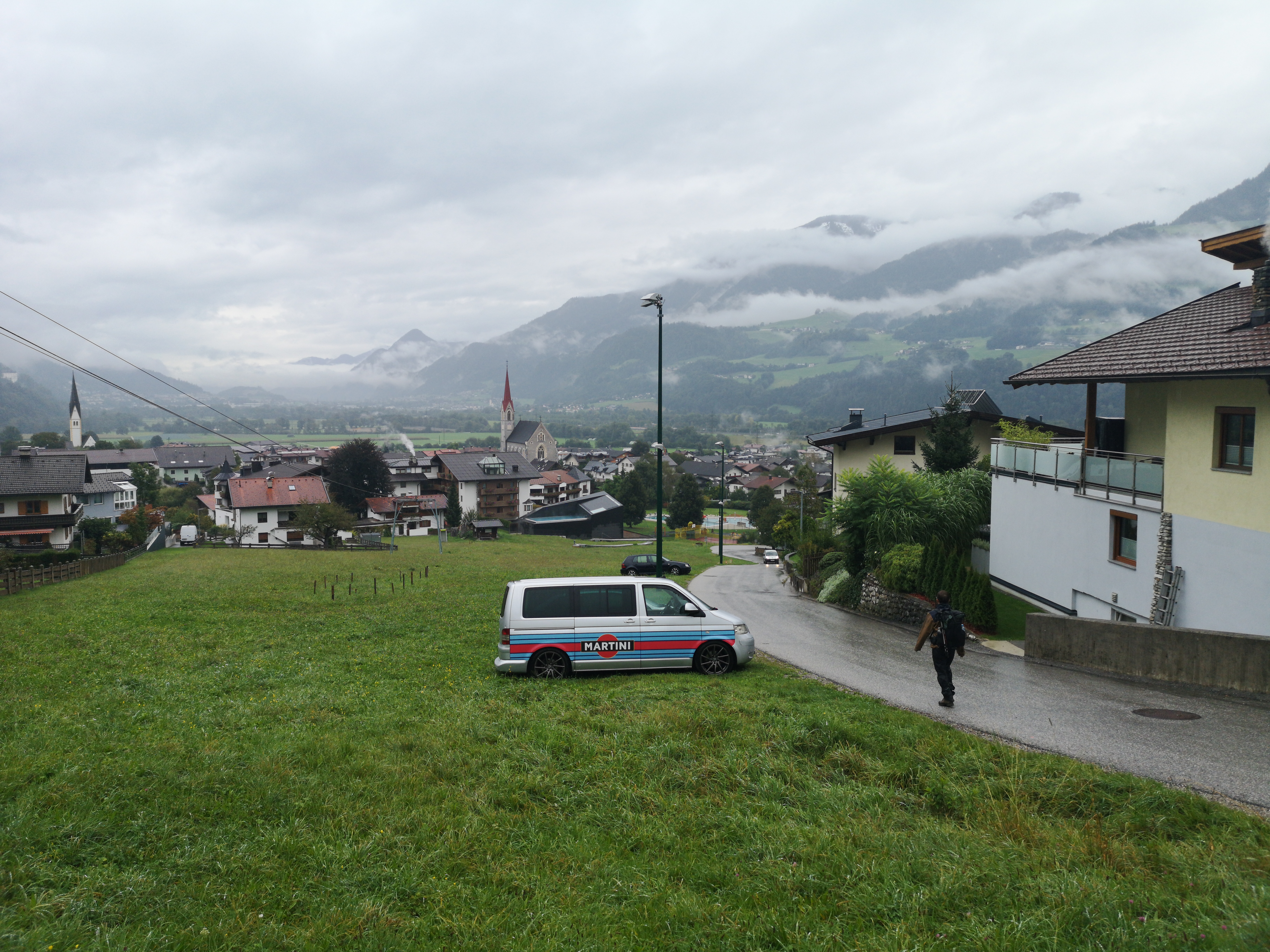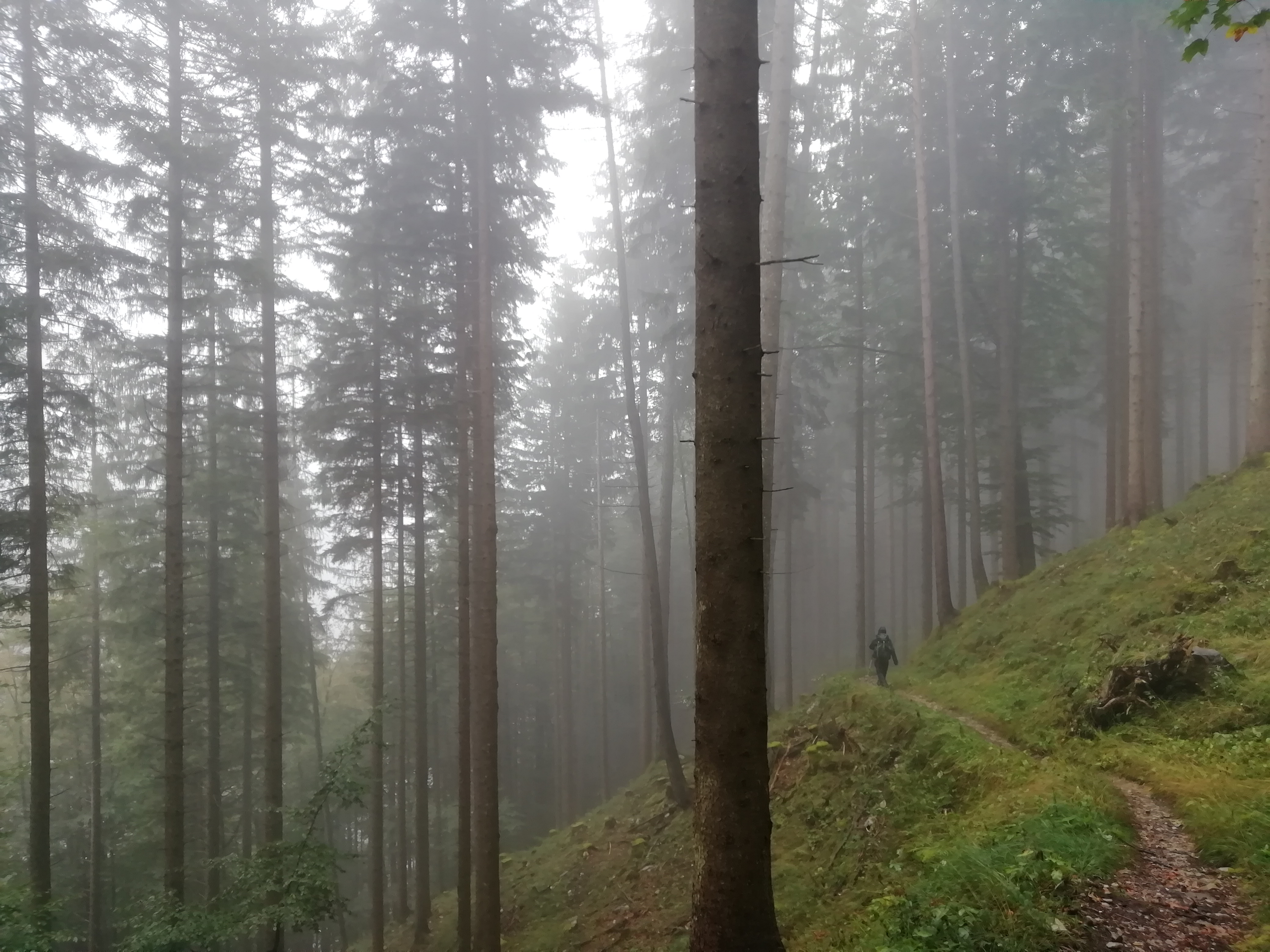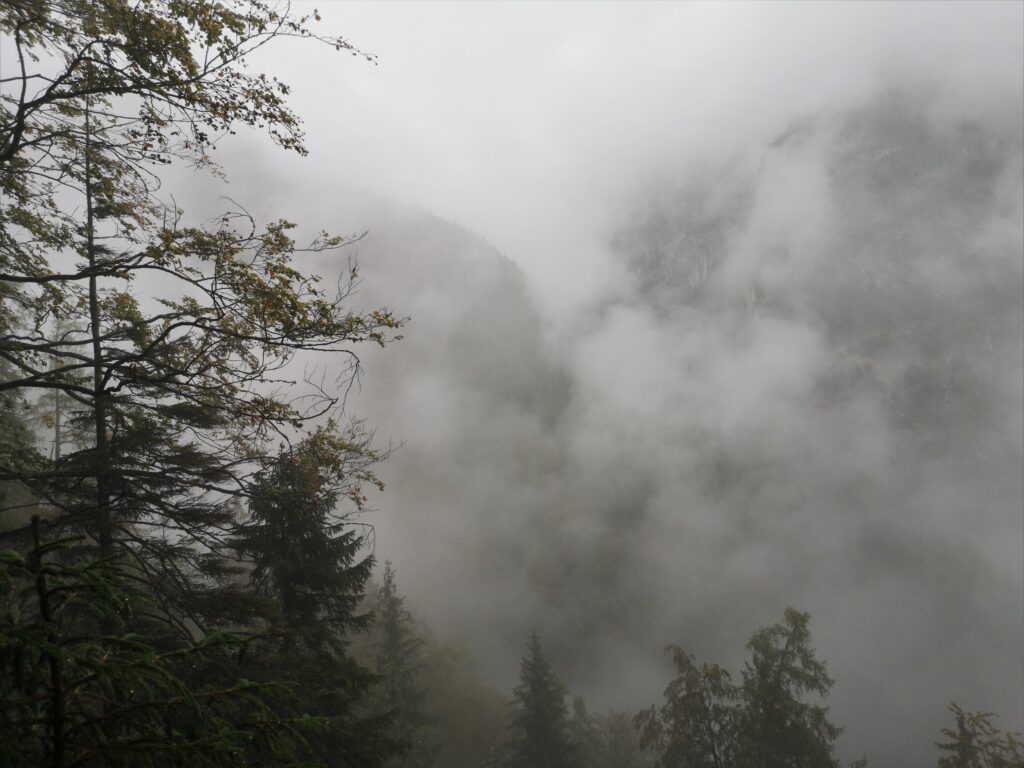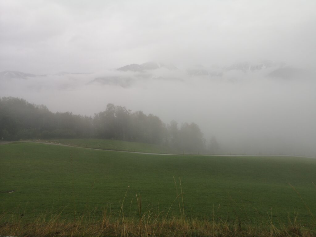 Der Weg lief ein kleines Seitental hoch, mal geschottert, mal eine Schlammschlacht. Es ging an kleinen Skipisten/Weiden vorbei und durch Laubwald. Das Tal wurde immer enger und bald fühlte man sich wirklich wie in den Bergen. Die Sicht war ein bisschen Mau weil wir in den Wolken gewandert sind bzw. diese sehr tief hingen. Nach einiger Zeit haben wir merkwürdige Geräusche gehört. Wir dachten zuerst es sei der Wind, der an Stromleitungen jault. Dann tippten wir auf entfernte Kühe.