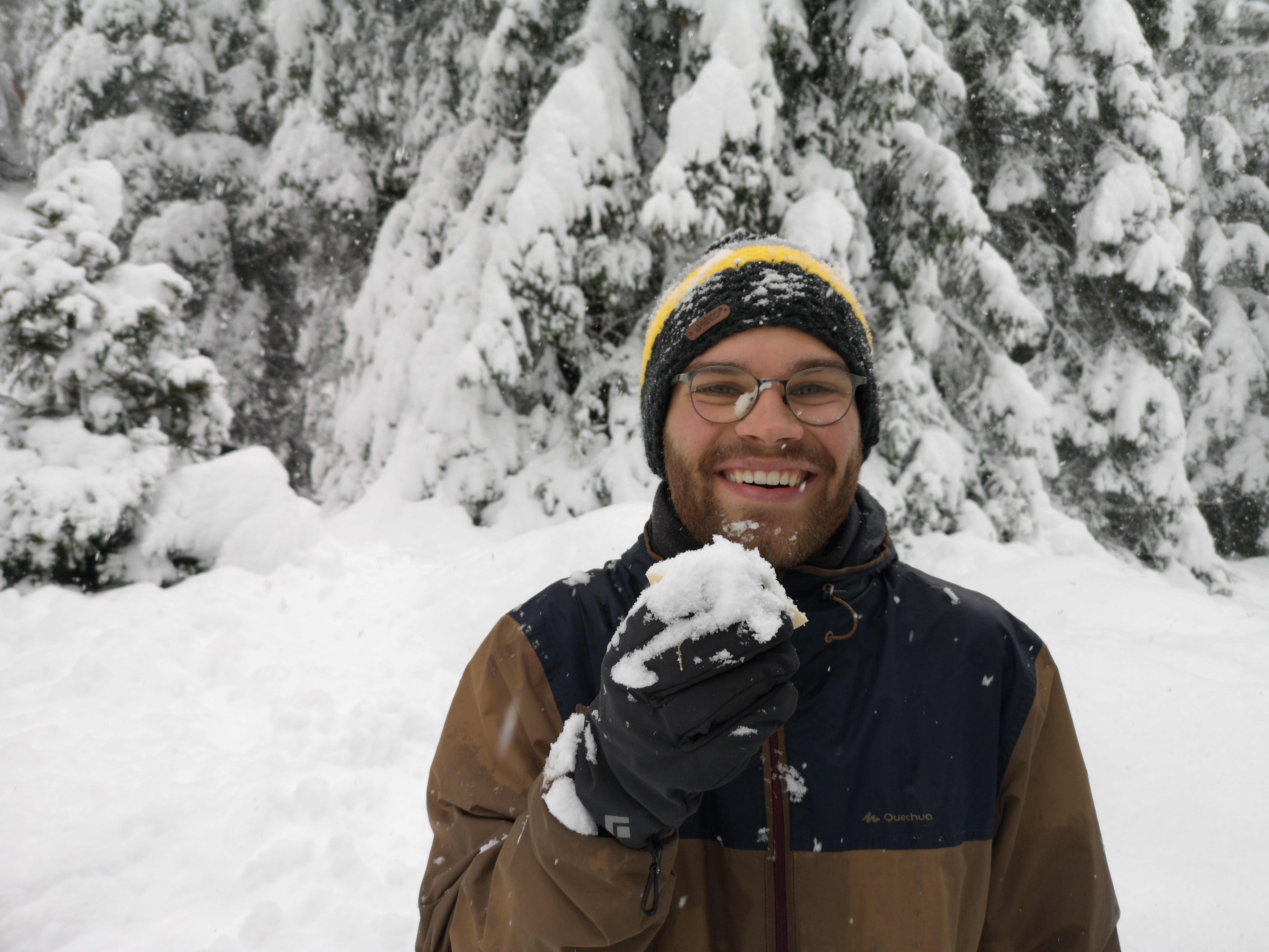 Tim hat sich bei unserer Mittagspause erfolgreich von eine schneebedeckten Baum berieseln lassen.
