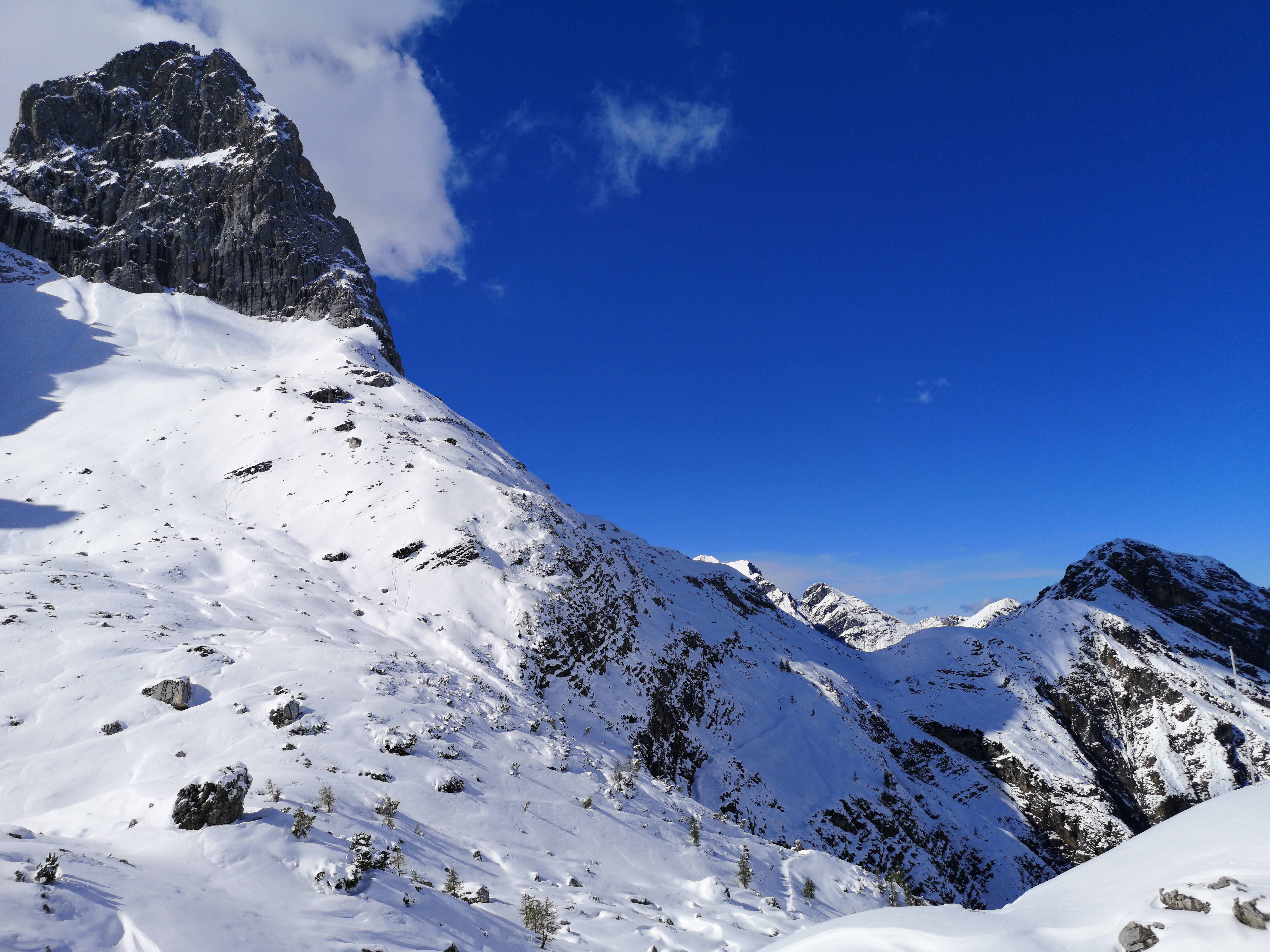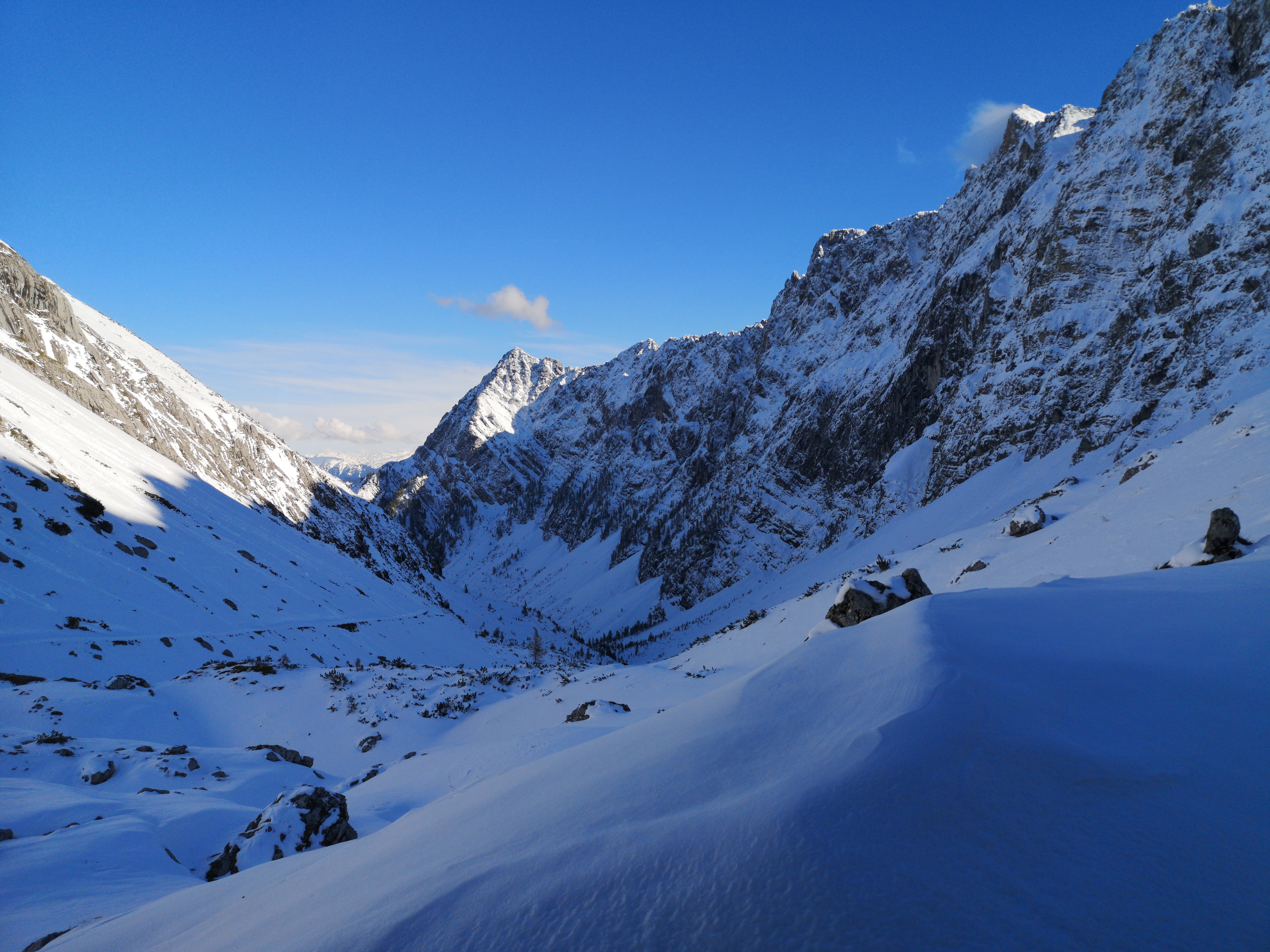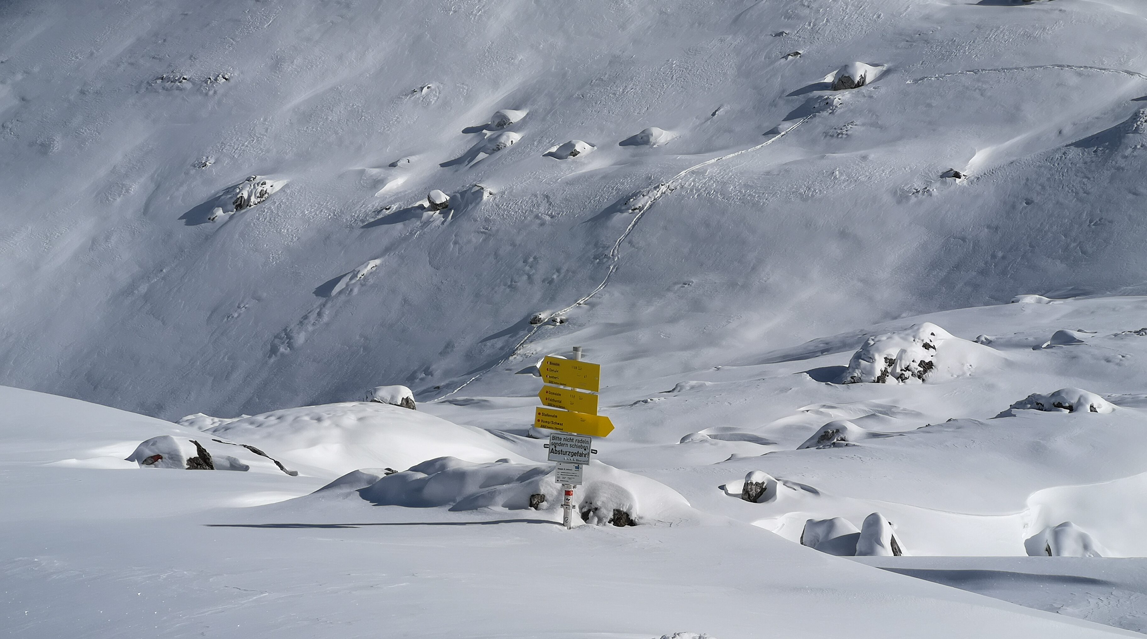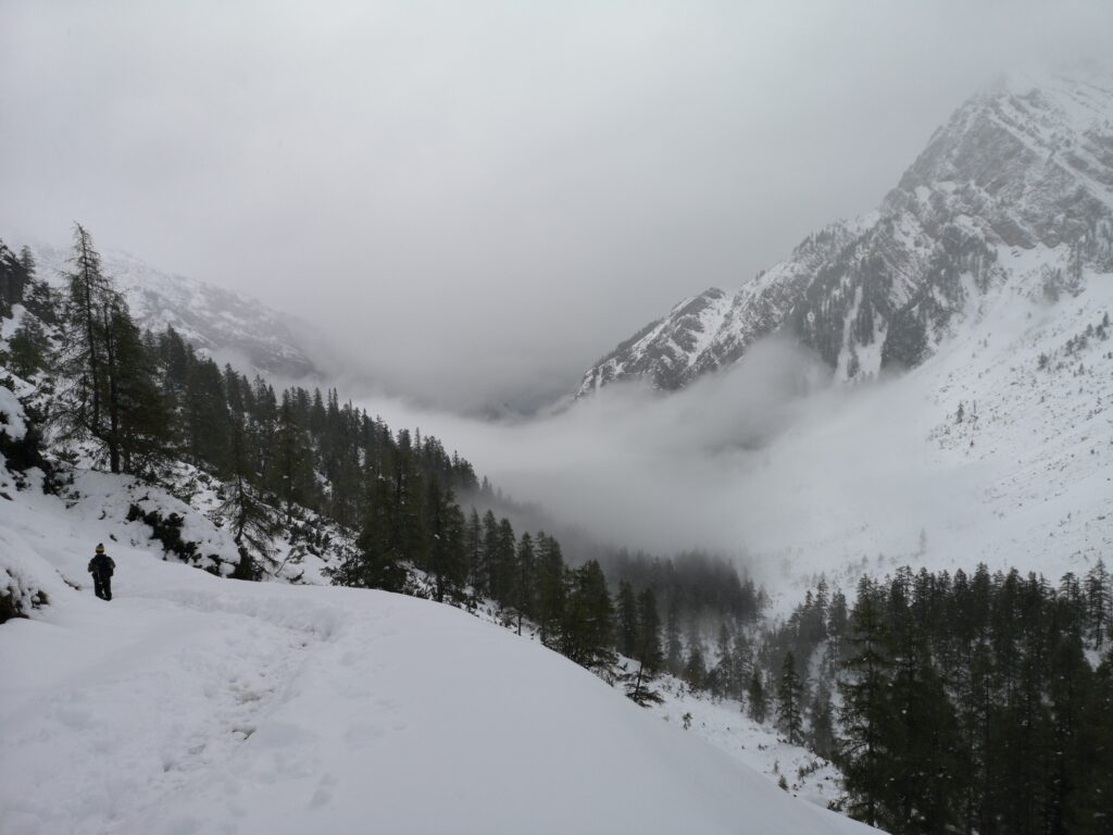 Weiter ging es durch den Schnee und es wurde langsam klar, dass die 30 cm Schnee Vorhersage vielleicht etwas niedriger war als die Realität. Wanderer die uns entgegen kamen berichteten von 60 cm an der Hütte. Wir hatten großes Glück: alle 16 Wanderer auf der Hütte waren abgestiegen und hatten uns so eine Spur durch den hohen Schnee gelegt. Ohne die Spur hätten wir auf jeden Fall umdrehen müssen. Einer der Wanderer kam uns mit einem Mountainbike über der Schulter entgegen. – Er hatte sich die Talabfahrt sicher anders vorgestellt.