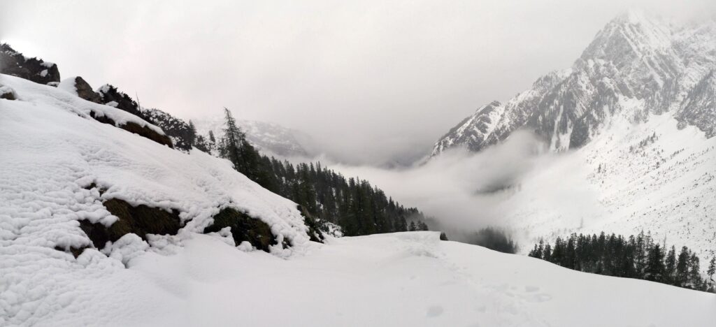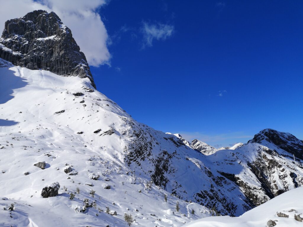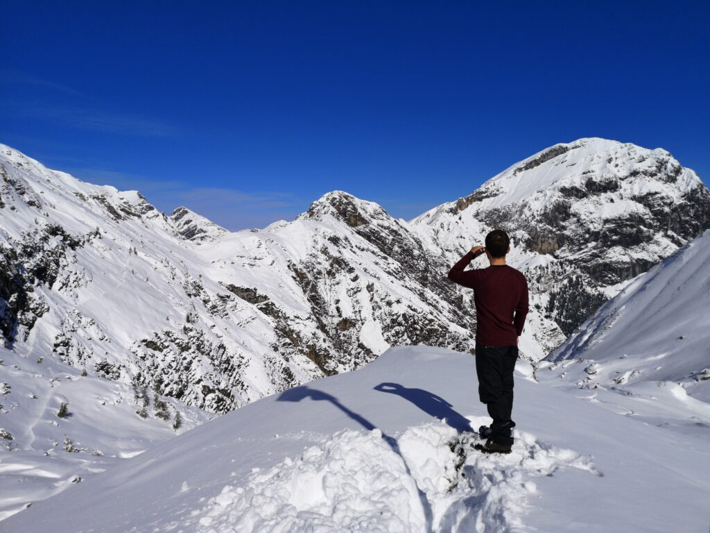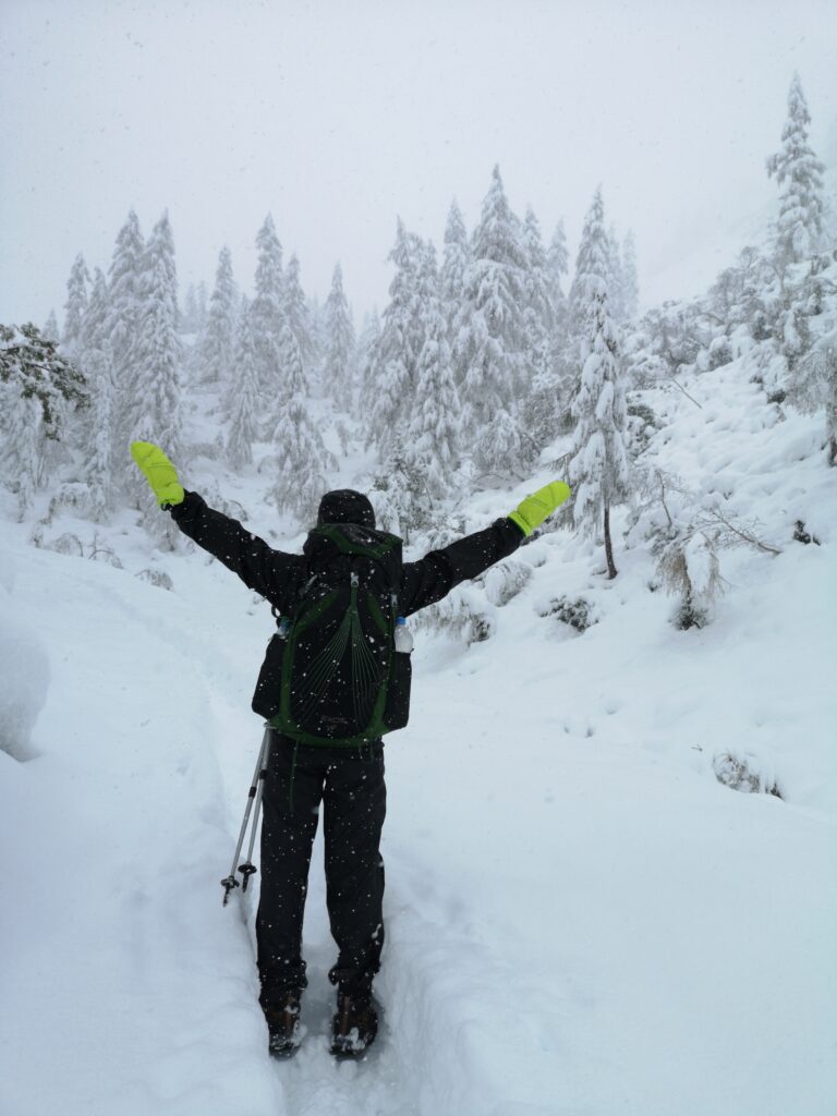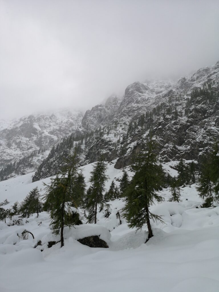 Ich bin sehr froh, dass wir uns trotz der widrigen Bedingungen dafür entschieden haben, es einfach zu probieren und zu schauen wie weit wir kommen. Trotz der leider kurzen Wanderung haben wir spektakuläre Natur erleben können und mir wurde einmal mehr klar, wie viel entspannter es ist, sich nicht an irgendwelchen selbst gesteckten Zielen fest zu klammern sondern gerade im Urlaub, wo man sich ja erholen möchte, einfach zu schauen was kommt. So konnten wir den Tag im verschneiten Bergpanorama sehr genießen!
