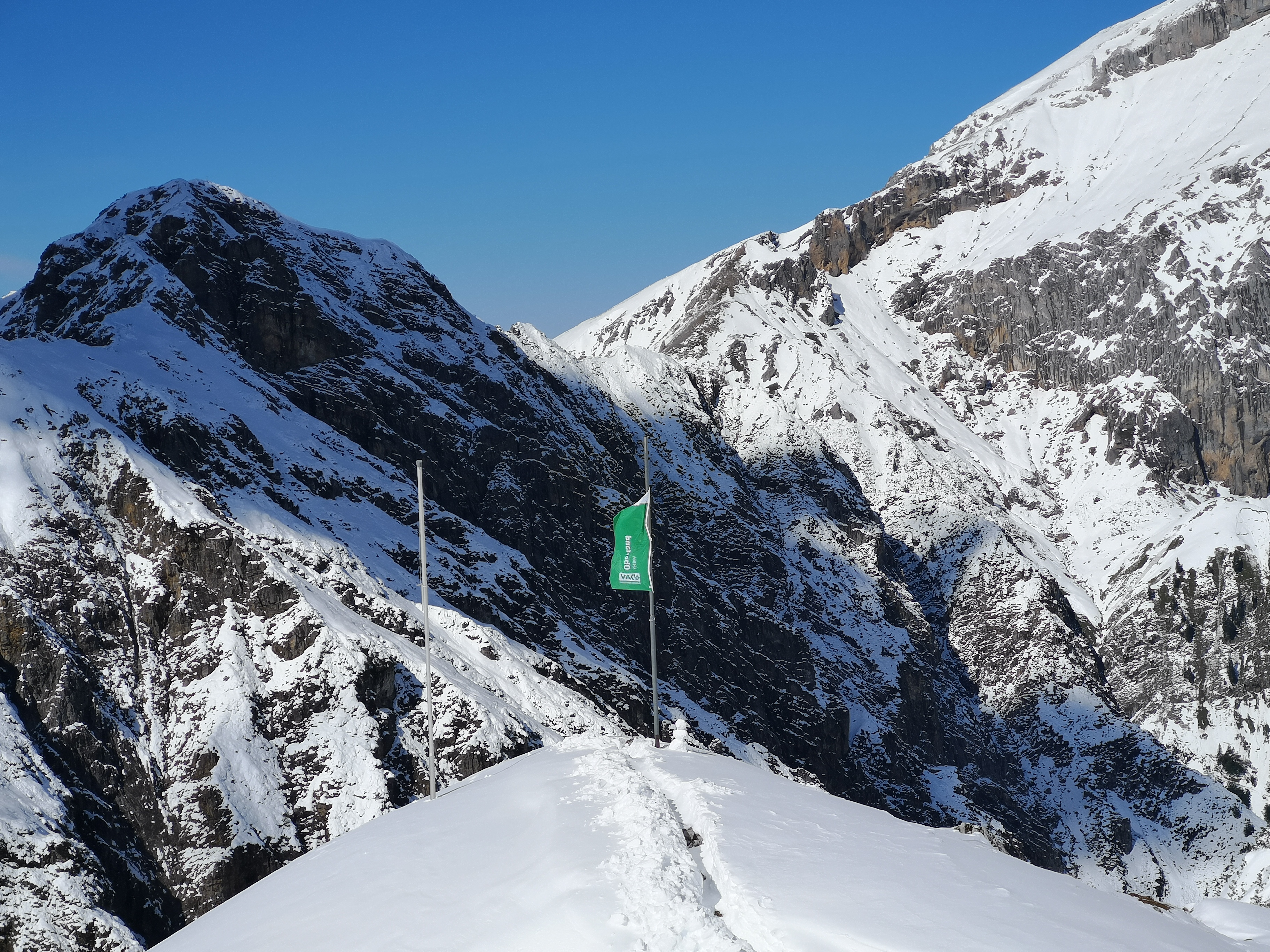 Nach einem Birchermüsli und einem Kakao schnappten wir uns die Schneeschaufel und buddelten einmal um die Hütte und zur Fahne. Es hatte die ganze Nacht geschneit und so lag nun an manchen Stellen eine ganze Menge Schnee. Die Berge waren wunderschön und wir genossen das Privileg diese Natur für uns zu haben. Wir entdeckten ein Murmeltier, das ganz entgeistert pfiff, und ein Wiesel oder Frettchen, das elegant auf der Schneedecke herumhüpfte. Ab und an lösten sich in der Felswand kleine Geröll- bzw. Eis-/Schneeabgänge was tolle Geräusche machte. Wir bauten einen Schneemann und setzten uns dann zu den Einheimischen, die an diesem schönen Sonntag auf die Hütte gekommen waren und alle mit Vornamen angesprochen wurden in die Stube. Wir haben kein Wort verstanden ^^ Deshalb haben wir viel gelesen und ab und an rausgeguckt um die Szenerie auf uns wirken zu lassen.