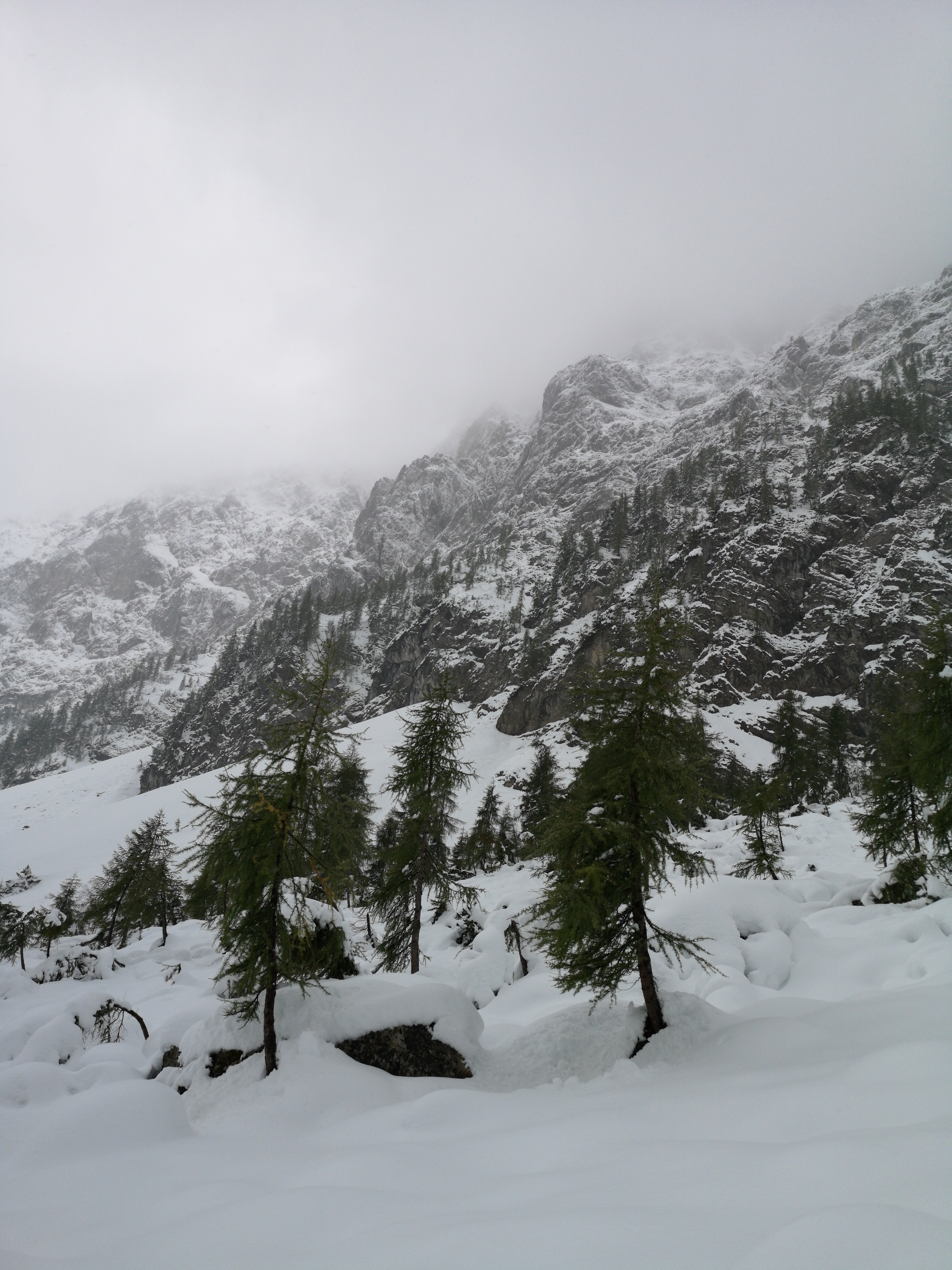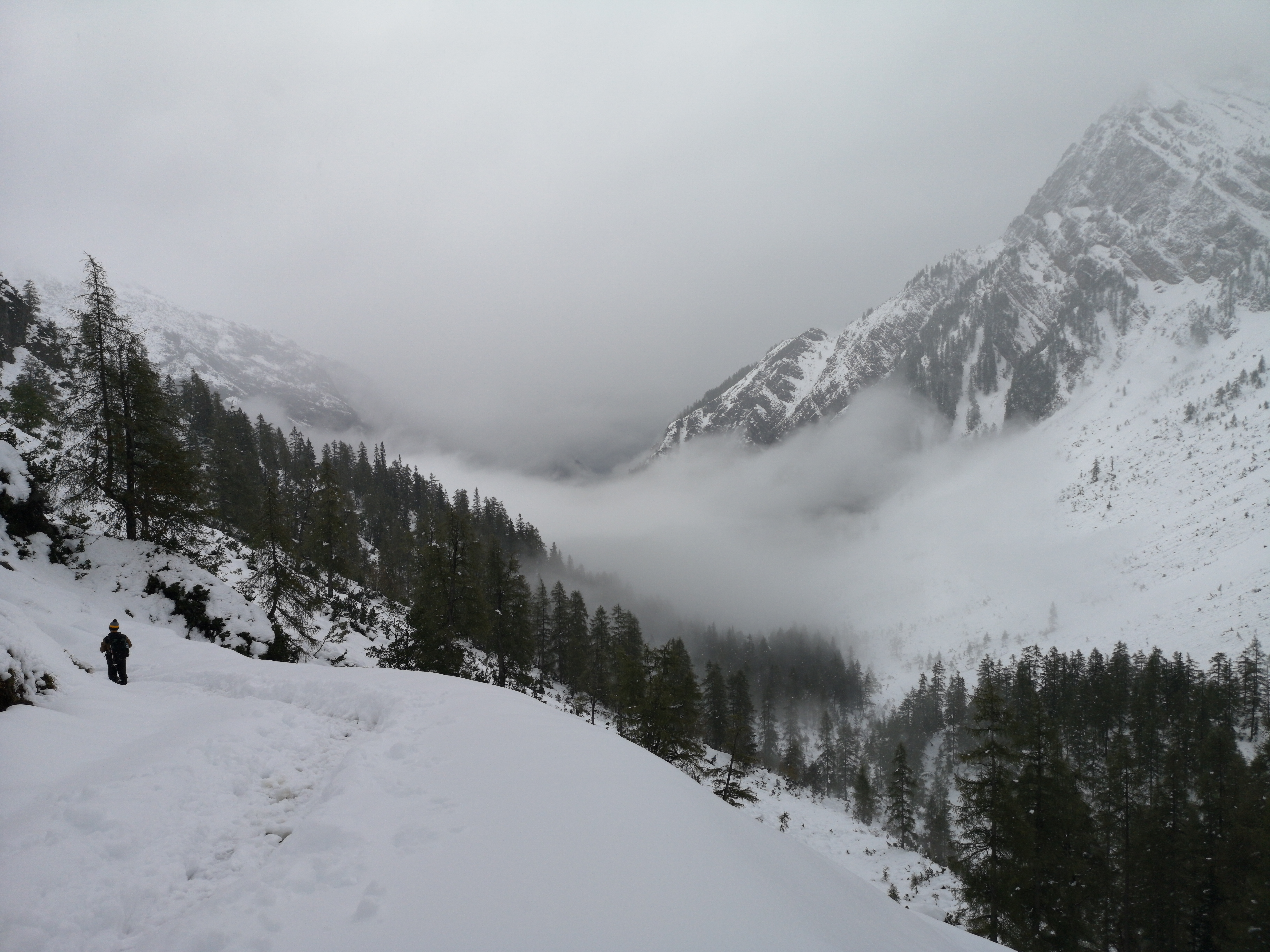 Morgens haben wir in alter Thuhiker Manier das Frühstücksbuffet leer gegessen und sind dann mit dem Bus (besser als Zillertalbahn) zurück nach Schwaz gefahren und losgewandert. Wenn die Wolken mal nicht so tief im Tal gehangen haben, konnte man weiter oben am Hang schon weiß gepuderte Bäume sehen.