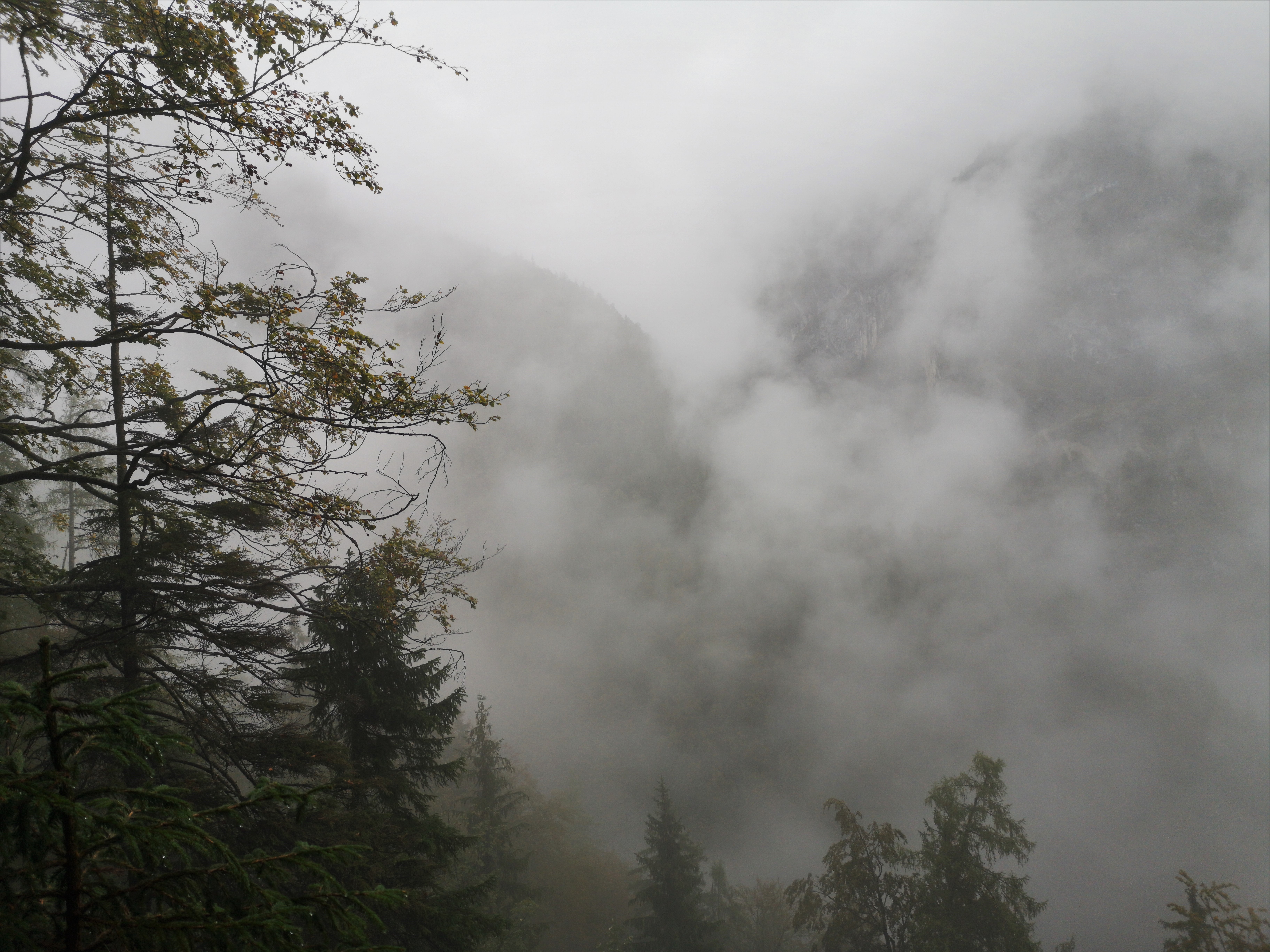 Beim Abstieg am nächsten Tag konnten wir zumindest zeitweise Blicke auf das steile und sehr schöne Tal erhaschen. Die Wolken, in denen wir liefen sorgten im Wald für eine geheimnisvolle und verwunschene Stimmung. Natürlich hat es im Tal wieder geregnet, wie hätte es auch anders sein können.