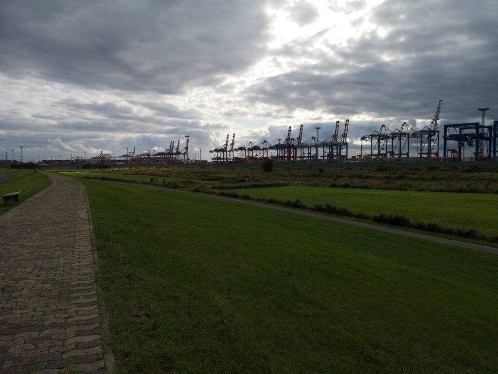 Ich beschloss anschließend, auch wenn der Weg nicht so gut geteert war, mich auf der Küstenseite des Deiches zu halten, so weit dies möglich war. Ganz am Horizont konnte man bereits die Kräne von Bremerhaven sehen, wo ich am Abend den Hafen anschaute und in der Jugendherberge das letzte freie Zimmer bekam. – Man muss auch mal Glück haben 🙂