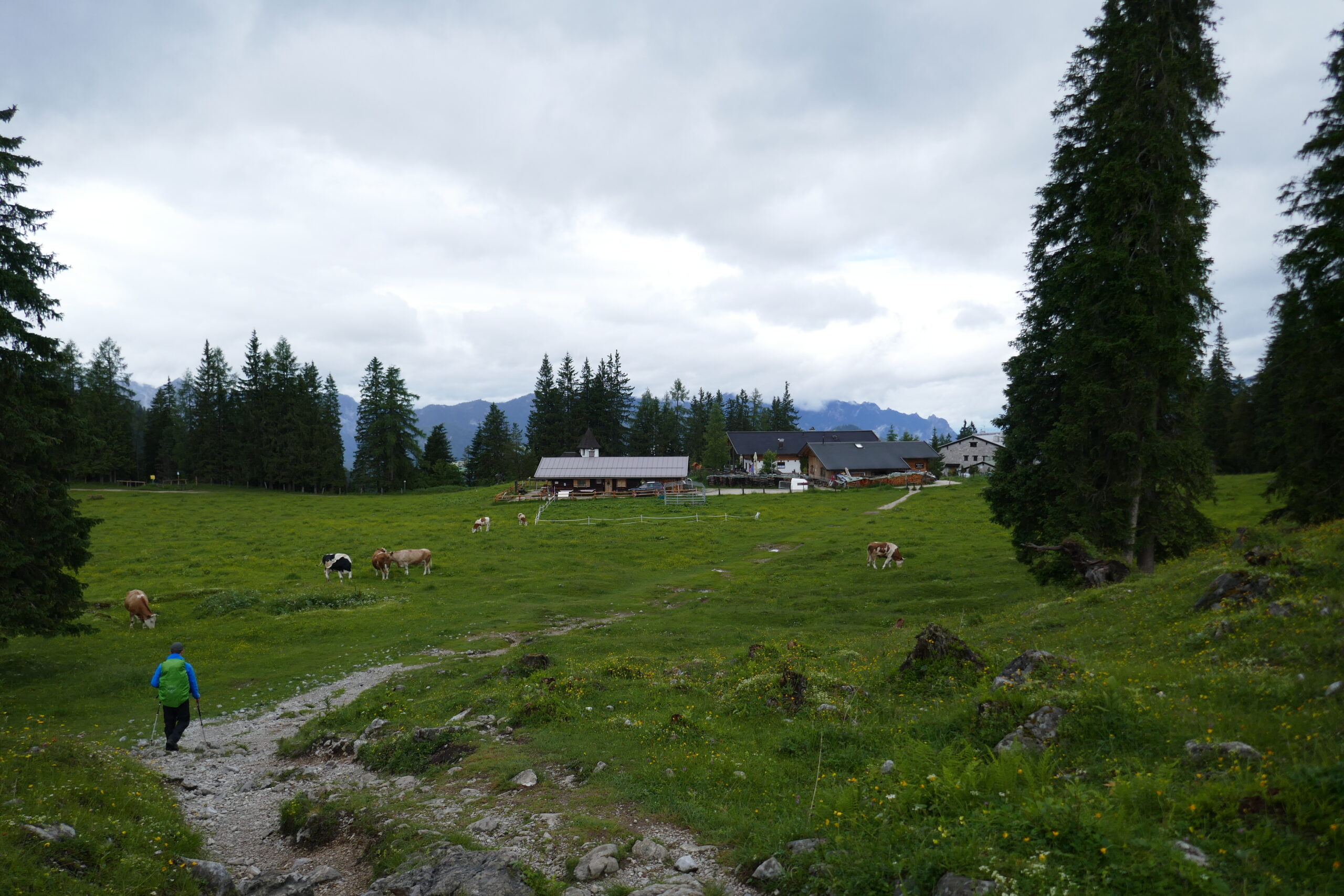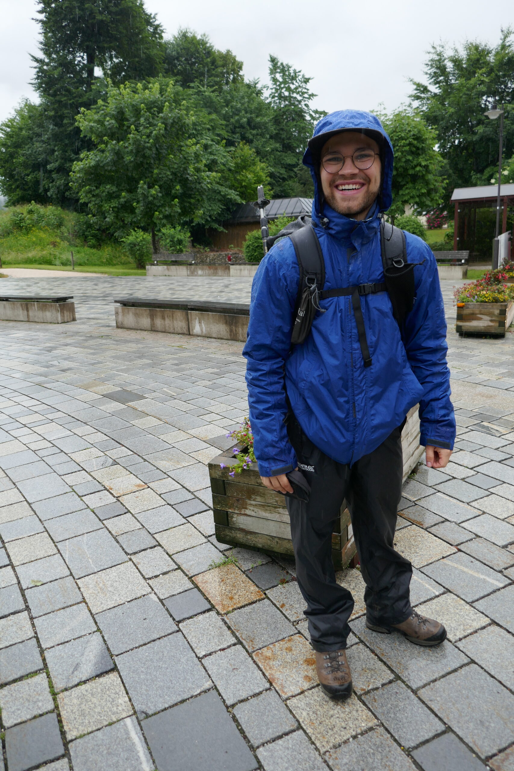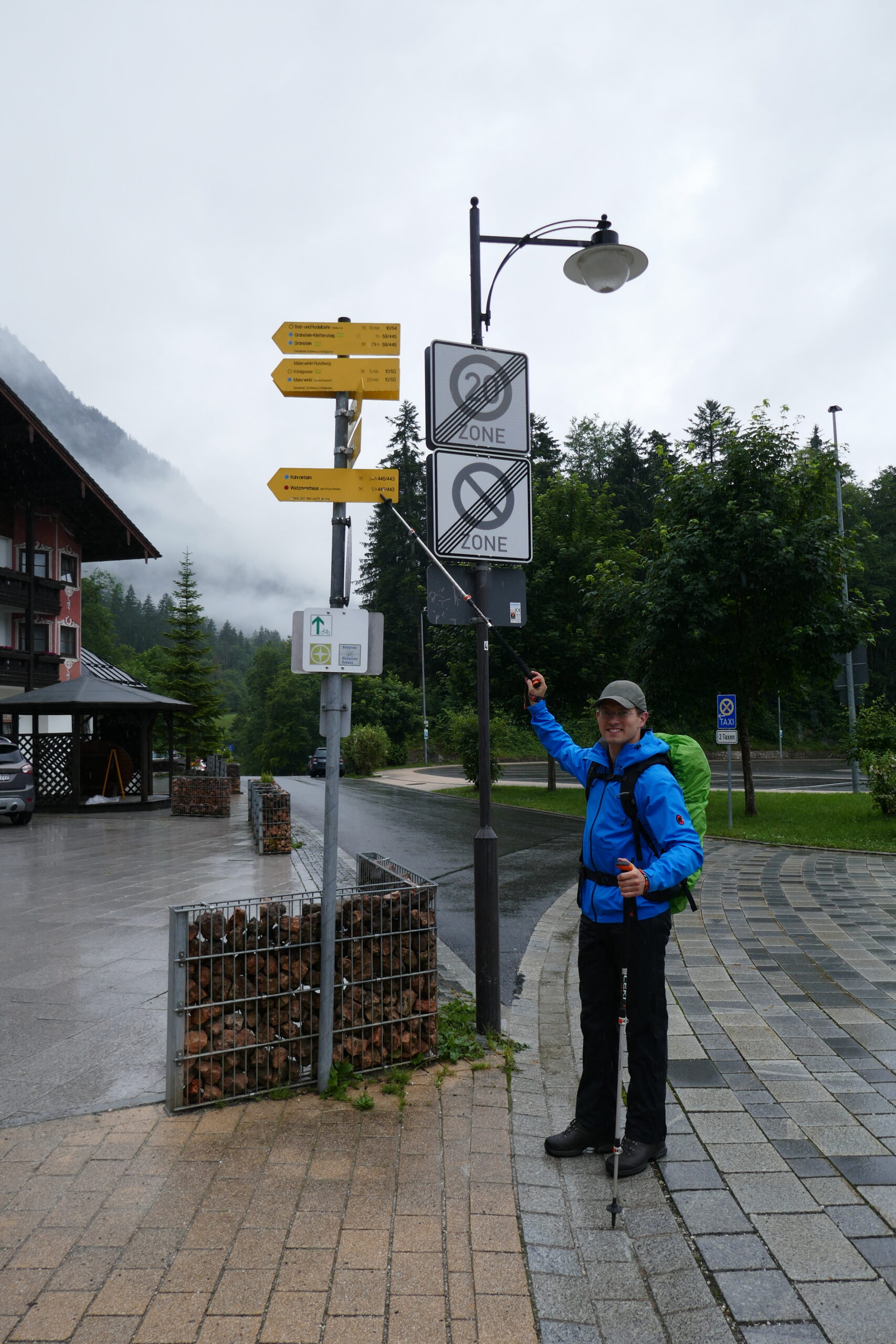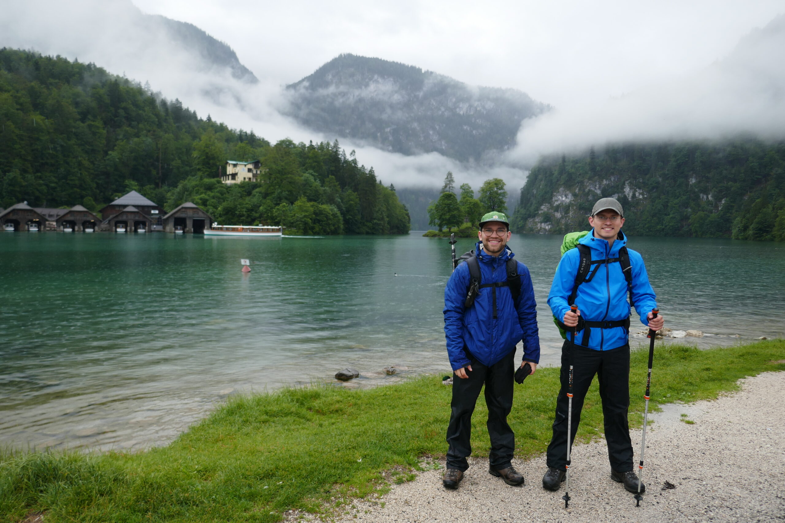 Als wir Abends mit dem Auto losfuhren war die Moral hoch und das Wetter schlecht. Es regnete die ganze Fahrt zum Königsee. Dort kamen wir um 4:15 Uhr an und machten noch ein kleines Nickerchen im Auto direkt am Wasser. Als wir nicht mehr schlafen konnten sind wir tanken gefahren, auf den großen Wanderparkplatz, haben gefrühstückt, uns fertig gemacht und sind losgezogen. Es hat geregnet, aber nicht in Strömen.