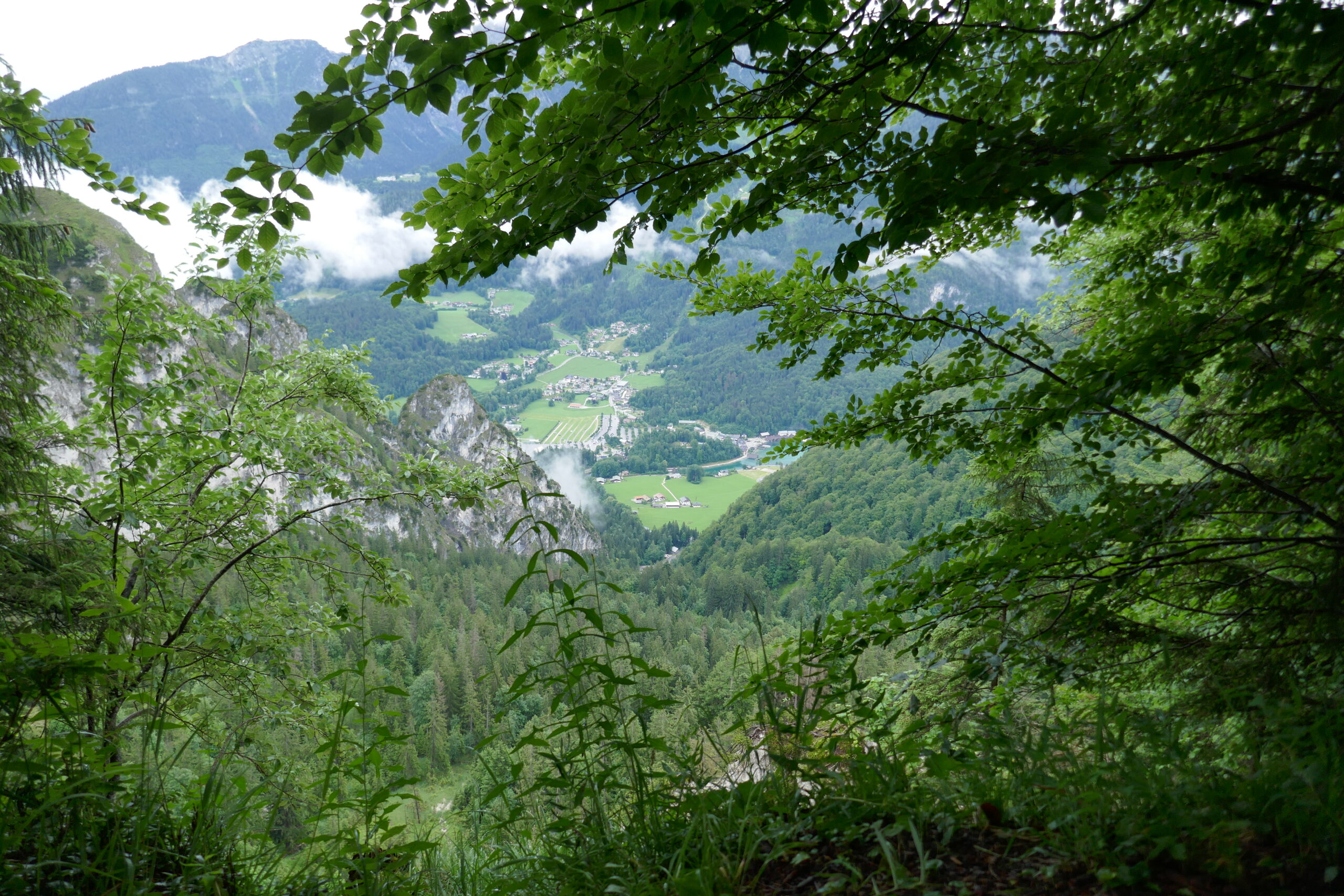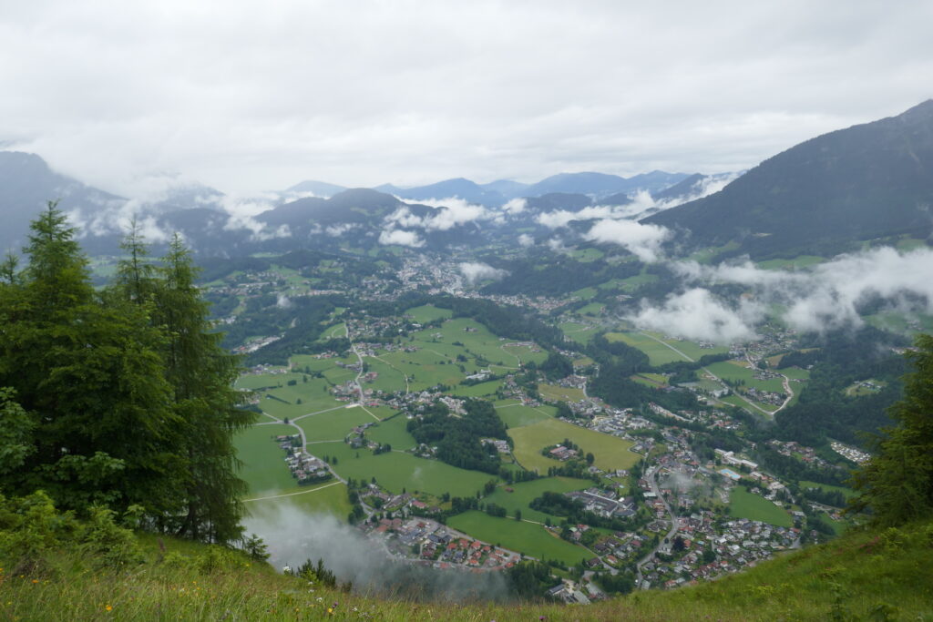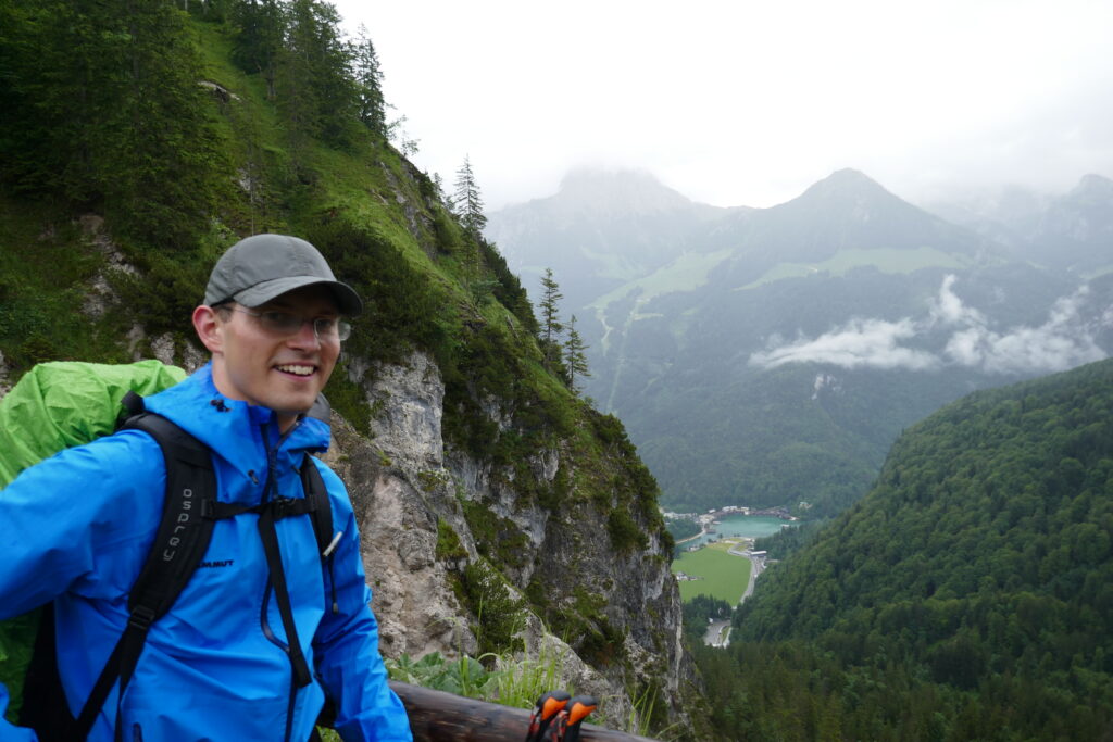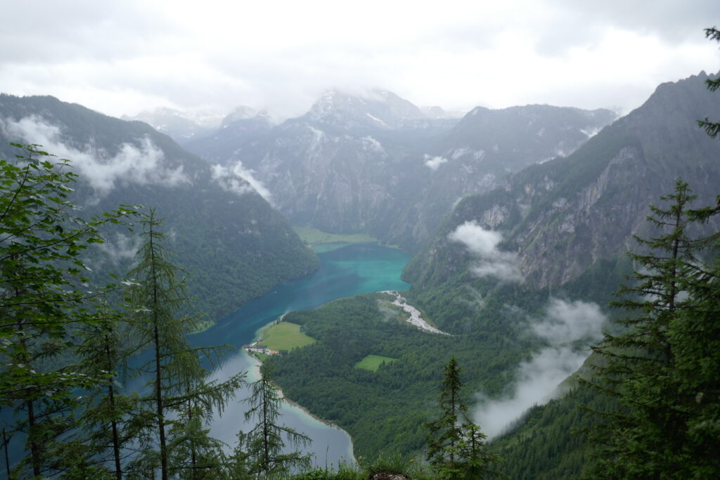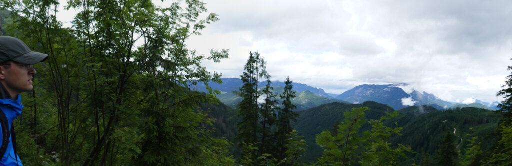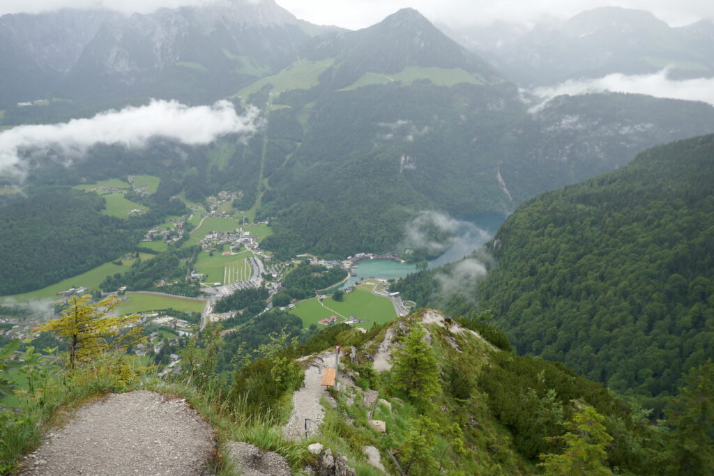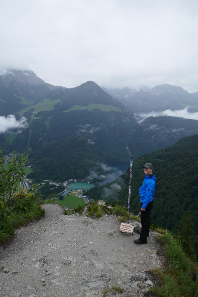 Vom Grünsteingipfel sind wir auf einem sehr schönen Waldwanderweg über Wurzeln und weichen Boden und später eine geschotterte Forststraße zur Archenkanzel (1346 m) gelaufen. Wir hatten Angst in eine Wolke zu gucken, denn es regnete immer noch, aber wir wurden mit einem atemberaubenden Ausblick auf den Königssee belohnt.