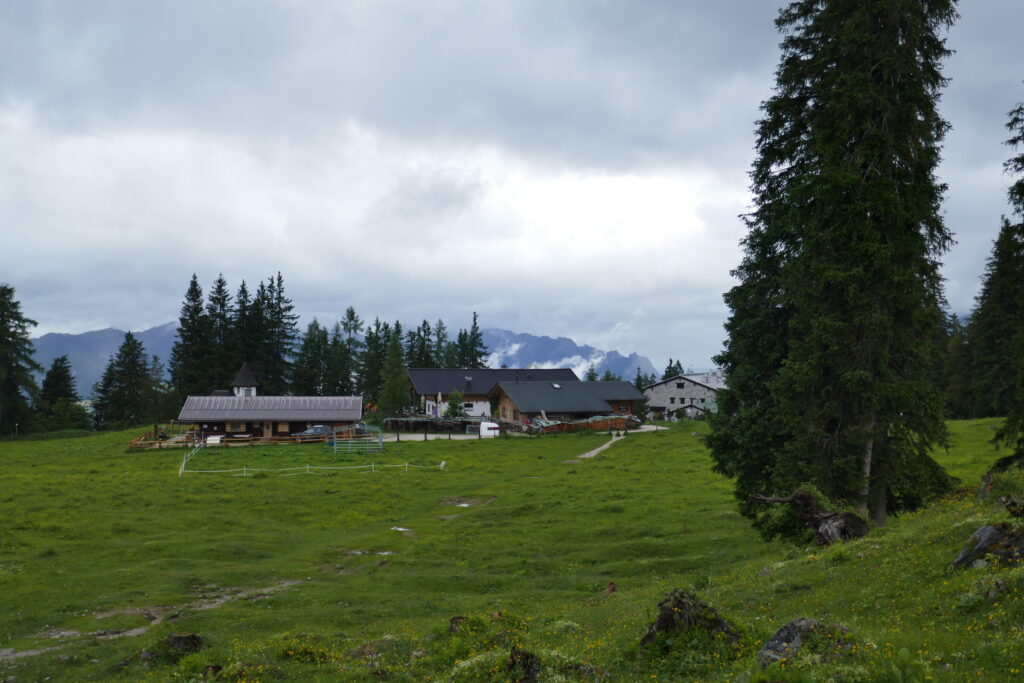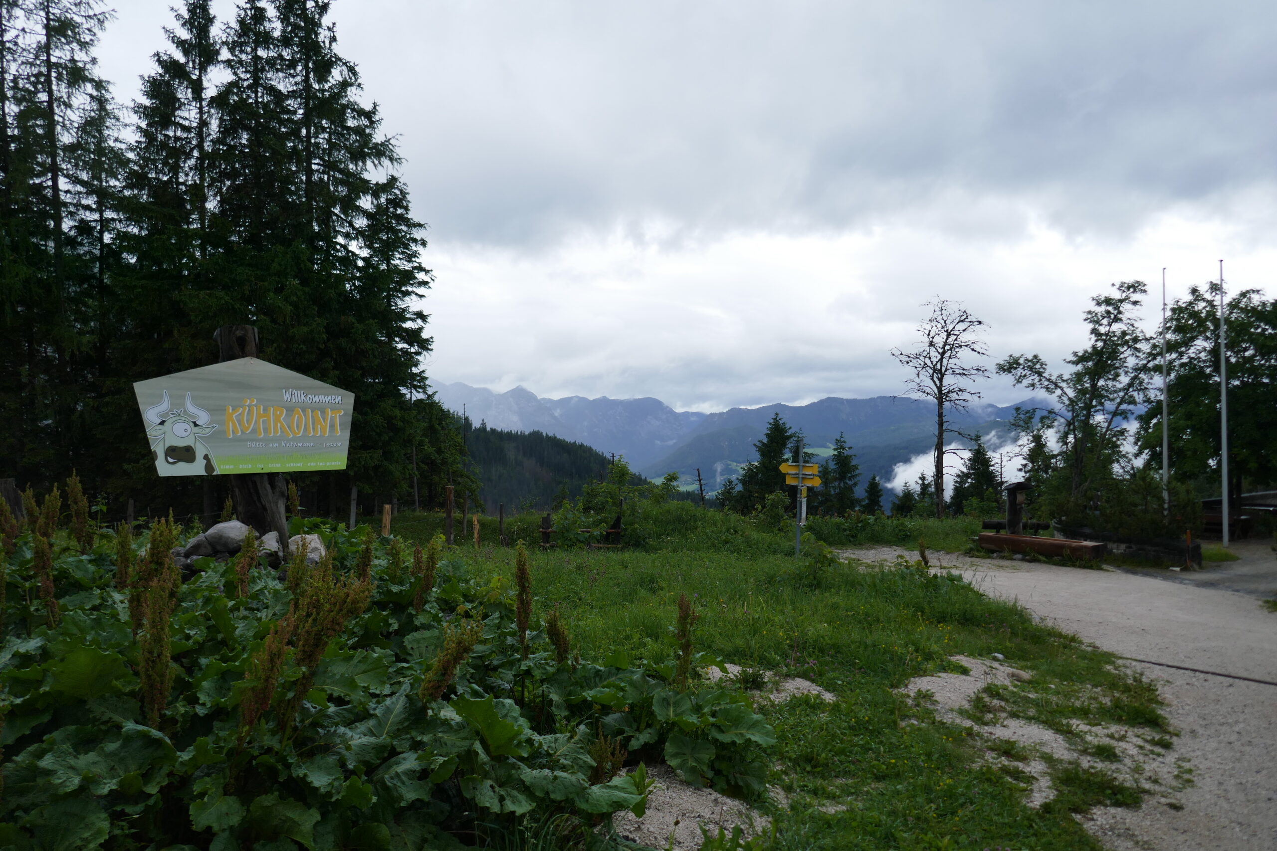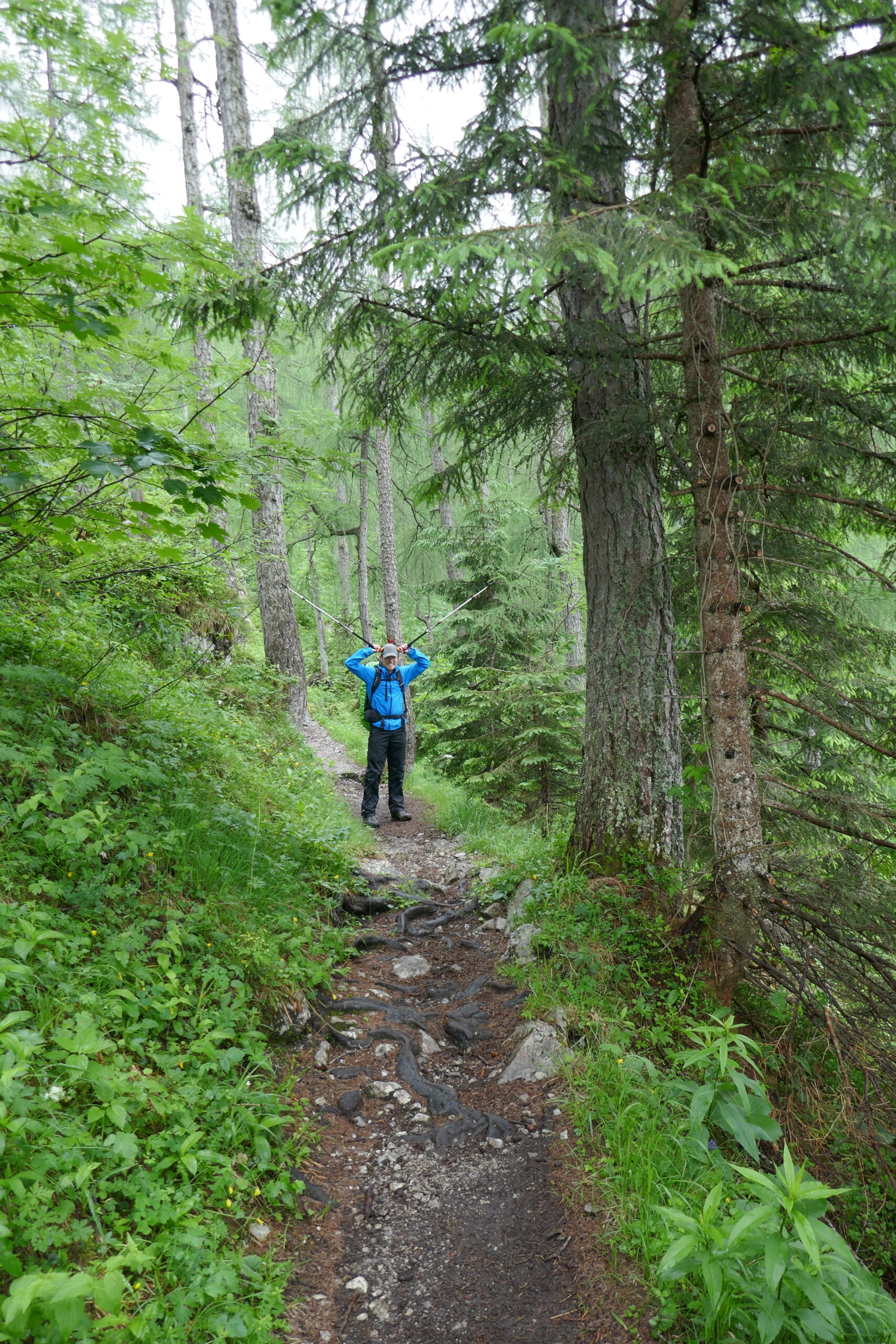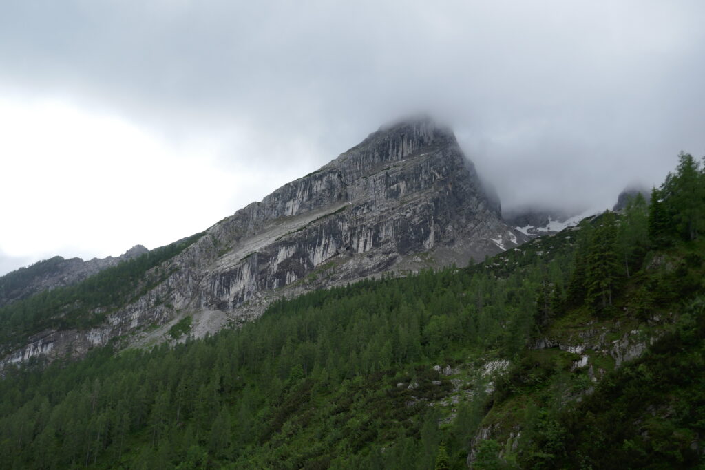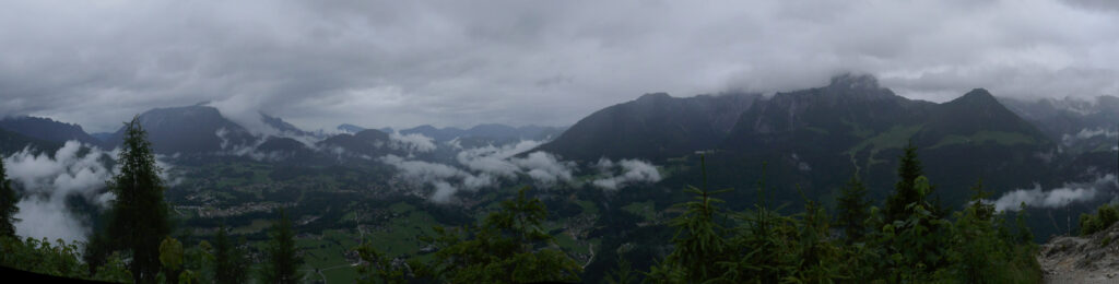 Vom Grünsteingipfel sind wir auf einem sehr schönen Waldwanderweg über Wurzeln und weichen Boden und später eine geschotterte Forststraße zur Archenkanzel (1346 m) gelaufen. Wir hatten Angst in eine Wolke zu gucken, denn es regnete immer noch, aber wir wurden mit einem atemberaubenden Ausblick auf den Königssee belohnt.