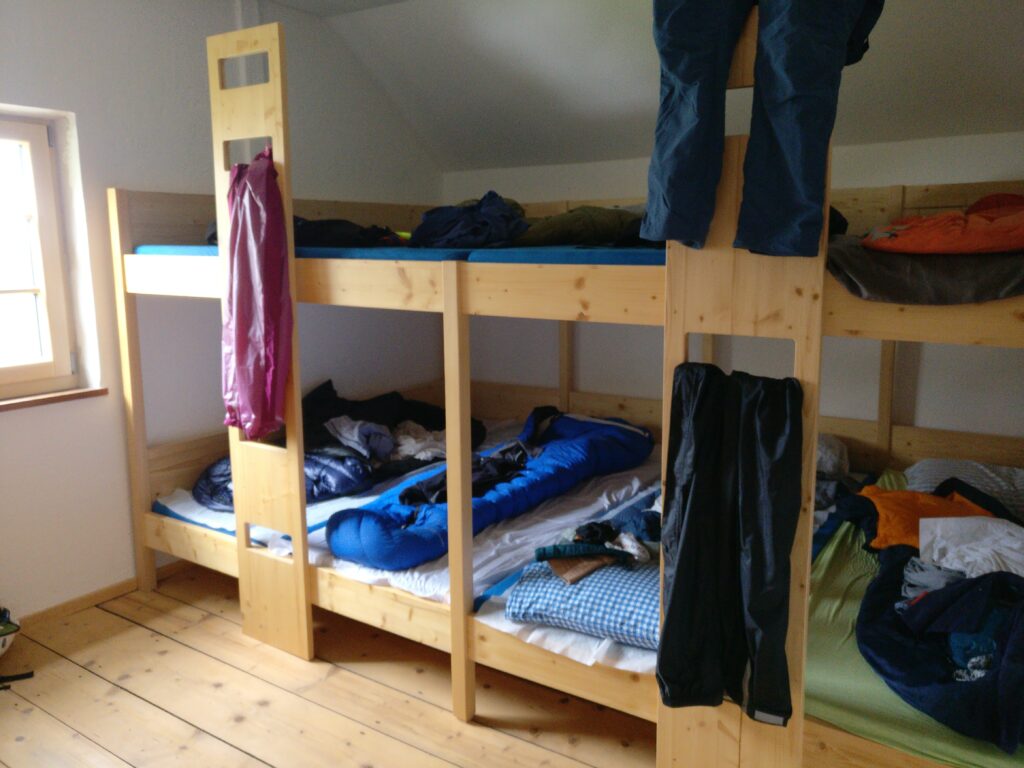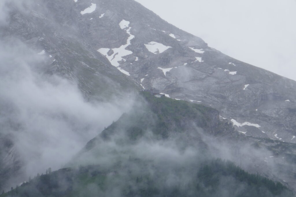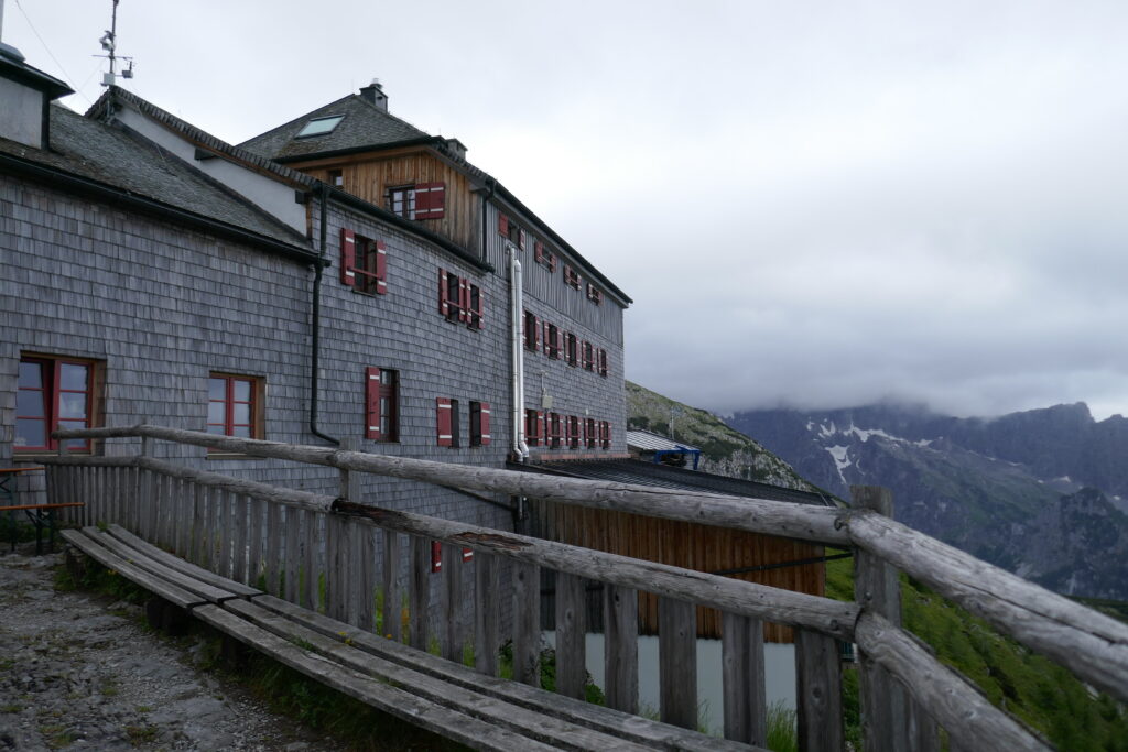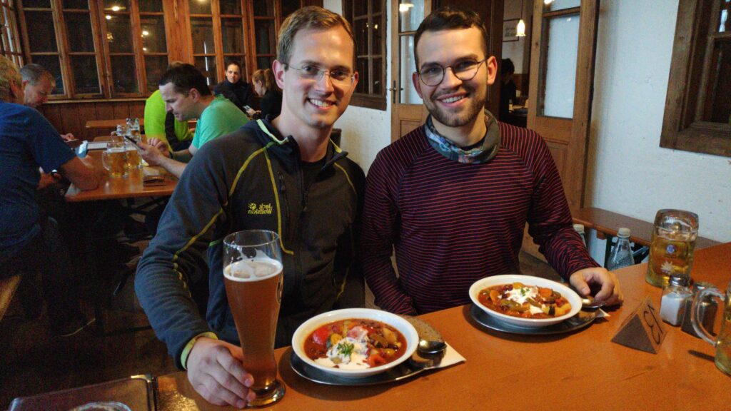Nach einer heißen Schokolade wurde eingecheckt und wir trafen Steffi und Steffi (die Frauen die morgens das Foto gemacht hatten) wieder. Wir hatten einen schönen Abend, haben Bergsteigeressen und Radler genossen und Arschloch mit den Mädels gespielt. Leider hat es angefangen zu regnen und der Hüttenwirt meinte, „über 2500 m schneits jetzt!“ Damit war die Watzmann-Überquerung geplatzt, die wir eigentlich für den nächsten Tag vorgesehen hatten.