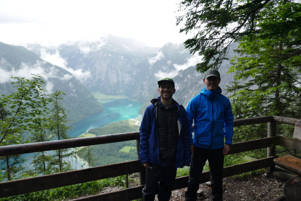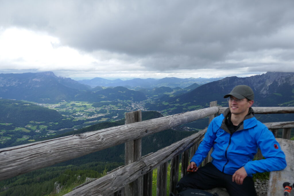 Am Königssee (600 m) haben noch zwei nette Frauen ein Foto von uns gemacht. Dann ging es entlang der Bobbahn hinauf zum Grünsteingipfel (1304 m). Wir kamen ordentlich ins schwitzen aber der Weg wurde nach einiger Zeit klein, schön und kurvig. Der sagenhafte Ausblick hat uns definitiv für die Höhenmeter belohnt. Man kann auch auf einem Klettersteig da hoch, aber dazu braucht man wirklich ein Klettersteigset, was wir nicht dabei hatten.