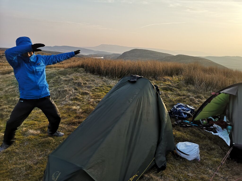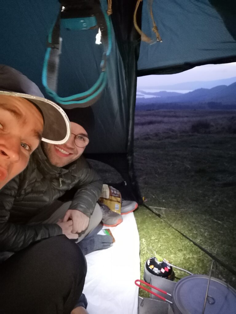 Schlussendlich haben wir eine schöne Stelle zum Zelten gefunden. Wir waren gerade dabei unsere Zelte aufzubauen als ich eine regnende Regenwolke entdeckt habe, die in unsere Richtung zog. Dann haben wir uns beeilt. Abendessen wurde in Pauls offenem Außenzelt gekocht, wir waren sehr froh über den Regenschutz, auch wenn es nur getröpfelt hat. Die Nacht war entspannt, es gab schöne Sterne zu sehen und wir haben gut geschlafen.