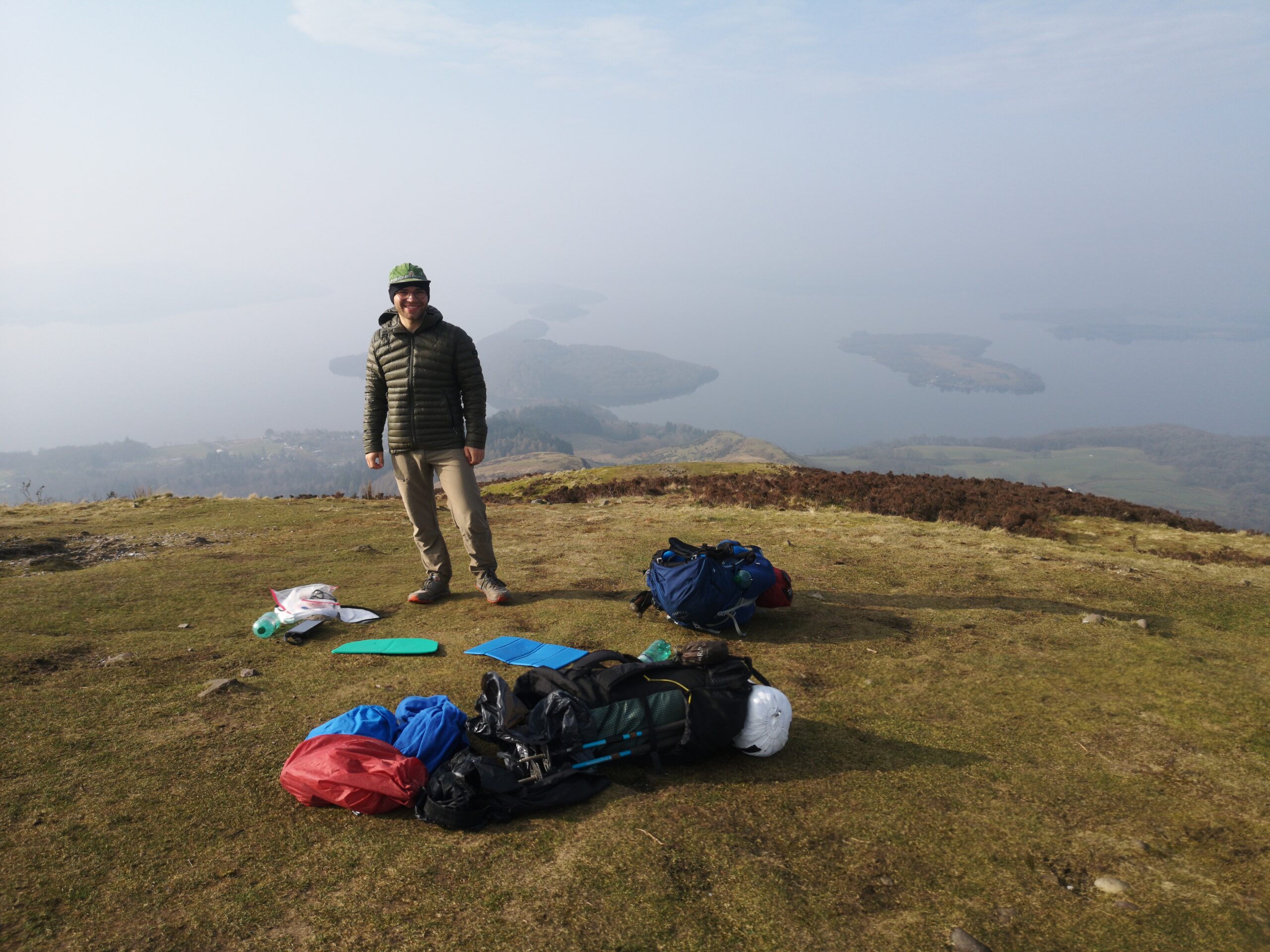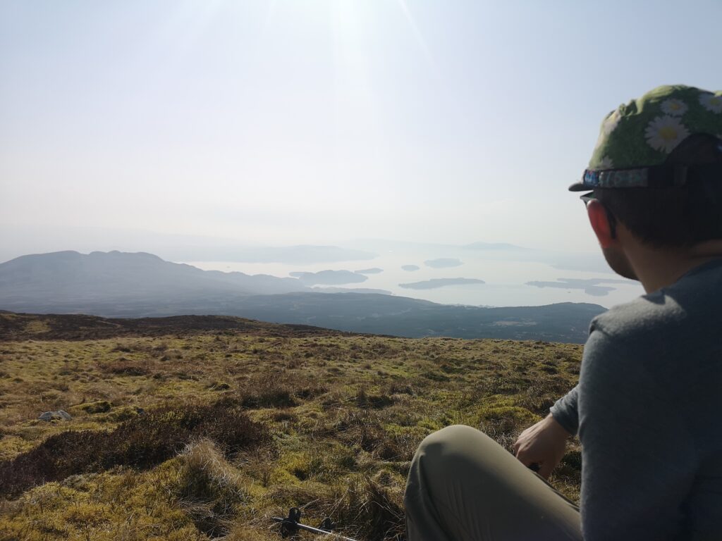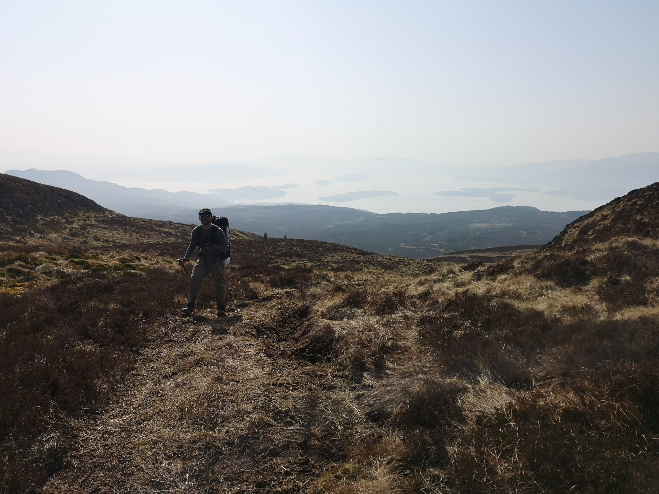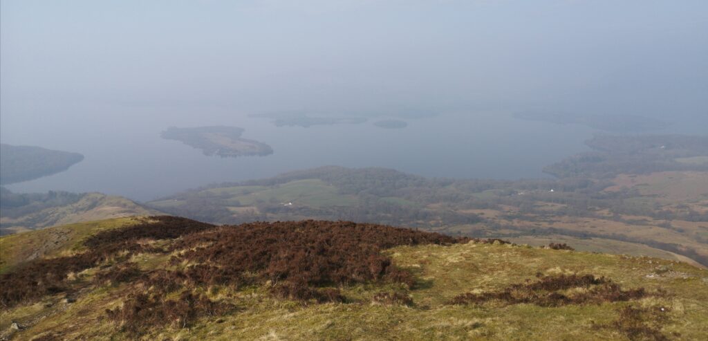 Auf dem nächsten Gipfel machen wir Mittagspause mit Powernap. Die Querung war doch anstrengender als erwartet. Die Aussicht ist toll, am Horizont sind in Dunst gehüllte Berge zu erahnen und im Vordergrund liegt Loch Lomond. Das alles bei strahlendem Sonnenschein, kurzer Hose und einem Nutellabrötchen – ich kann mein Glück kaum glauben. Schottland hatte ich mir so ganz anders vorgestellt. In einem Wort: Regen. Selbst dem guten Wetterbericht hatte ich nicht so wirklich getraut.